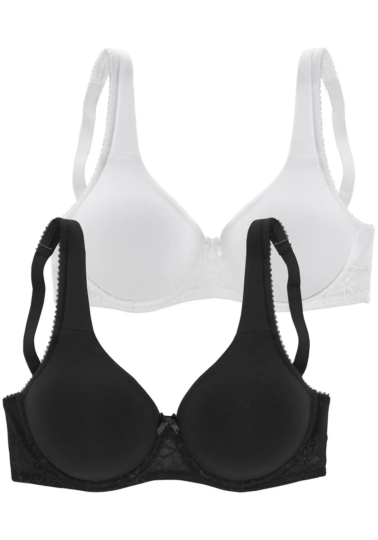 Schöner T-Shirt BH von Nuance im günstigen 2er-Pack mit hübscher Jacquardspitze am Steg. Nahtlos vorgeformte ungefütterte Cups ohne Schale für ein angenehmes Tragegefühl. Eingearbeitete Bügel stützen die Brust sanft. Ideal unter enger Kleidung ohne störende Nähte. Träger und Rückenverschluss verstellbar. Aus 85% Baumwolle, 10% Polyamid, 5% Elasthan. BHs sind nicht trocknergeeignet, da die Versteller und Ringe durch die Hitze beschädigt werden und brechen.