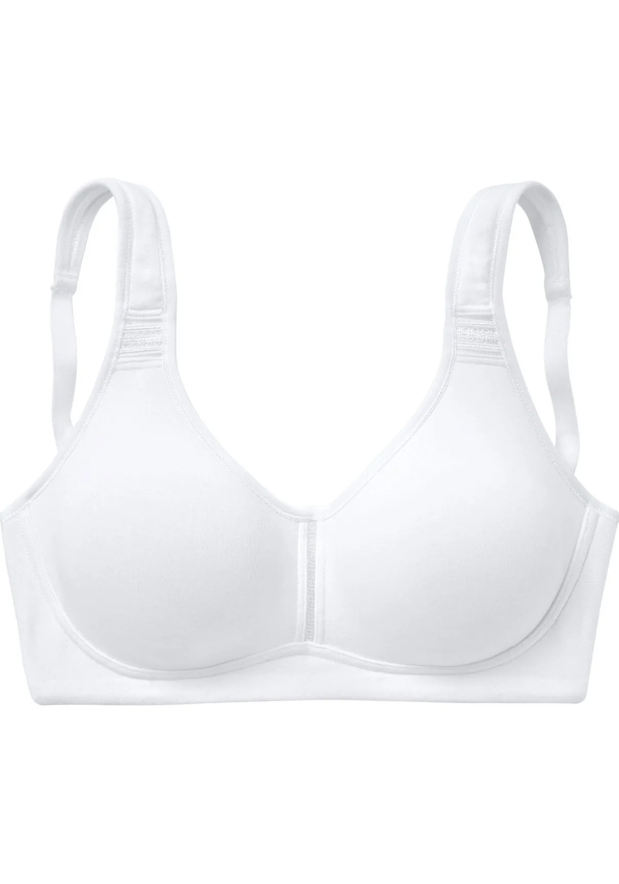 BH ohne Bügel von Petite Fleur im praktischen 2er-Pack. Nahtlos vorgeformte, unwattierte Cups. Breite, wattierte Träger für einen guten Halt. Träger und Rückenverschluss verstellbar. Aus 95% Baumwolle, 5% Elasthan. BHs sind nicht trocknergeeignet, da die Versteller und Ringe durch die Hitze beschädigt werden und brechen.