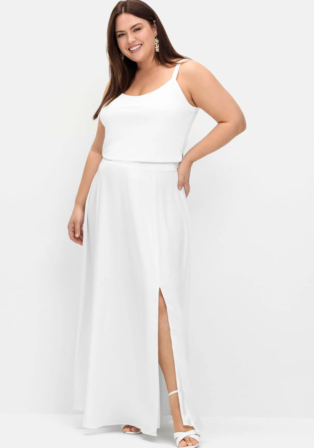 Spaghettitop in edler Optik. Der tiefe Rundhalsausschnitt und Armlöcher erhalten durch den Besatz in feiner Satinoptik dezente Eleganz. Auch die schmalen Träger sind in schimmernder Optik gearbeitet. Durch die doppelte Lage wird das Top angenehm blickdicht. Es lässt sich ideal auch zu festlichen Outfits tragen und passt in der Farbe Offwhite perfekt zu unseren Hochzeits-Kombinationen.