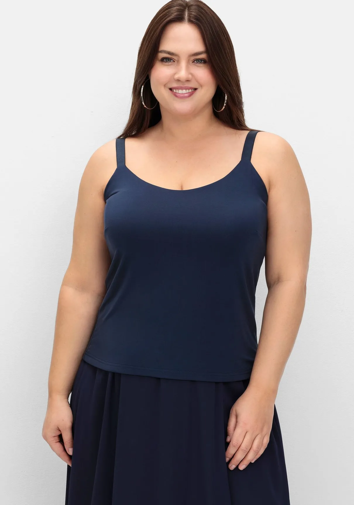 Das Oberteil schmiegt sich sanft an den Körper an und trägt durch die doppellagige Verarbeitung nicht auf. Brustabnäher und verstellbare Träger sorgen für eine optimale Passform.