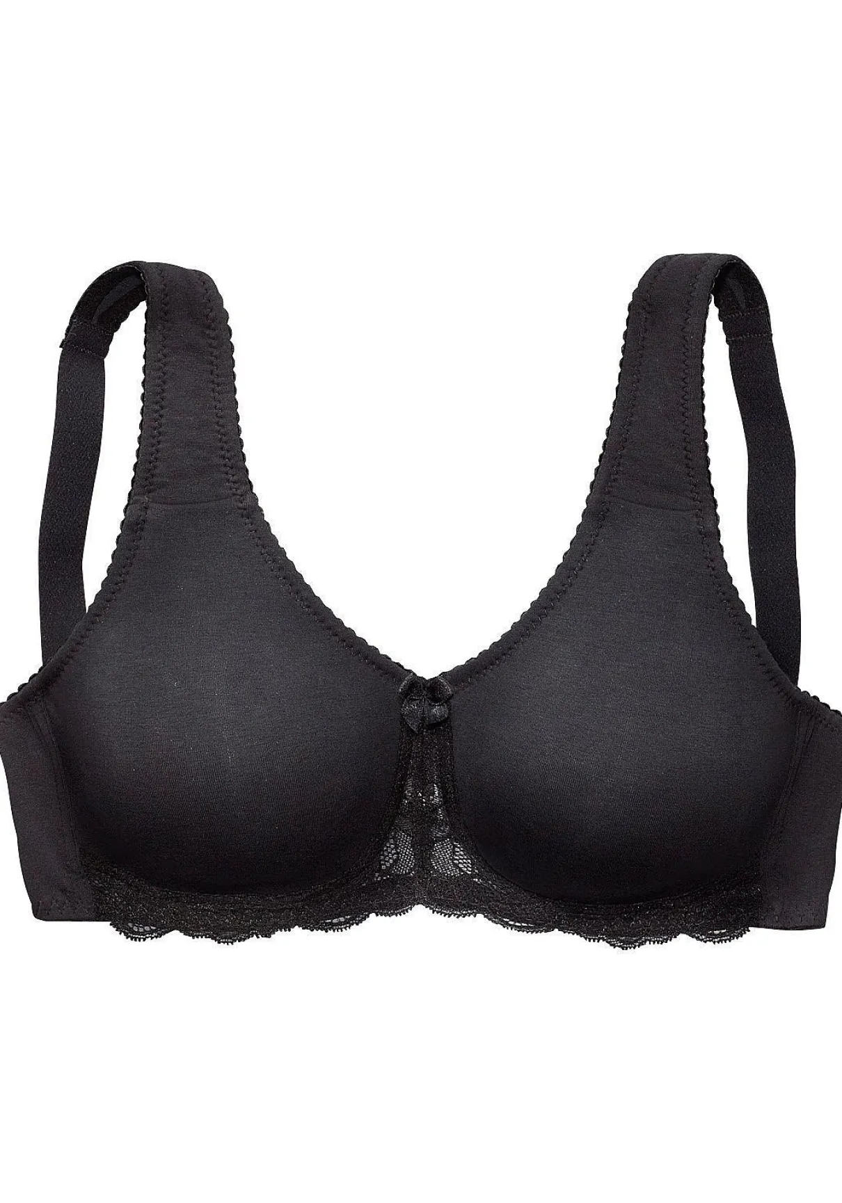 Schöner Entlastungs-BH ohne Bügel aus einer Mix & Match-Serie von NUANCE aus softer Baumwolle mit hübscher Jacquardspitze. Alles miteinander kombinierbar. Extra breite, entlastende Träger für einen hohen Tragekomfort. Flache Jacquard – spitze unterm Cup (ohne Wattierung) und in der vorderen Mitte. Hoch geschnittenes Rückenteil für einen guten Halt auch ohne Bügel. Träger und Rückenverschluss verstellbar. Aus 85% Baumwolle, 10% Polyamid, 5% Elasthan. BHs sind nicht trocknergeeignet, da die Versteller und Ringe durch die Hitze beschädigt werden und brechen.