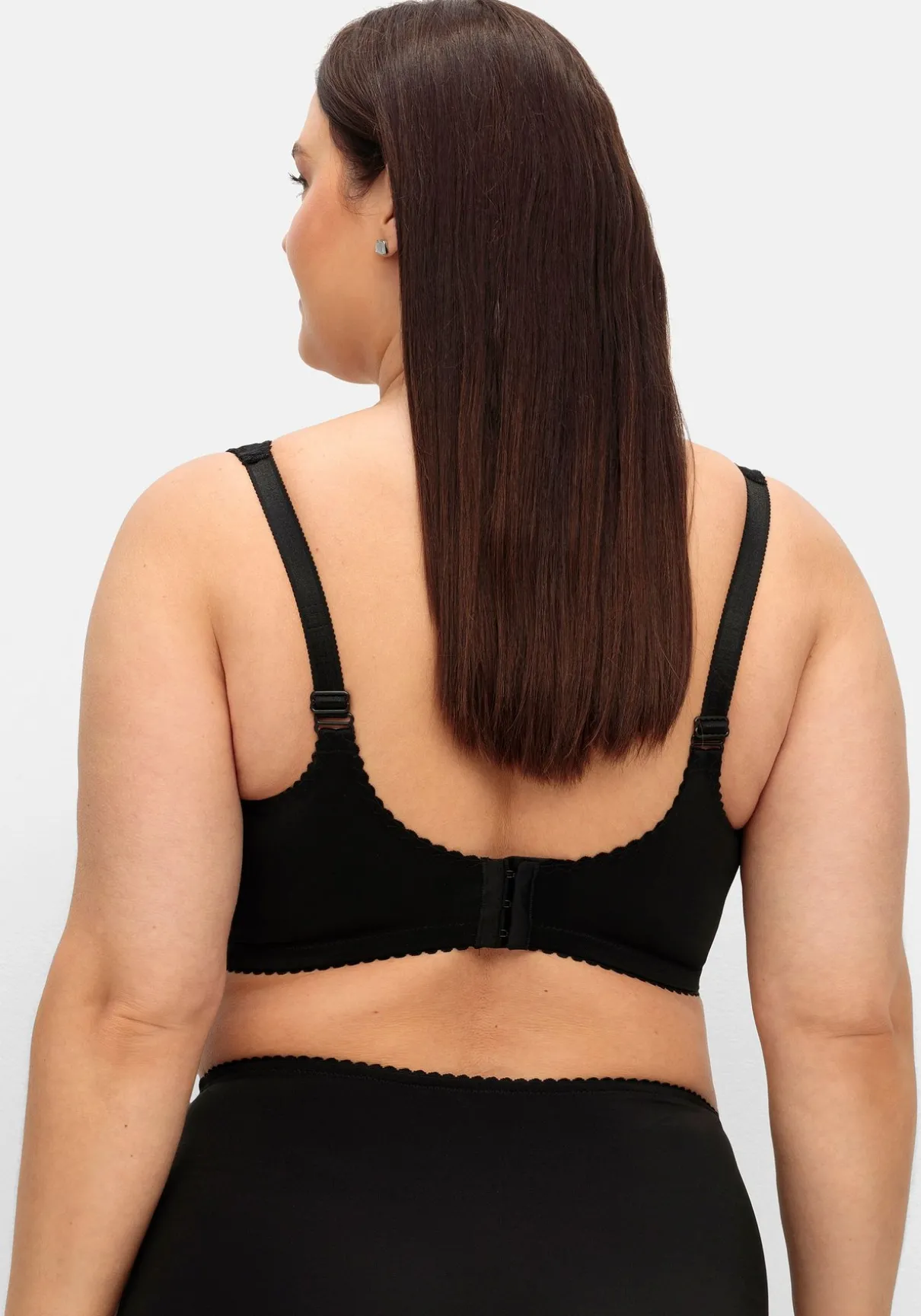Entlastungs-BH ohne Bügel. Durch die transparente Spitze erhält der BH femininen Appeal, die mit Mesh unterlegten Cups machen den Look blickdicht. Auch die Träger sind aus zarter Spitze gearbeitet. Dazu überzeugt der bügellose BH mit hohem Tragekomfort: Die Cups decken die Brust komplett ab, die breiten, leicht gefütterten Träger schneiden nicht ein. Zusätzlich stützt und entlastet das breite Unterbrustgummi.