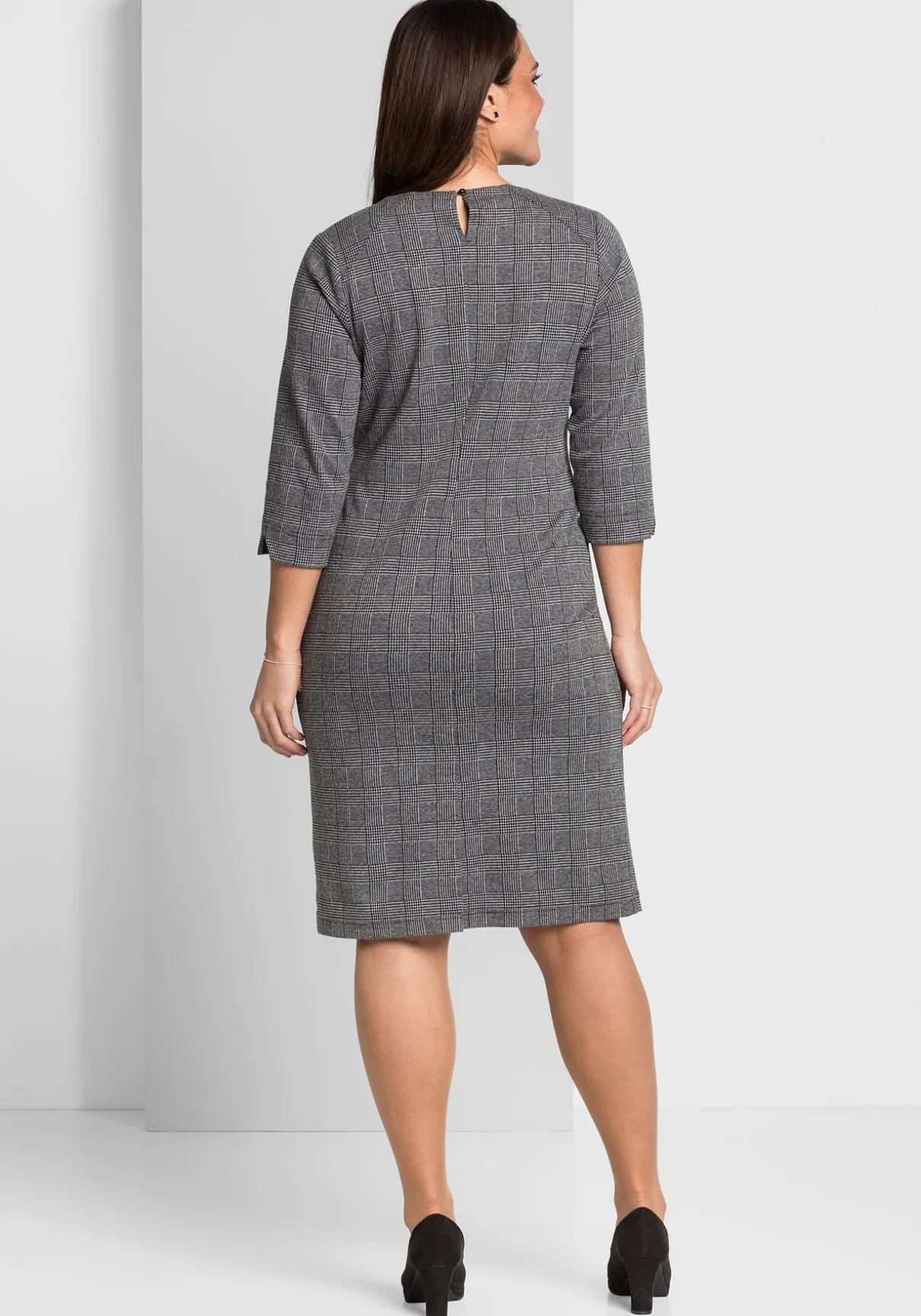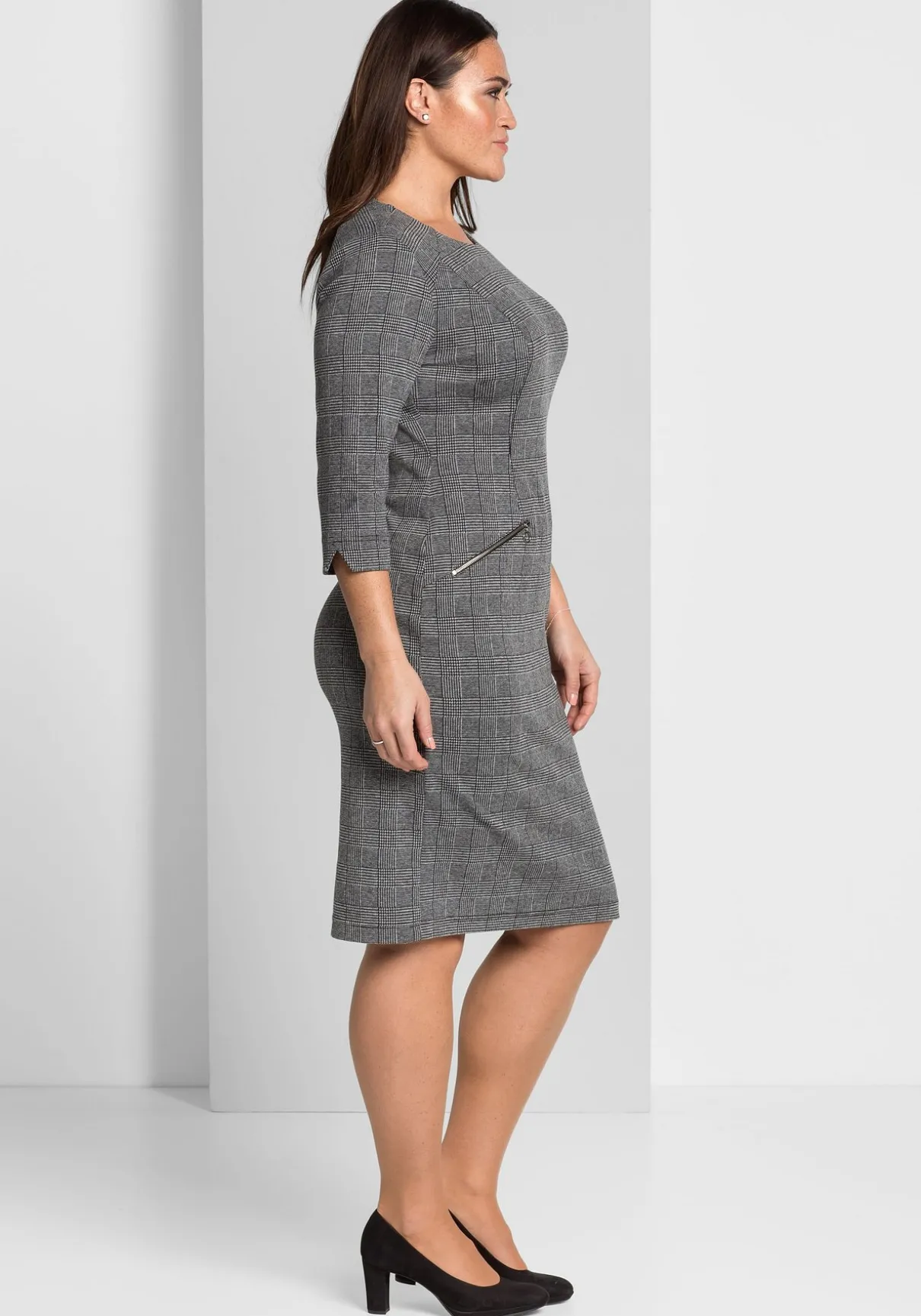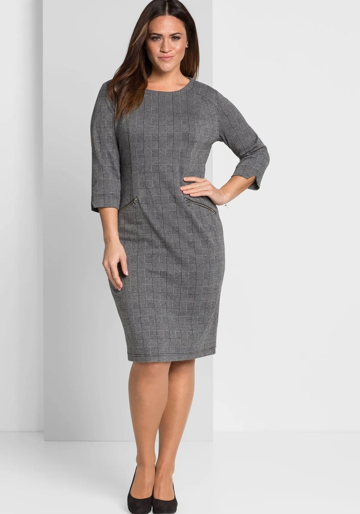 Dieses Etuikleid ist entweder im klassischen Schwarz-Weiß-Karo oder unifarben erhältlich. Beide Varianten eignen sich durch das moderne Design sowohl für Alltags- als auch für Businesslooks. Schräg verlaufende Eingrifftaschen mit dekorativem Reißverschluss sorgen für das gewisse Etwas. Raffiniert wirkt der Cut-Out am Saum des 3/4-langen Arms, ein Knopfverschluss am Rundhalsausschnitt hinten ergänzt den Look.
