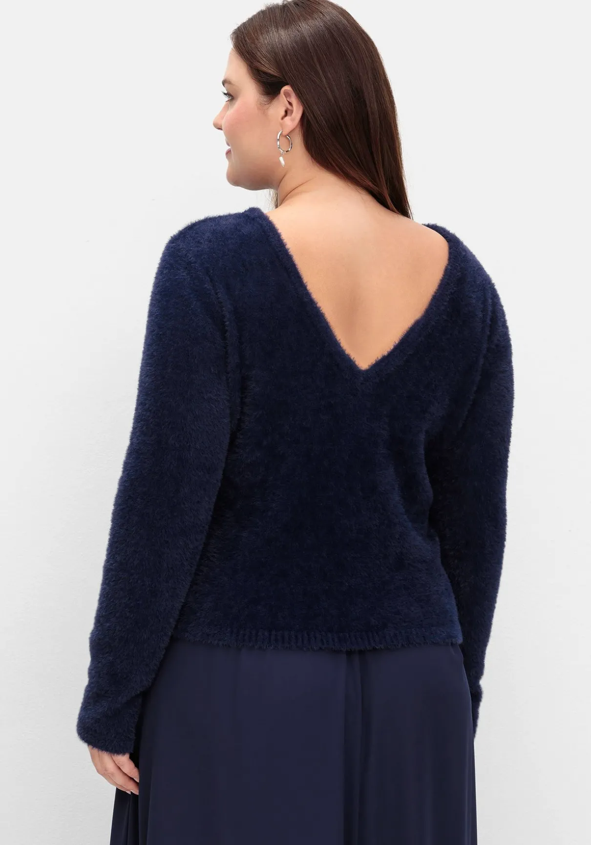 Pullover aus flauschiger Qualität. Vorn ist er mit einem klassischen Rundhalsausschnitt gearbeitet, im Rücken überrascht ein tiefer V-Ausschnitt. So entsteht ein raffinierter Stylingpartner, der perfekt auf unsere festlichen Abendhosen und Maxiröcke abgestimmt ist und in der Farbe Offwhite zu den sheego Hochzeits-Kombinationen passt.