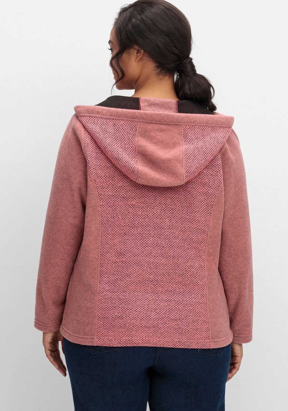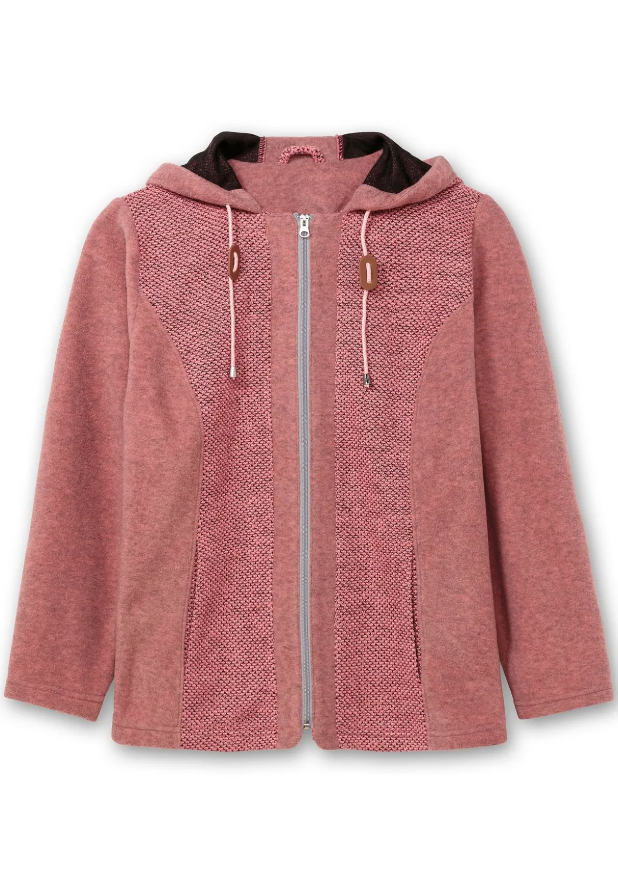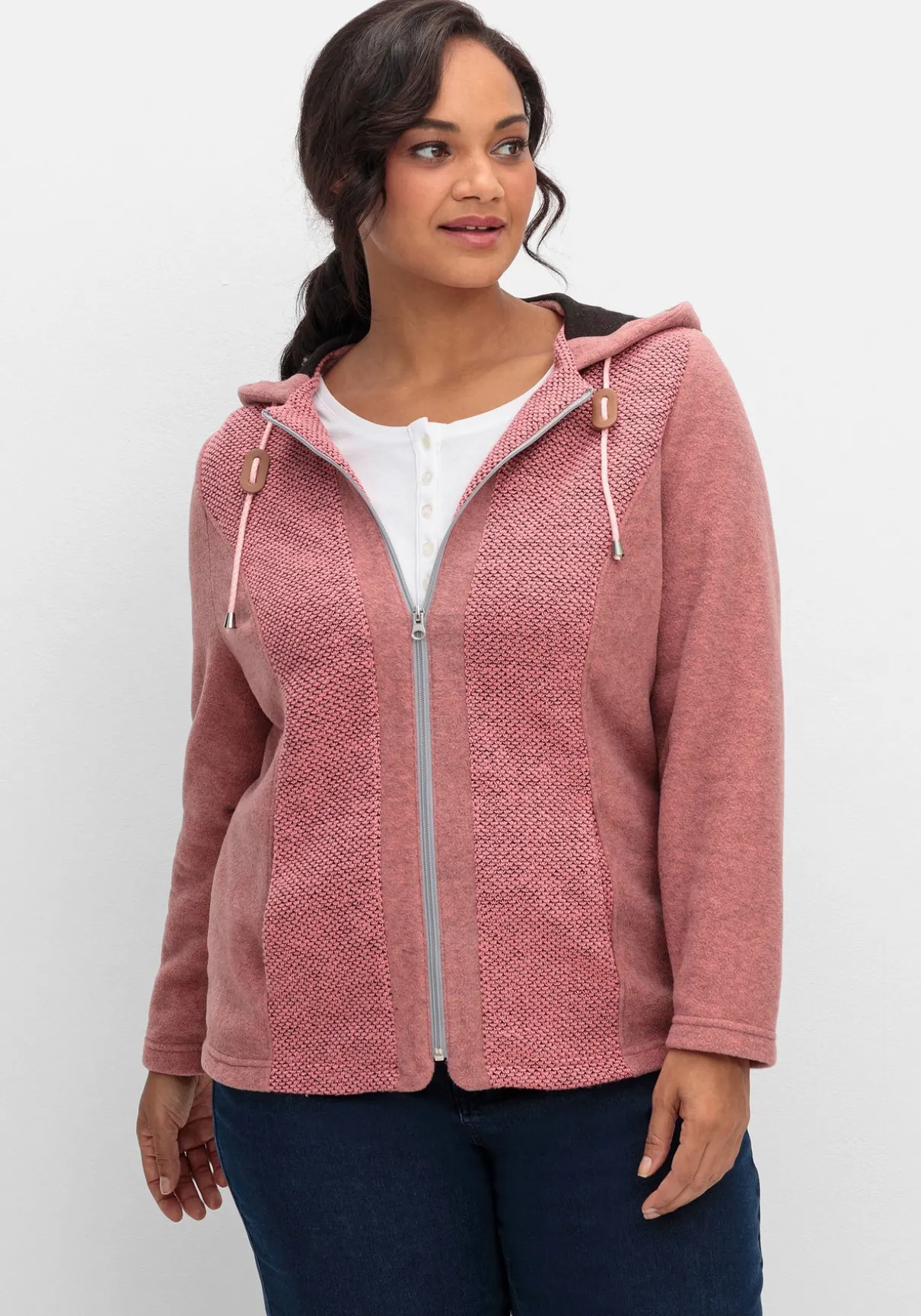 Fleecejacke mit Kapuze. Die kuschelige Qualität wird durch gestrickte Einsätze modisch ergänzt. Eine Kapuze mit Bindeband und dekorativen Ösen, der durchgehende Reißverschluss und seitliche Nahttaschen ergänzen den sportiven Style.