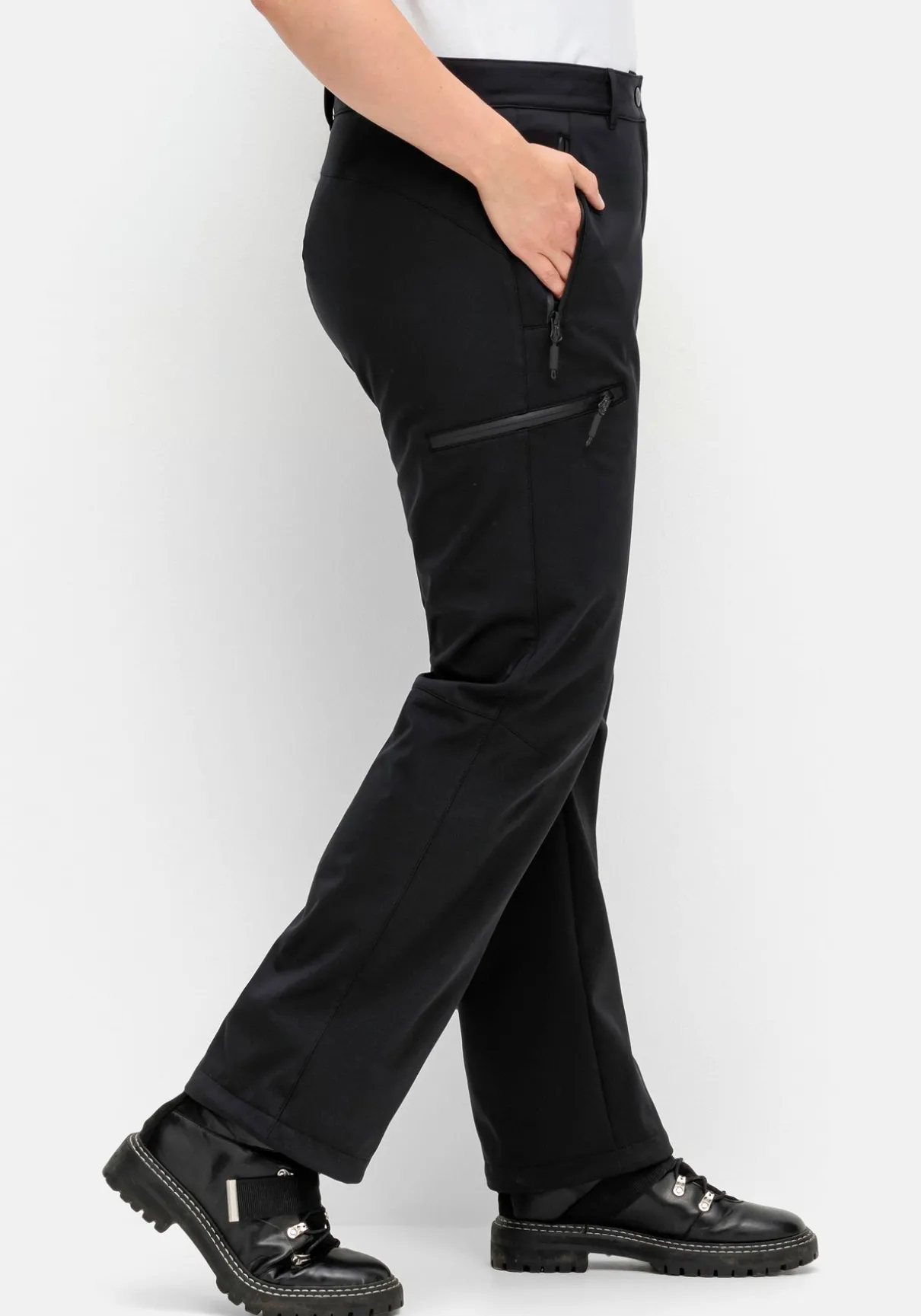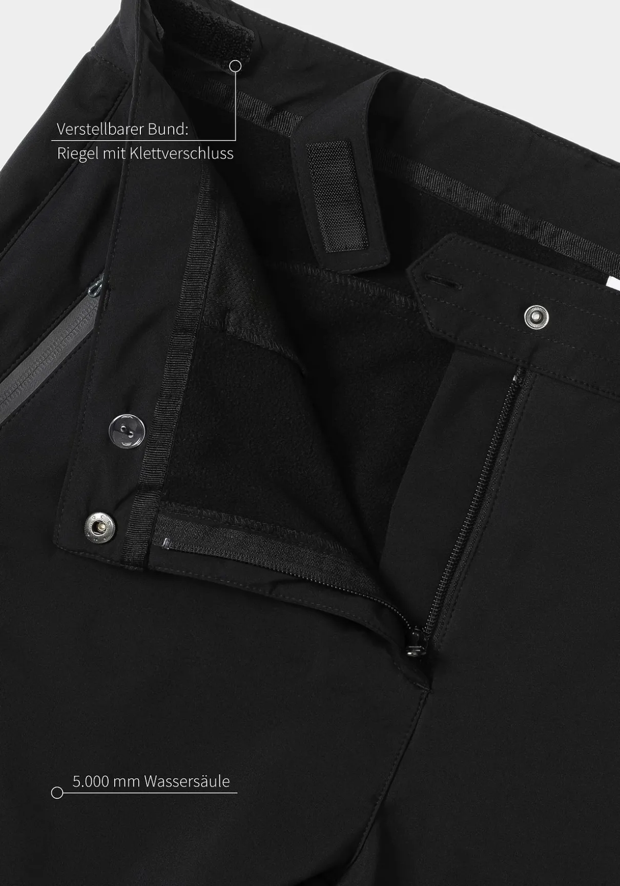 Softshellhose mit Fleecefutter. Die wärmende, wasser- und windabweisende Qualität macht die Hose zum idealen Outdoorbegleiter an kälteren Tagen. Dazu kommen praktische Details wie die drei Reißverschlusstaschen oder der Bund, der mit Gürtelschlaufen versehen ist und mit einem innenliegenden Klettriegel in der Weite verstellt werden kann.