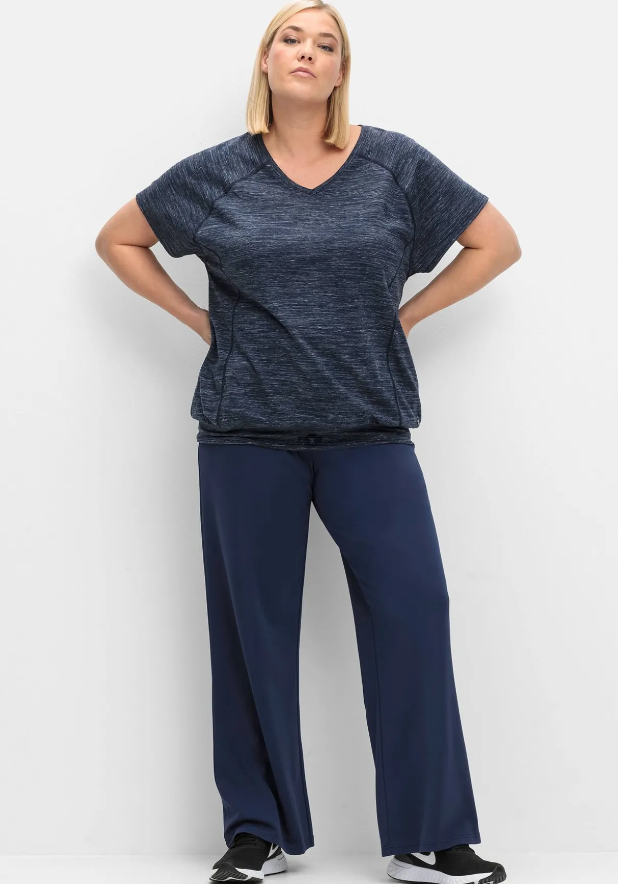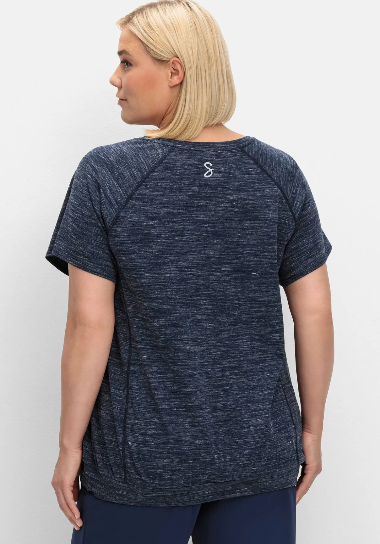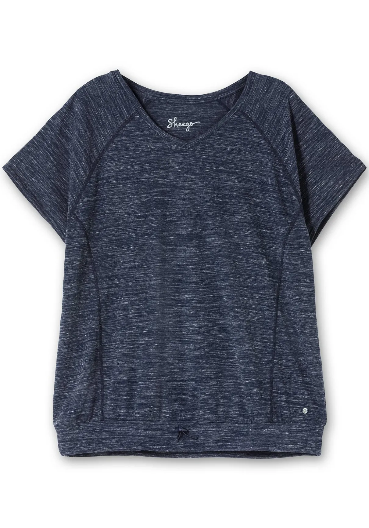 Funktionsshirt in Melange-Optik. Das Bündchen am Saum ist mit Hilfe eines schmalen elastischen Bändchens in der Weite verstellbar. Der sportive V-Ausschnitt erhält durch den kleinen reflektierenden Druck hinten im Nacken ein feminines Finish. Kurze Raglanärmel machen das Sportshirt perfekt.