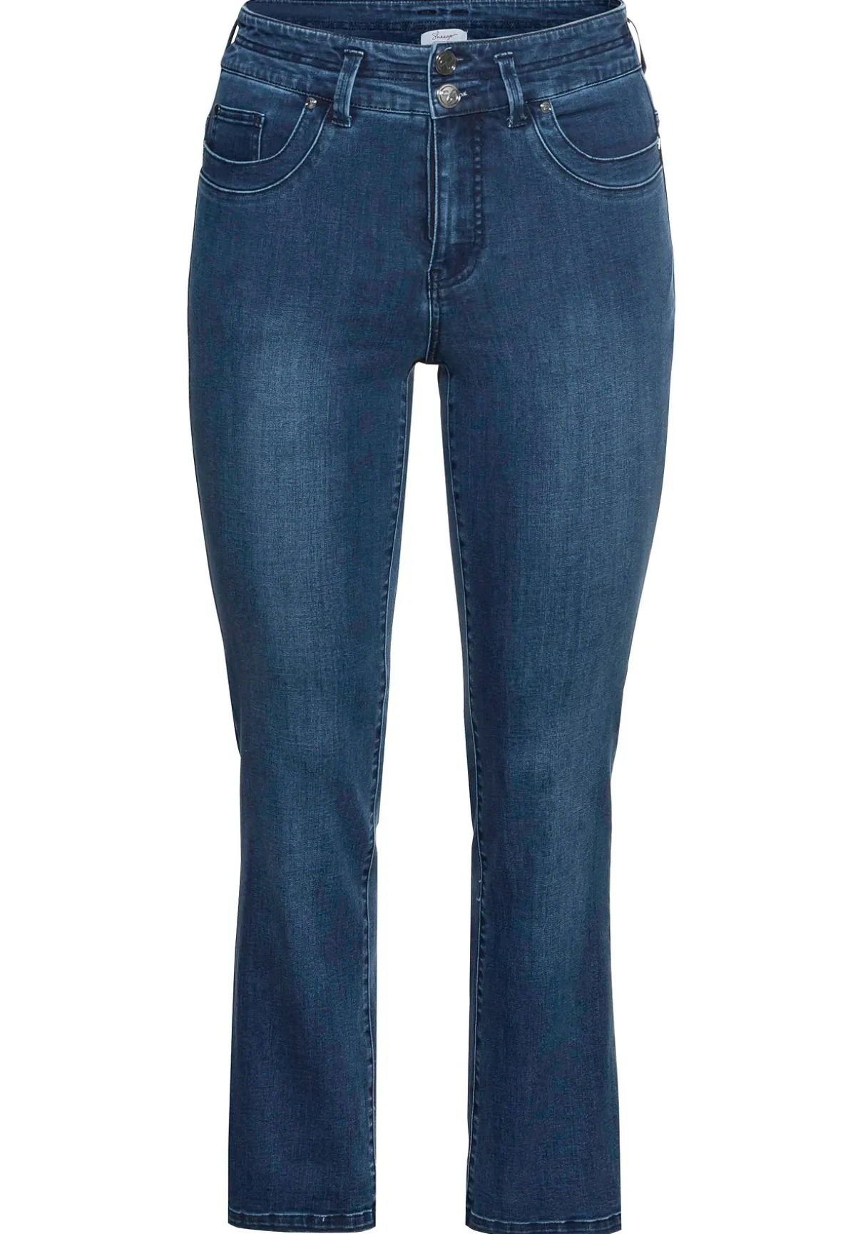 Gerade Jeans in Curvy-Schnitt MANUELA, bei schmalerer Taille und kräftigen Oberschenkeln. Der cleane Look zeigt sich mit Formbund, Gürtelschlaufen, zwei Knöpfen und Reißverschluss. Der Five-Pocket-Stil erhält durch die Stickerei an den Taschen vorn eine verspielte Note. Die individuelle Waschung macht den kombistarken Look perfekt.