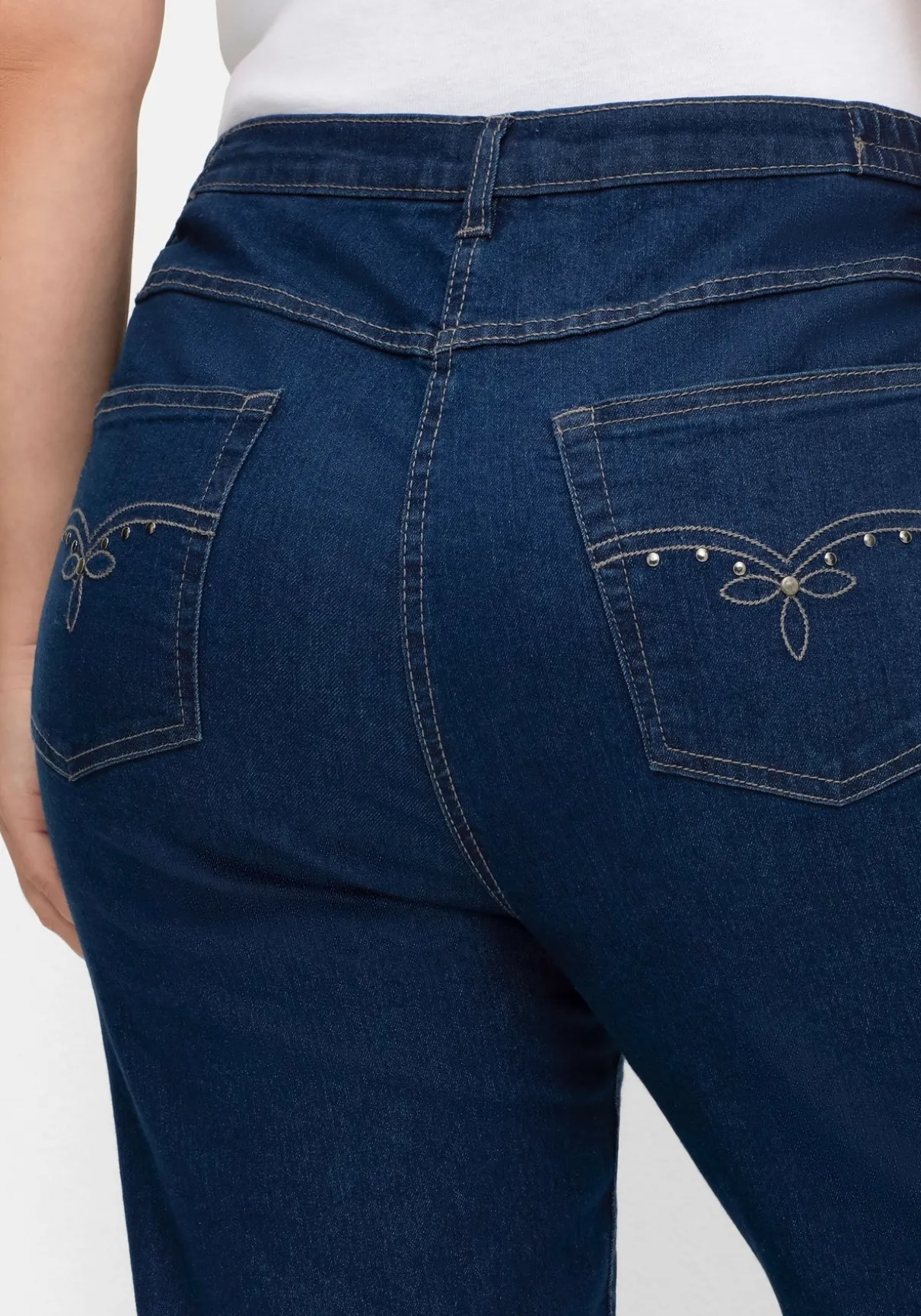 Jeans in gerader Beinform. Der Bund ist mit Gürtelschlaufen, Knopf und Reißverschluss gearbeitet, elastische Einsätze in der Seite lassen die Jeans in der Taille bequem sitzen. Die klassische Five-Pocket-Form besteht aus zwei runden Taschen und einer Münztasche vorn, beide Gesäßtaschen sind mit Stickereien und Deko-Elementen verziert. Der Sattel hinten sorgt für eine gute Passform.