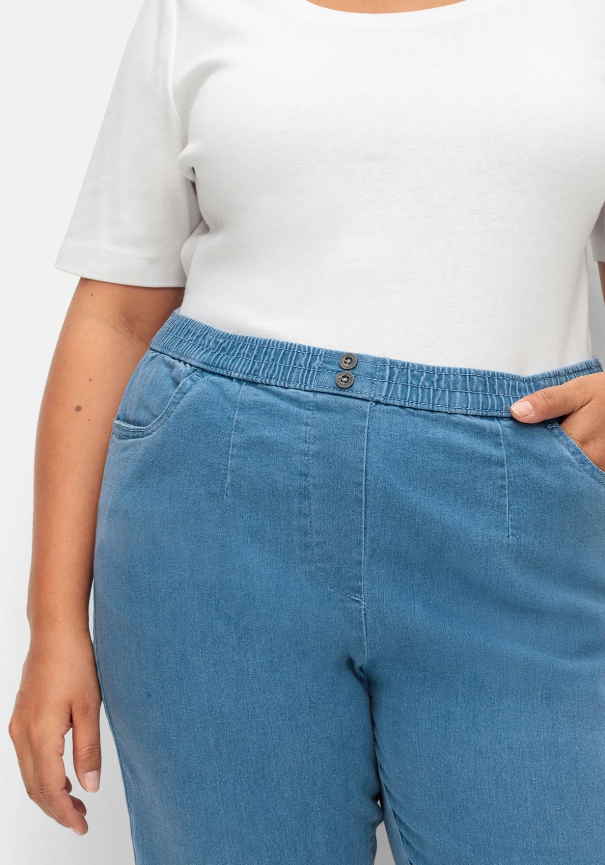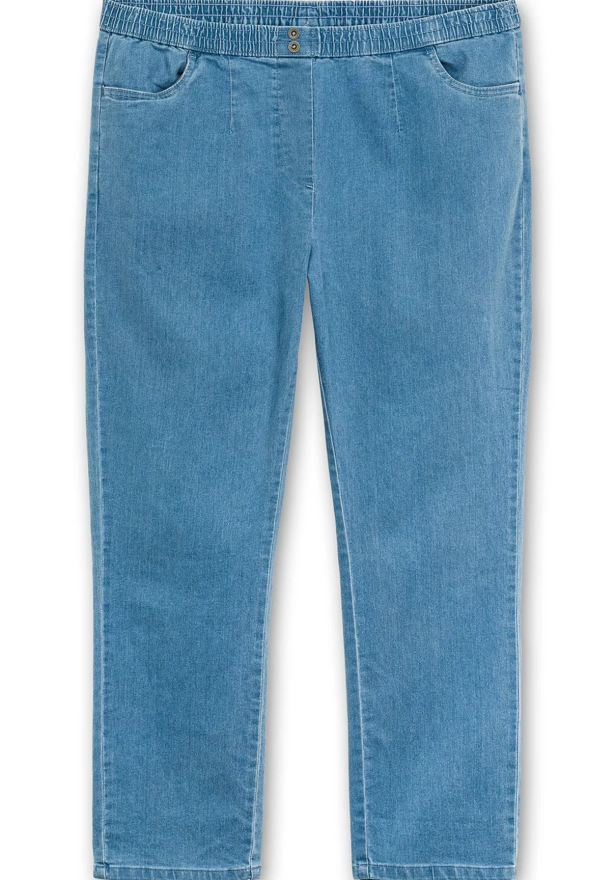 Jeans in bequemer Schlupfform. Herrlich entspannt trägt sich der gesmokte Rundum-Dehnbund, der vorn mit zwei Zierknöpfen besetzt ist. Die imitierte Reißverschlussblende sowie die schmeichelnden Abnäher runden den Look gepflegt ab. Für Modernität sorgen die leichte Waschung und die Used-Nähte.