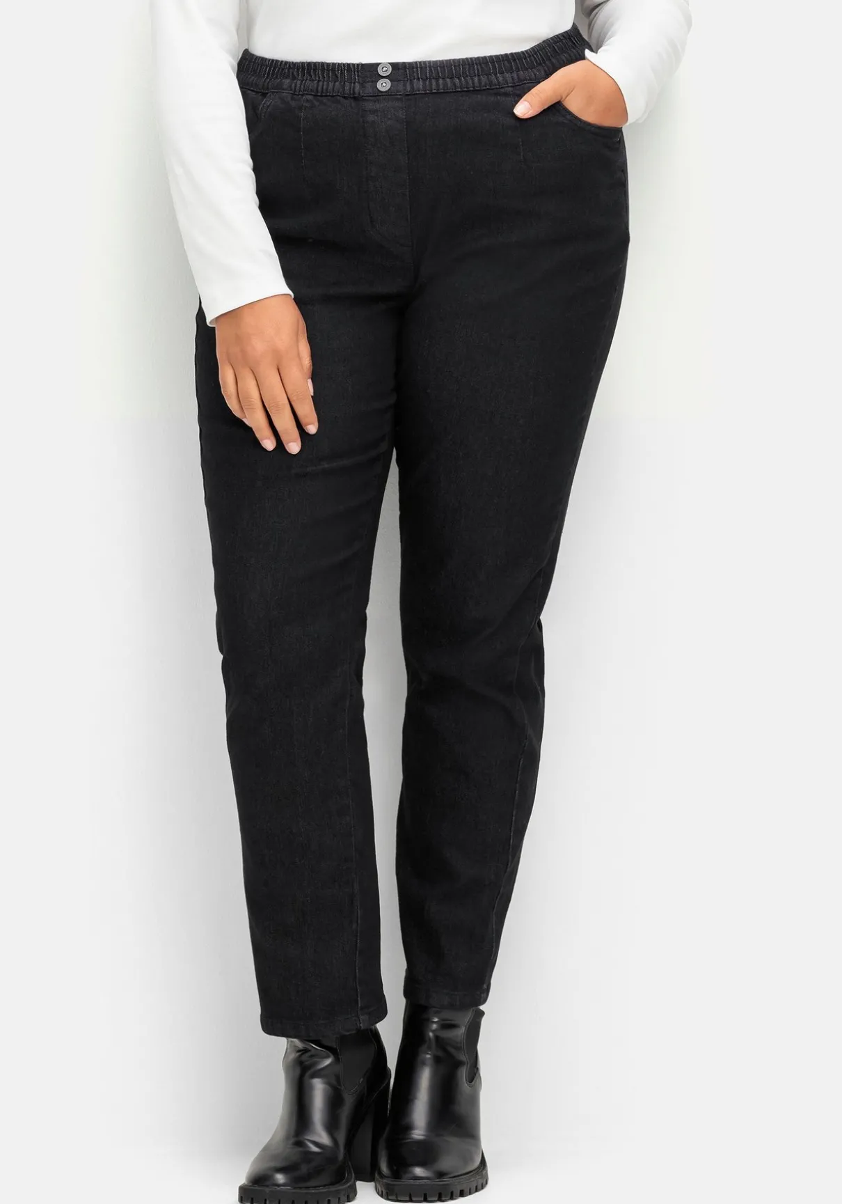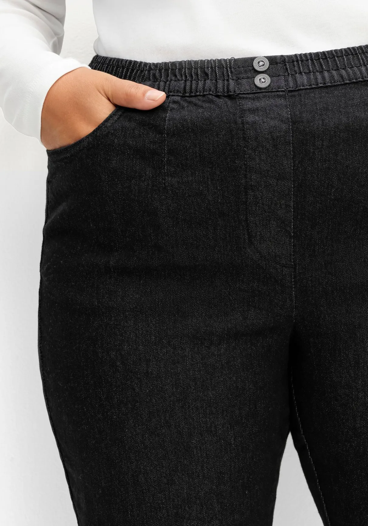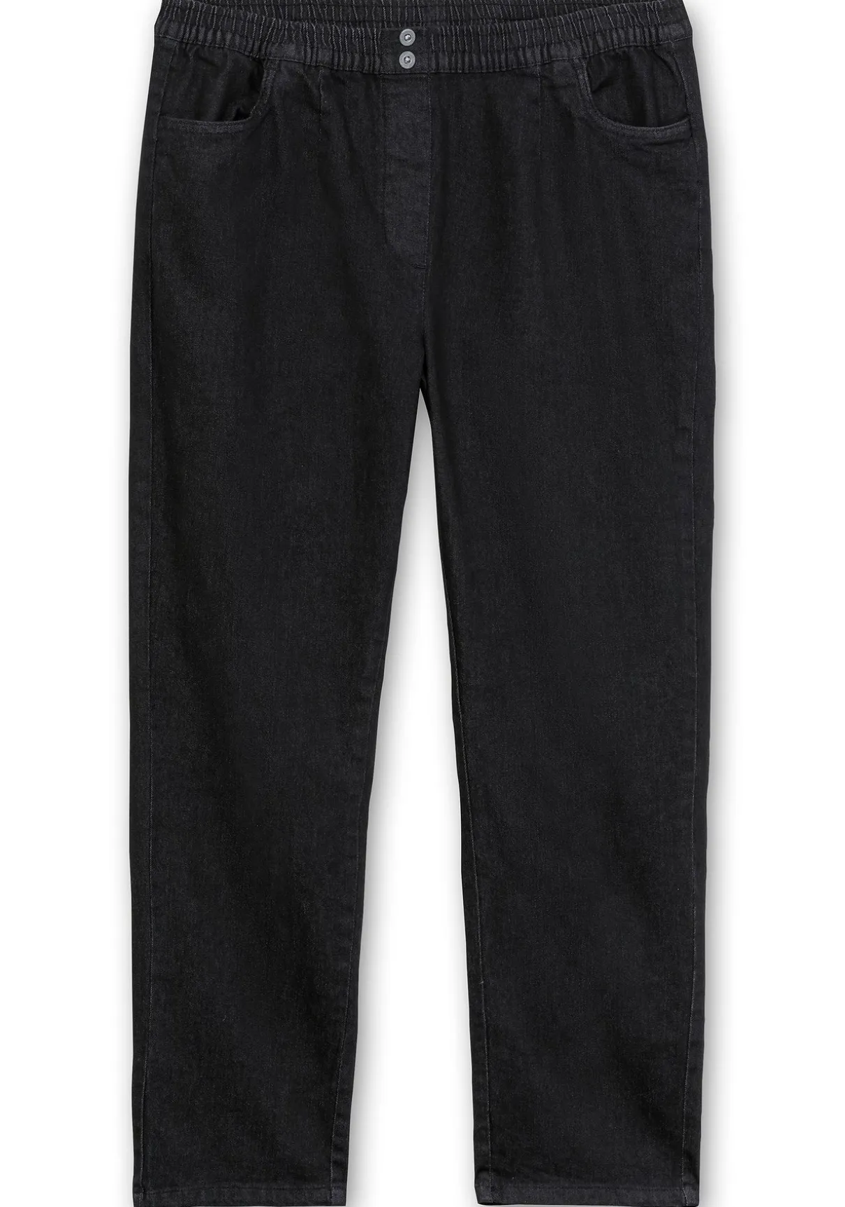 Jeans in bequemer Schlupfform. Herrlich entspannt trägt sich der gesmokte Rundum-Dehnbund, der vorn mit zwei Zierknöpfen besetzt ist. Die imitierte Reißverschlussblende sowie die schmeichelnden Abnäher runden den Look gepflegt ab. Für Modernität sorgen die leichte Waschung und die Used-Nähte.