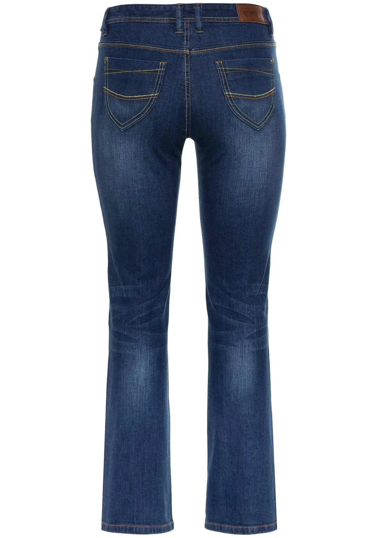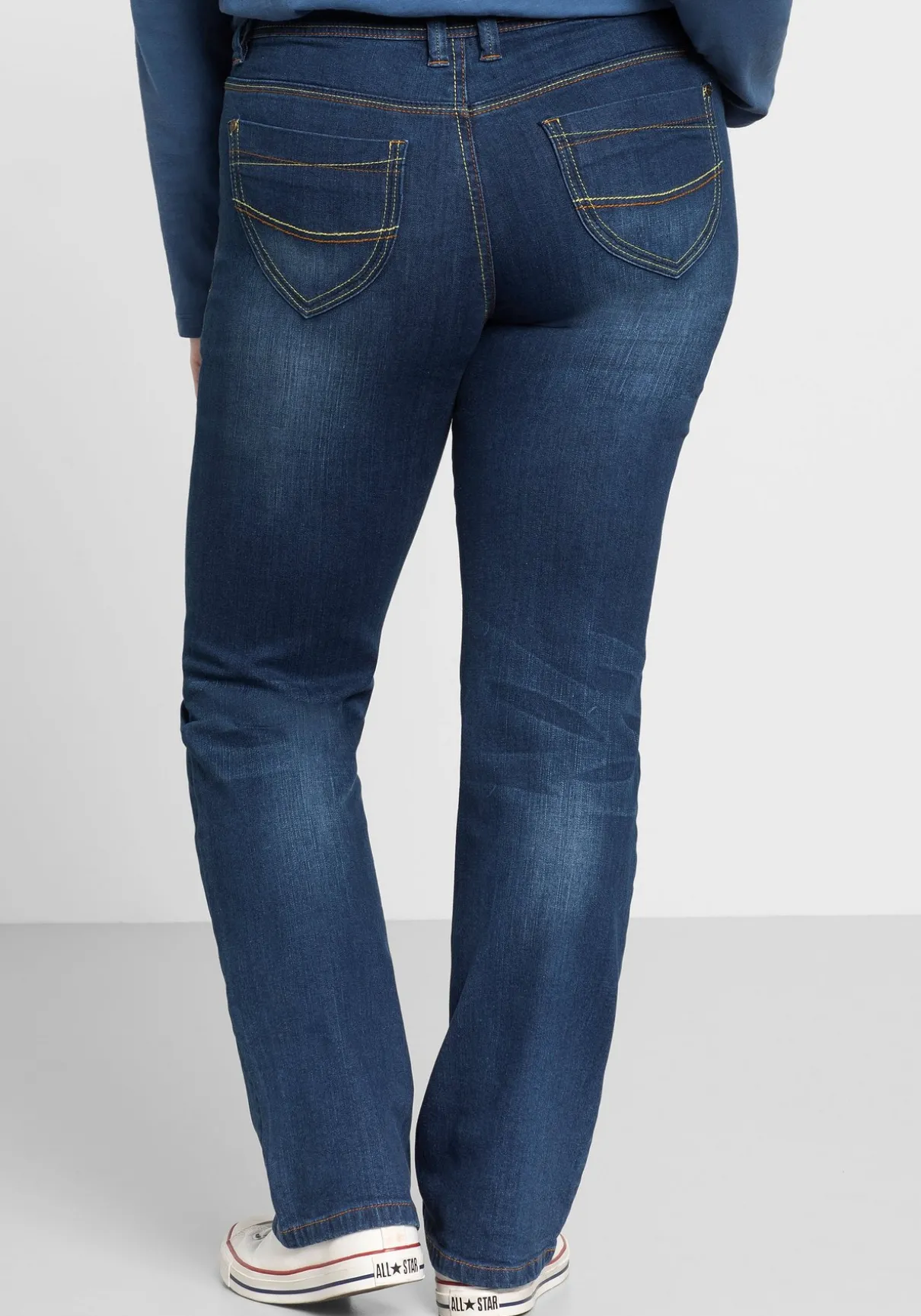 Stretch-Jeans in gerader Schnittform. Die Hose überzeugt durch einen klassischen Five-Pocket-Style mit individuellen Used-Effekten. Optisches Highlight sind die zweifarbigen Kontrastnähte sowie die Stickerei an den Gesäßtaschen.