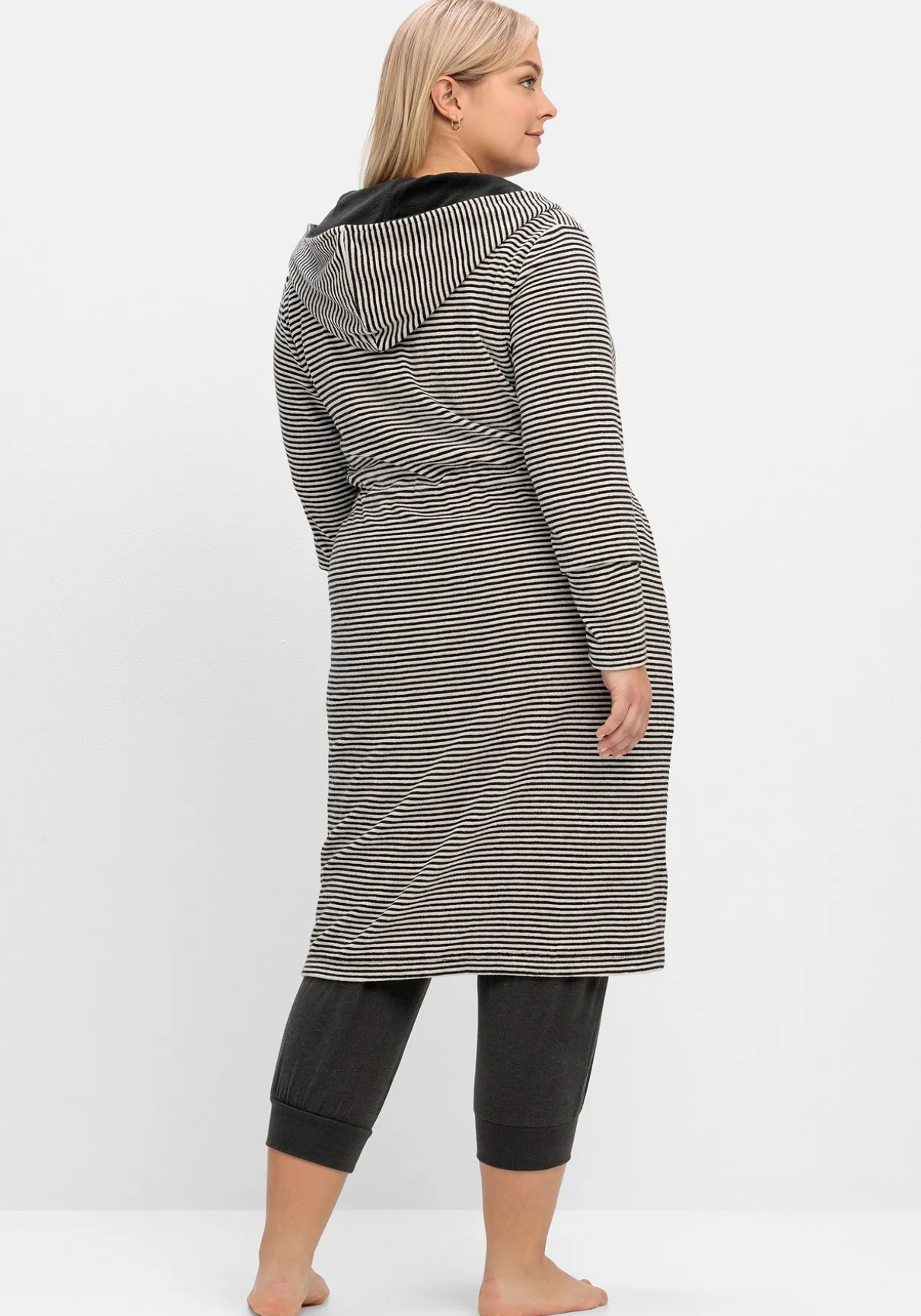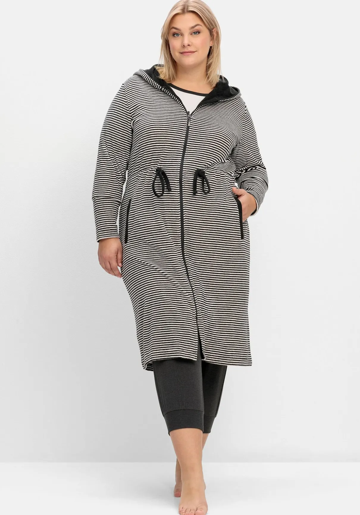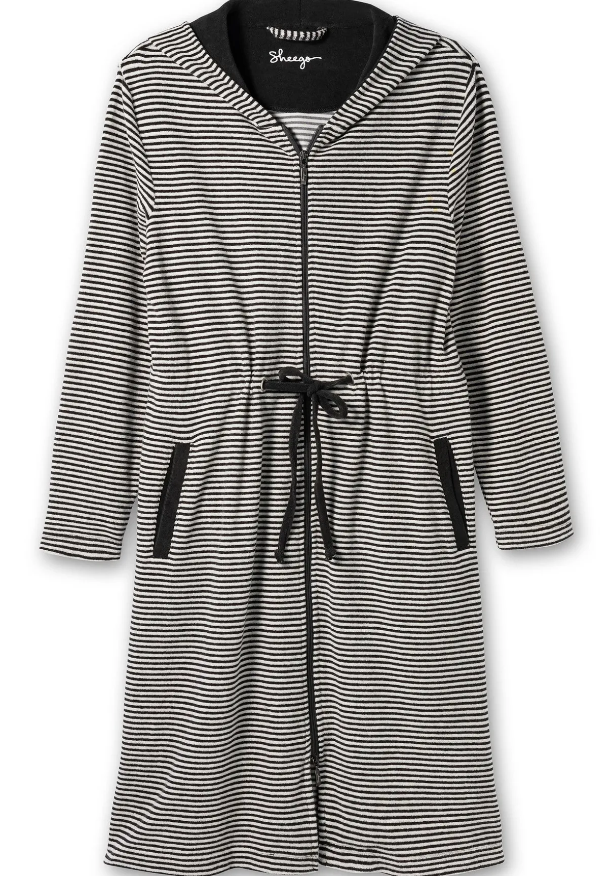 Bademantel mit Kapuze und Tunnelzug. Zu den charmanten Ringeln setzen unifarbene Details modische Akzente. So sind Kapuzeninnenseite, Einschubtaschen und das Bindeband in der Taille kontrastfarben gehalten, der praktische Zwei-Wege-Reißverschluss gibt Bewegungsfreiheit am Saum.
