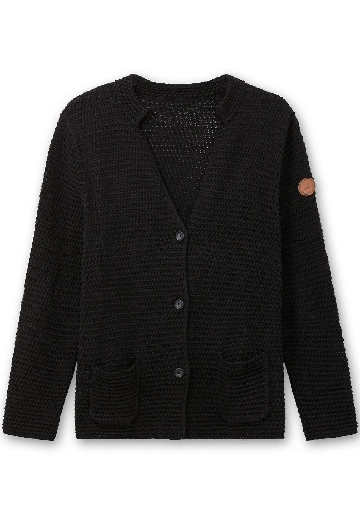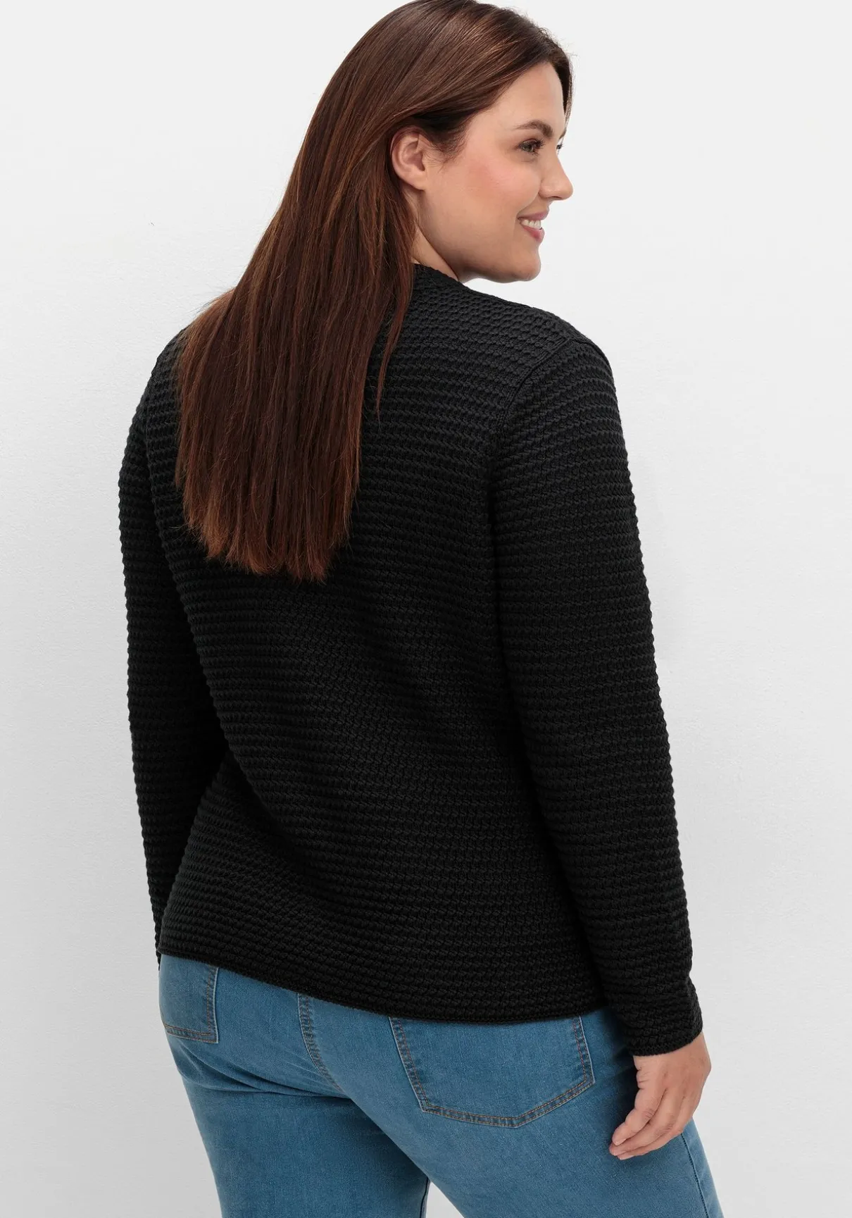 Strickjacke in Grobstrick-Optik von sheego x Collection L. Der modische Auftritt wird durch eine raffinierte Kragenlösung ergänzt: Dabei geht der kleine Stehkragen in einen offenen V-Ausschnitt über. Markante Knöpfe und zwei aufgesetzte Taschen runden den Look stilsicher ab.
