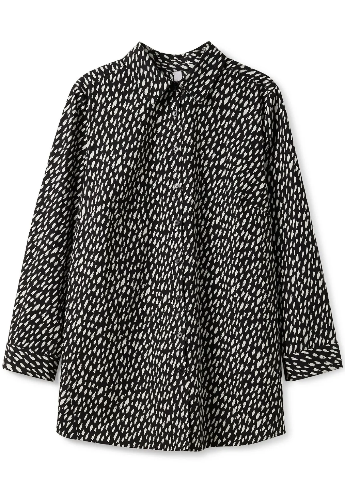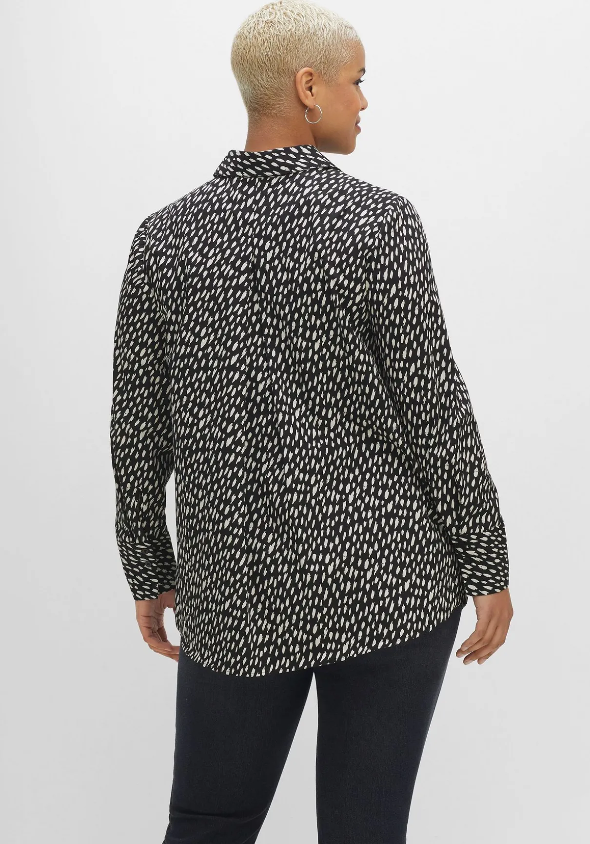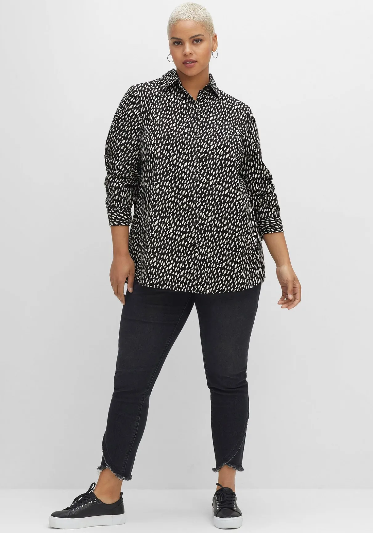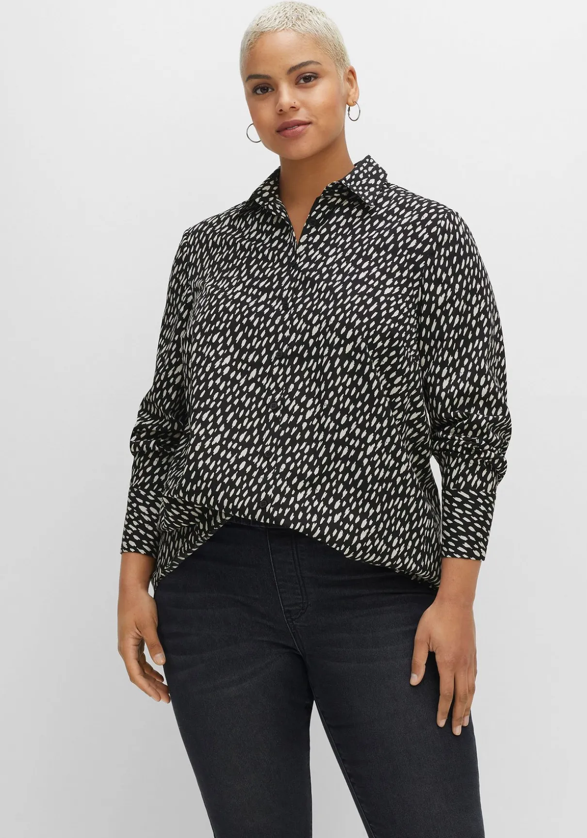 Hemdbluse mit kontraststarkem, harmonischem Alloverprint. Der klassische Schnitt zeigt sich mit hochgeschlossenem Blusenkragen und durchgehender Knopfleiste. Die etwas längere Form mit gerundetem Saum schmeichelt der Po-Partie, eine aufspringende Falte sorgt für angenehme Weite im Rücken. Manschetten mit Knöpfen an den langen Ärmeln runden den Look gepflegt ab. Das feine minimalistische Dessin ist gut zu kombinieren und macht lässig gestylt zur Jeans eine ebenso perfekte Figur wie feminin und elegant unter einem Anzug.
