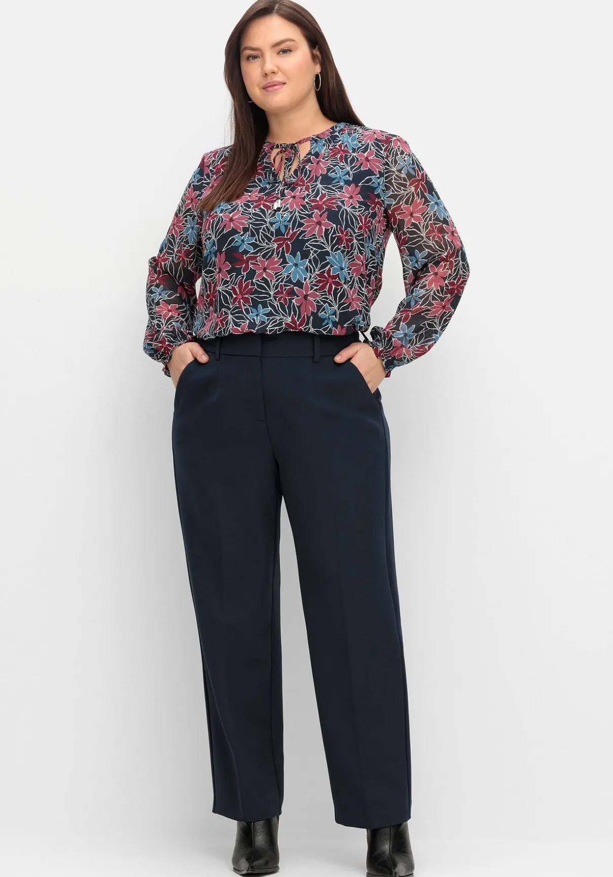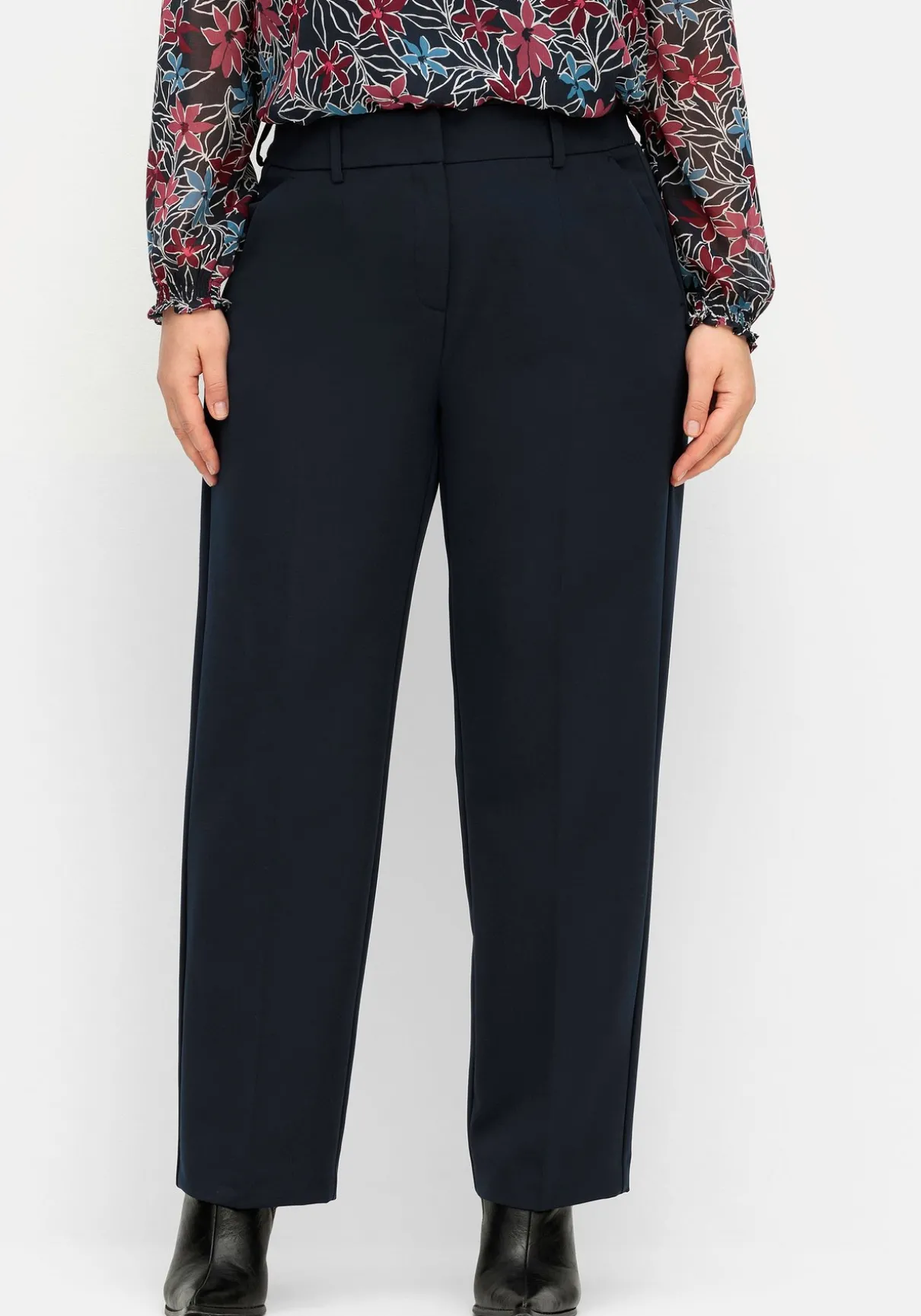 Die Hose sitzt locker am Oberschenkel und läuft zum Saum hin etwas schmal zu. Damit trägt sich die Hose sehr bequem auch bei kräftigeren Beinen. Der High-Waist-Bund setzt die Taille in den Fokus.