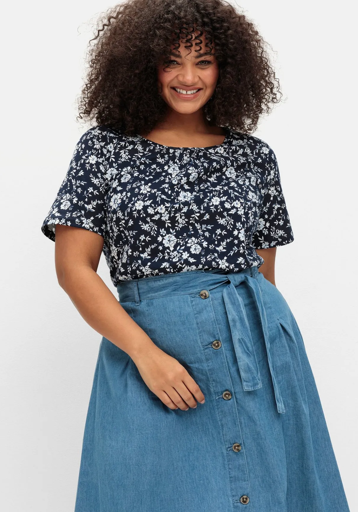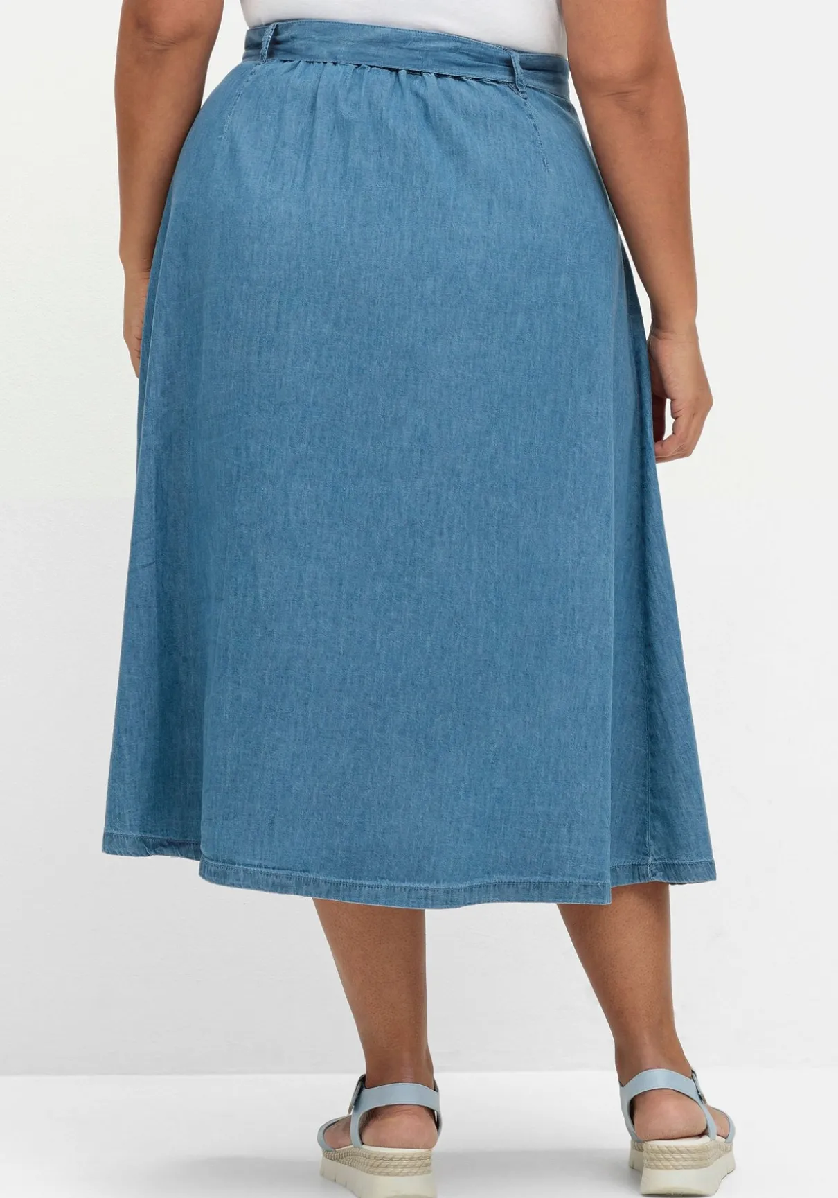 Jeansrock in A-Linie. Der Bund ist mit Bindeband und Gürtelschlaufen gearbeitet, für Bequemlichkeit sorgt der hinten eingearbeitete Gummizug. Bundfalten geben dem Rock Weite, auch der ausgestellte Schnitt lässt den Rock feminin schwingen. Die durchgehende Knopfleiste wirkt optisch streckend und ermöglicht individuelle Beinfreiheit.
