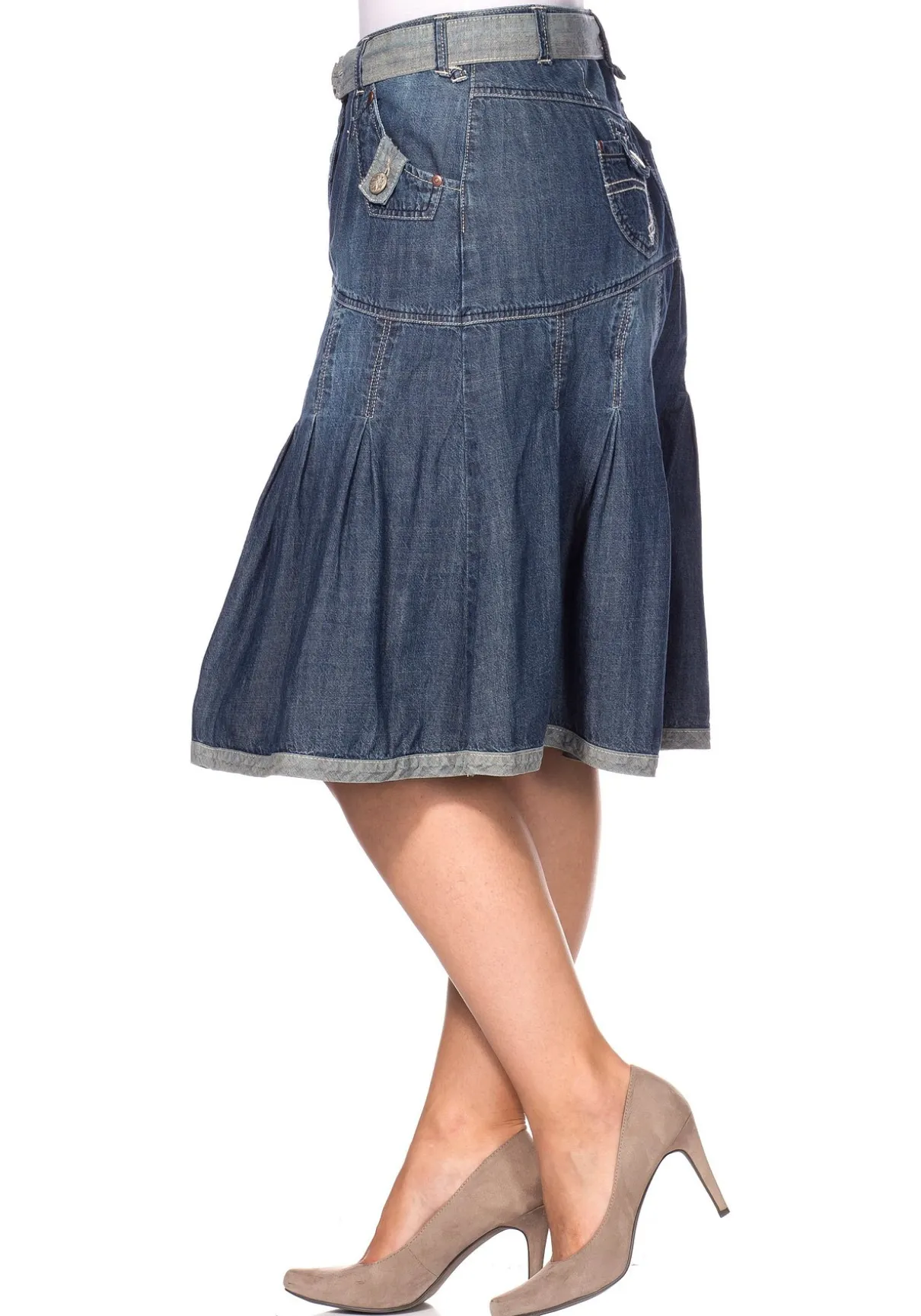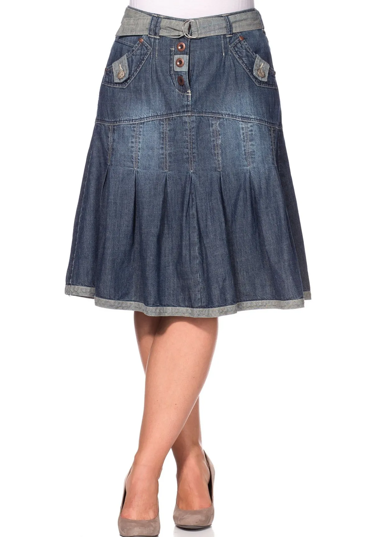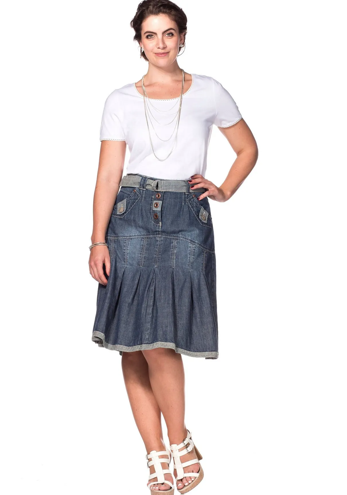Feminin und verspielt wirkt der Jeansrock von sheego by Joe Browns. Die ausgestellte Form ist mit Falten versehen, die beim Gehen aufspringen und so für Schwung und Bewegungsfreiheit sorgen. Die Eingrifftaschen auf der Vorderseite und die aufgesetzten Gesäßtaschen sind mit einer Klappe und geprägten Knöpfen verziert Die Klappe ist wie der abnehmbare Bindegürtel und der Saumabschluss hell abgesetzt. Mit einem Reißverschluss unter der Zierknopfleiste wird der Rock geschlossen.
