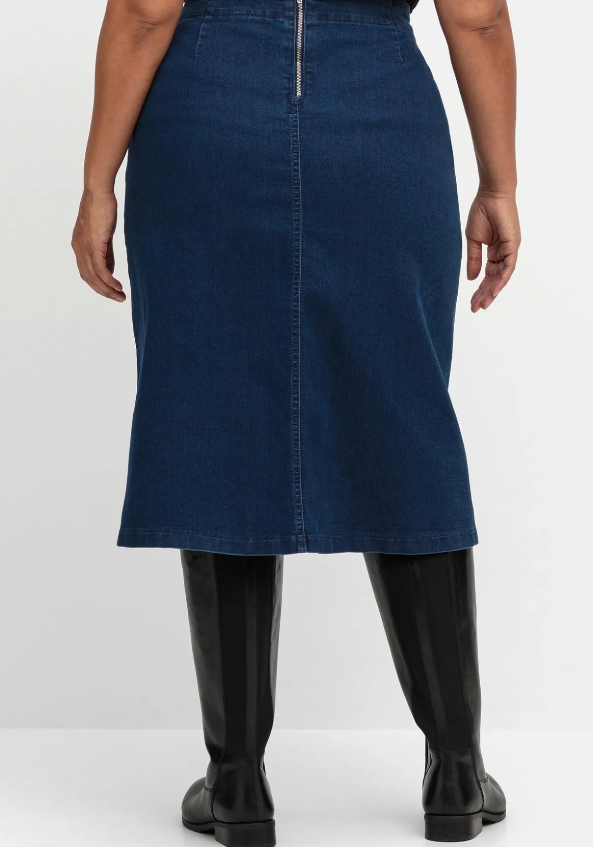 Jeansrock in Midilänge. Die Zierknopfleiste verleiht dem Rock ein modisches Upgrade und streckt gleichzeitig geschickt die Figur. Der Gehschlitz vorn gibt Bewegungsfreiheit, dazu kommen zwei Taschen und ein Reißverschluss hinten. Für den optimalen Sitz sorgen die Abnäher in der Taille und die Teilungsnaht hinten.