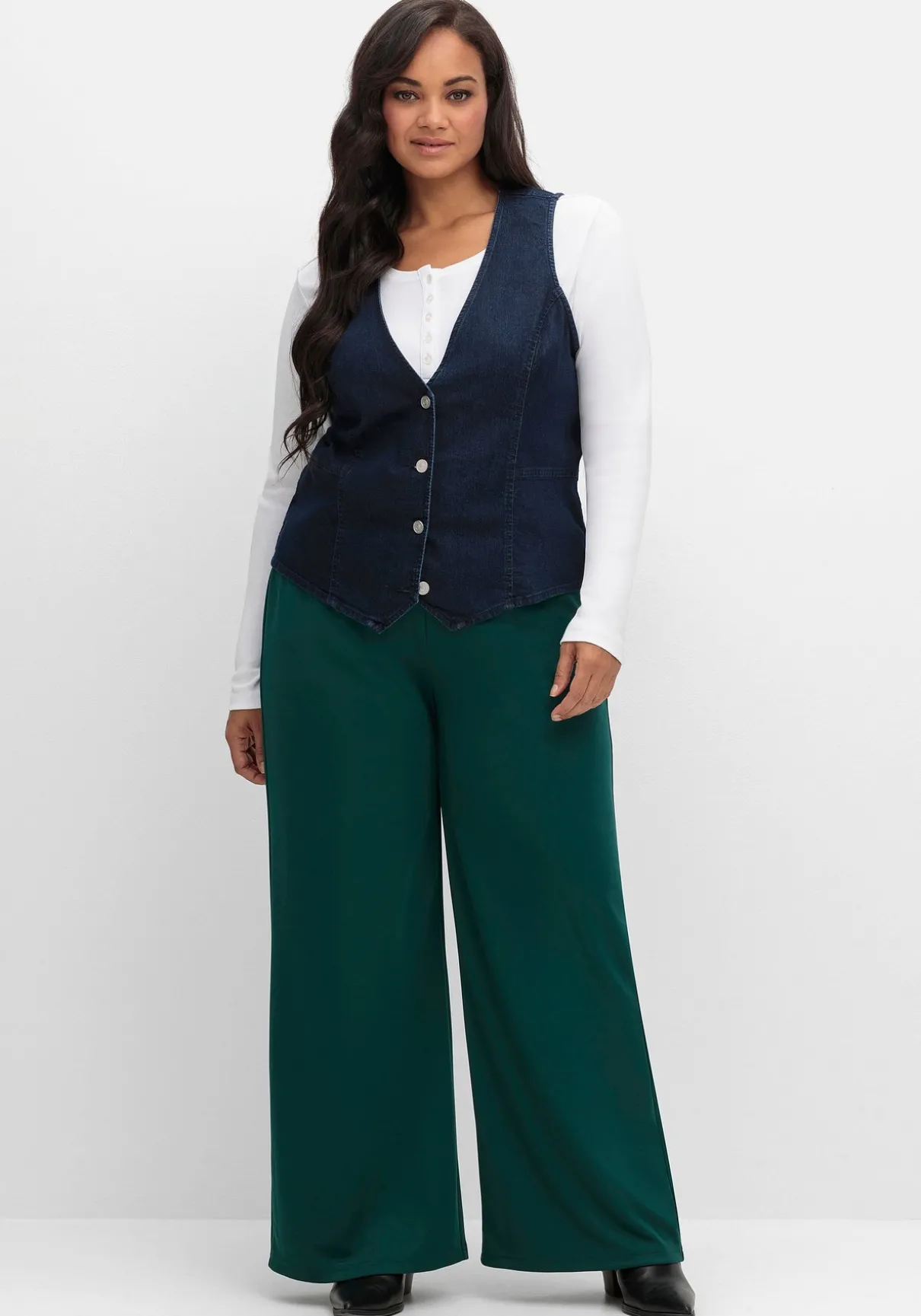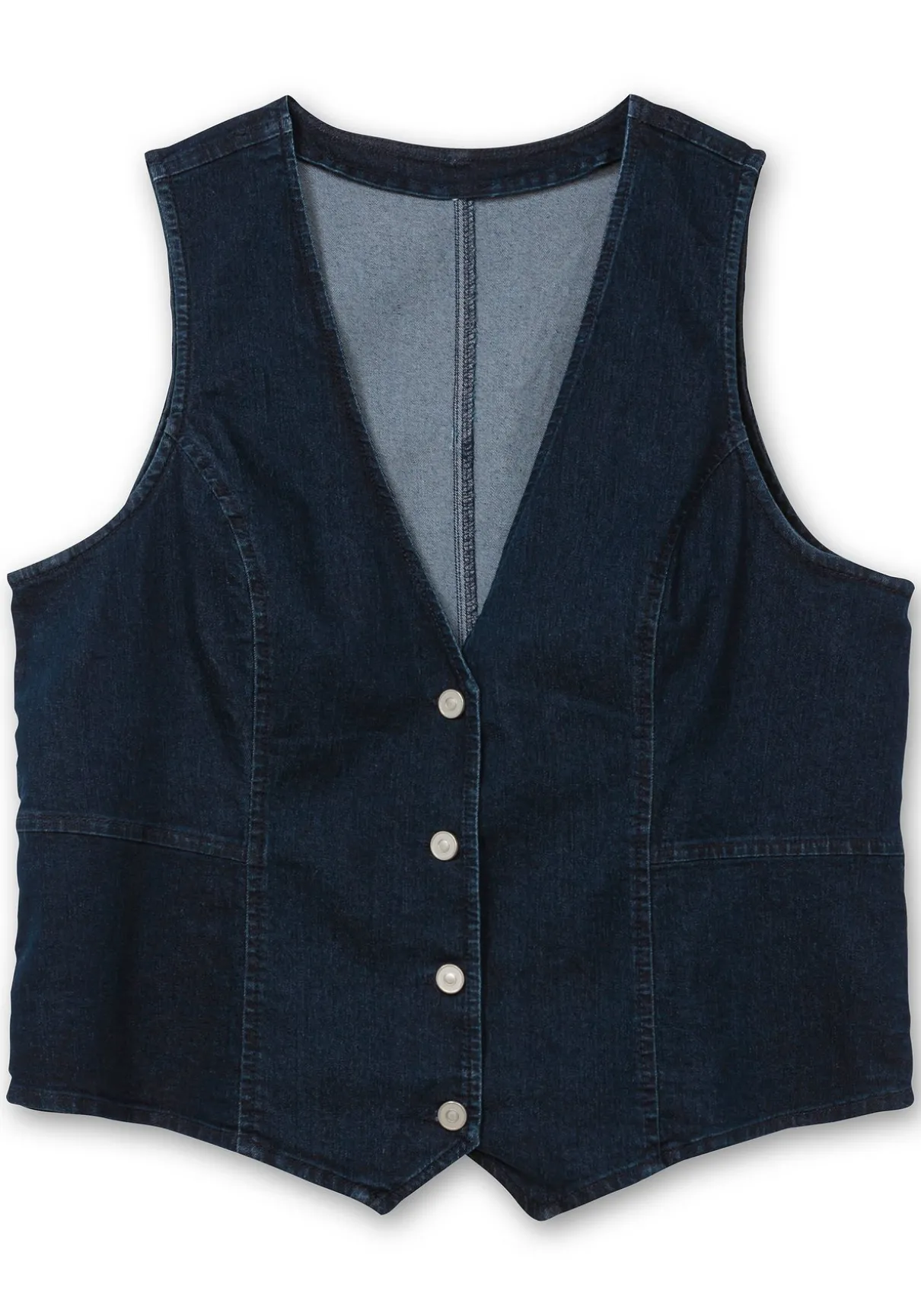 Jeansweste in kurzer, taillierter Form. Die feminine, kombistarke Weste ist wie eine Anzugweste geschnitten und verleiht so jedem Look ein modisches Upgrade. Sie besitzt einen tiefen V-Ausschnitt und vier markante Knöpfe. Die leicht taillierte Form läuft vorn am Saum spitz zu, Wiener Nähte und Teilungsnähe formen schmeichelnd die Figur.