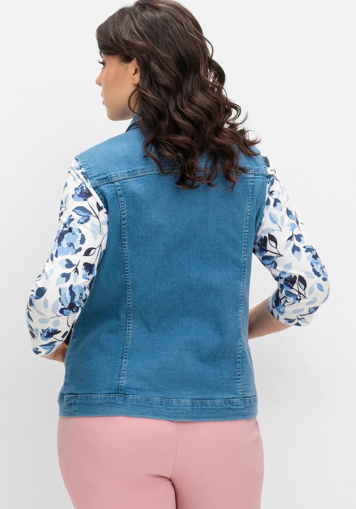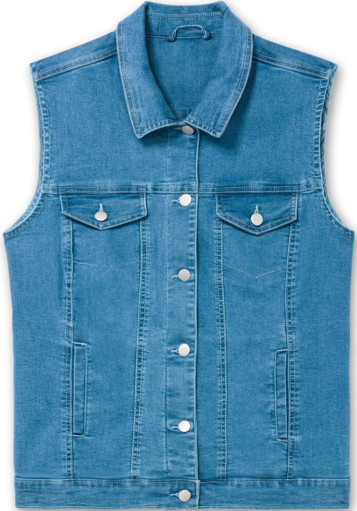 Jeansweste in leicht taillierter Form. Die Weste ist mit Umlegekragen und einer durchgehenden Knopfleiste mit Metallknöpfen gearbeitet, auch die beiden aufgesetzten Brusttaschen mit Patte und Knopf sorgen für den typischen Denim-Look. Geschickt gesetzte Teilungsnähte geben der Silhouette Form, praktisch sind die Eingrifftaschen seitlich.