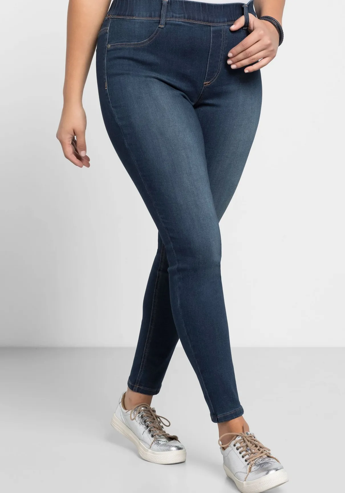 Skinny Power-Stretch-Jeggings in bequemer Schlupfform. Die dezent verwaschene Optik sowie die Stickereien auf den Gesäßtaschen geben den Jeggings einen modischen Look. Der Schlupfbund sorgt für maximale Bequemlichkeit.