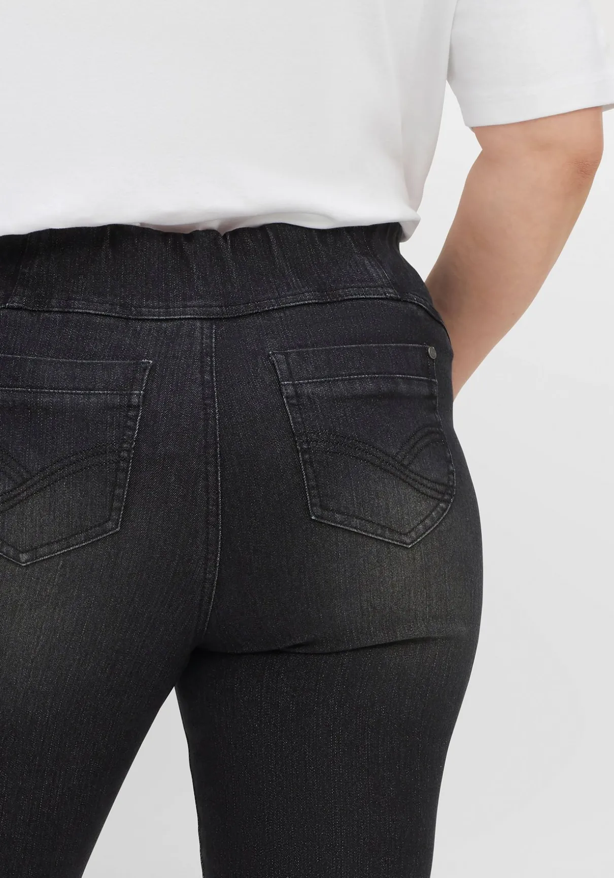 Jeggings in individueller Waschung. Charakteristisch ist hier der breite Gummibund, der die Taille in den Fokus rückt. Ziernähte vorn und bestickte, aufgesetzte Taschen hinten sorgen für die typische Jeanshosen-Optik.