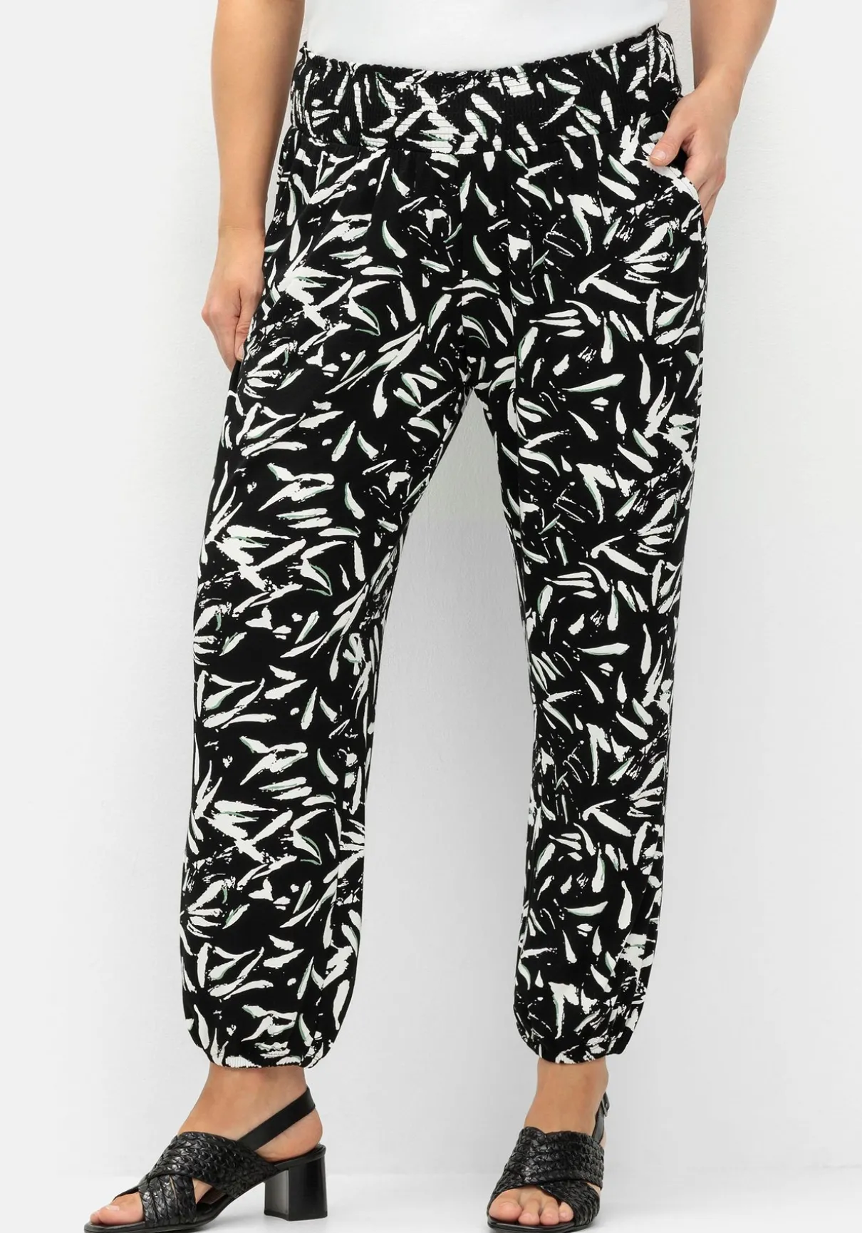 Hose in gerader Form. Der breite Smokbund und die elastischen Saumabschlüsse sorgen für eine legere Optik, während der fantasievolle Blätterdruck einen femininen Akzent setzt. Praktische seitliche Taschen runden den Look perfekt ab.