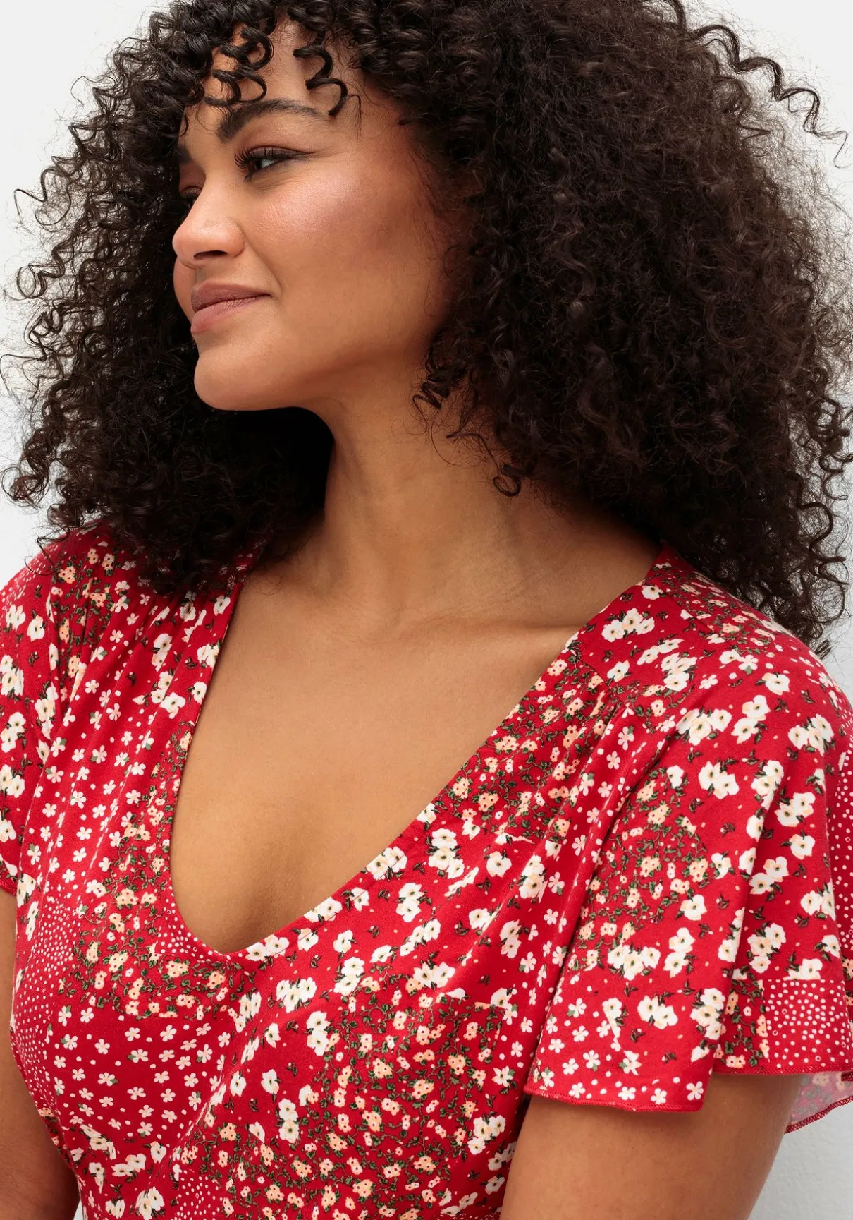 Wadenlanges Kleid aus Jersey. Der Blumenprint zeigt sich in verspielter Patch-Optik. Auch V-Ausschnitt, kurze Flügelärmel und eine leicht geraffte Schulternaht verleihen dem Kleid eine feminine Note. Durch den breiten Einsatz in der Taille sowie die gesmokten Partien im Rücken betont das Kleid schmeichelnd die Figur, das ausgestellte Rockteil fällt durch die kleinen Falten besonders schön.