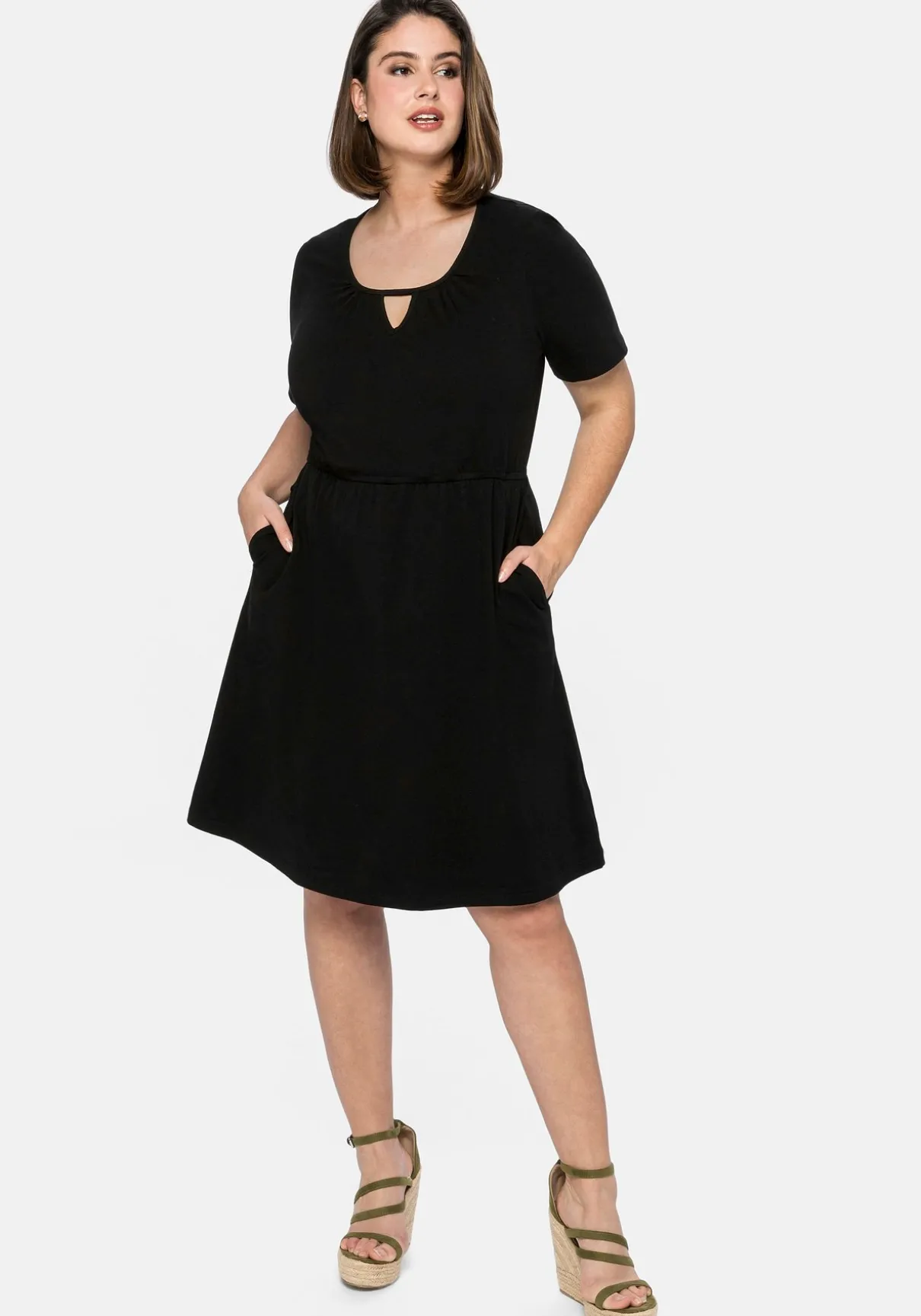 Jerseykleid in kniefreier Länge. Highlight ist der Rundhalsausschnitt, der mit Raffungen und Cut-outs besonders aufwendig gearbeitet ist. Der Gummizug in der Taille bricht den ansonsten sehr clean gehaltenen Look. Praktisches Finish: Die seitlichen Taschen.