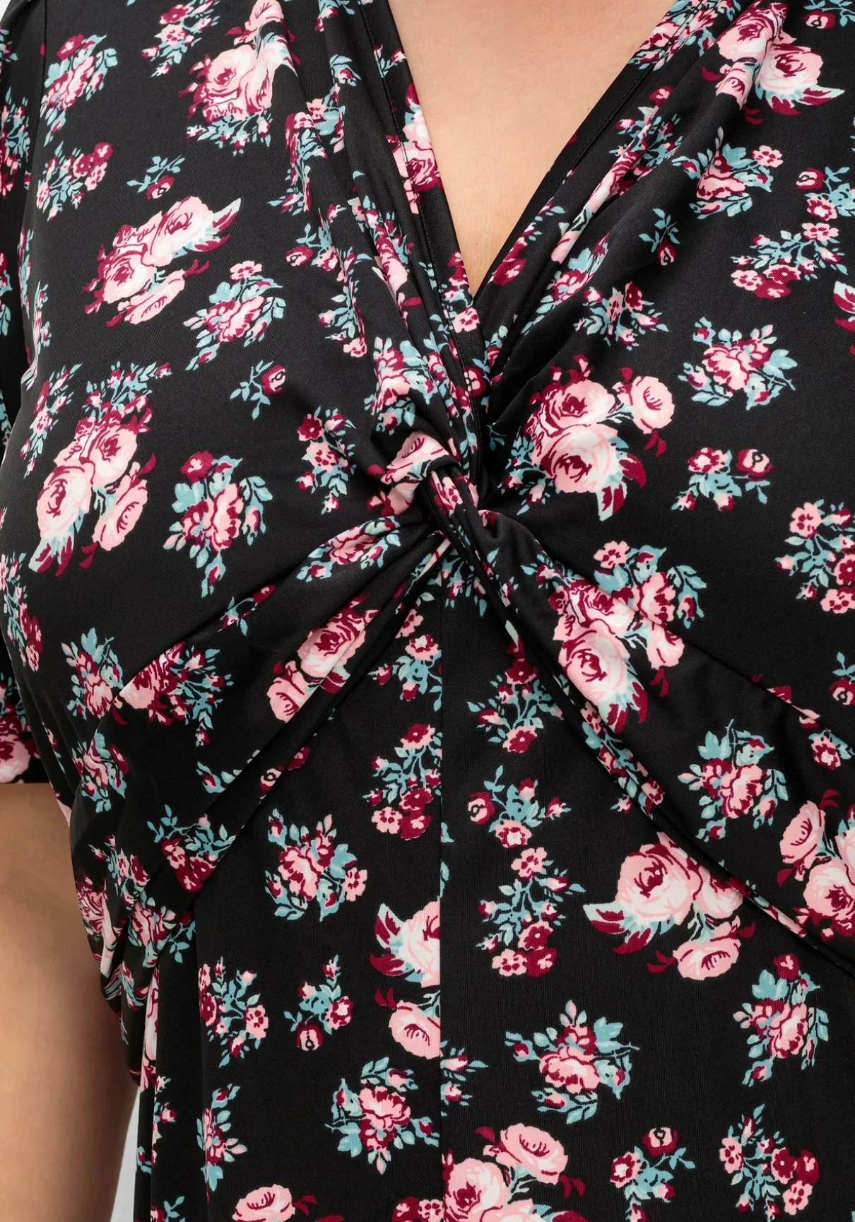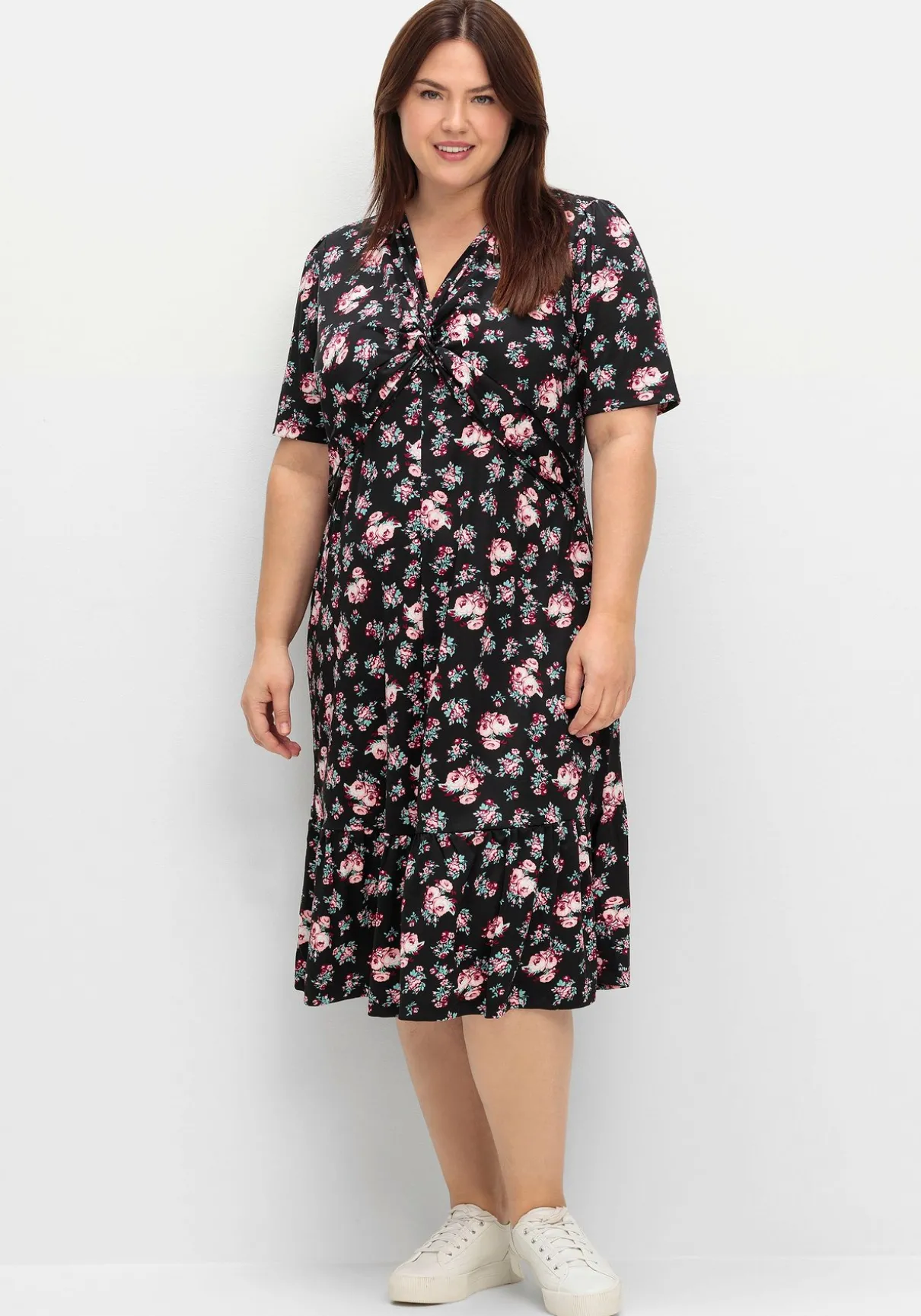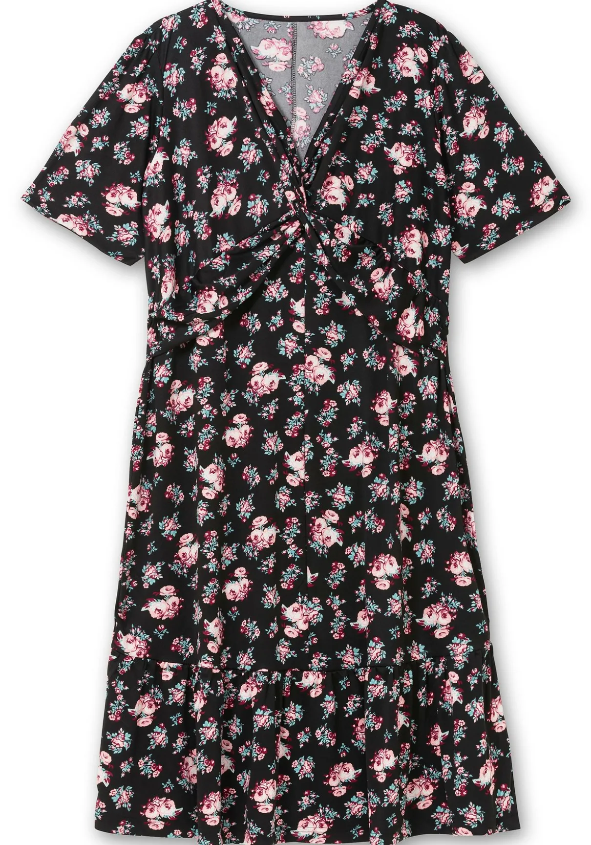 Jerseykleid mit Alloverprint. Der dekorativ geknotete V-Ausschnitt formt ein schönes Dekolleté und streckt den Oberkörper optisch. Ein Volant am Saum lässt das Kleid schön schwingen. Raffungen an den Schultern und 3/4-lange Ärmel ergänzen den femininen Fit.