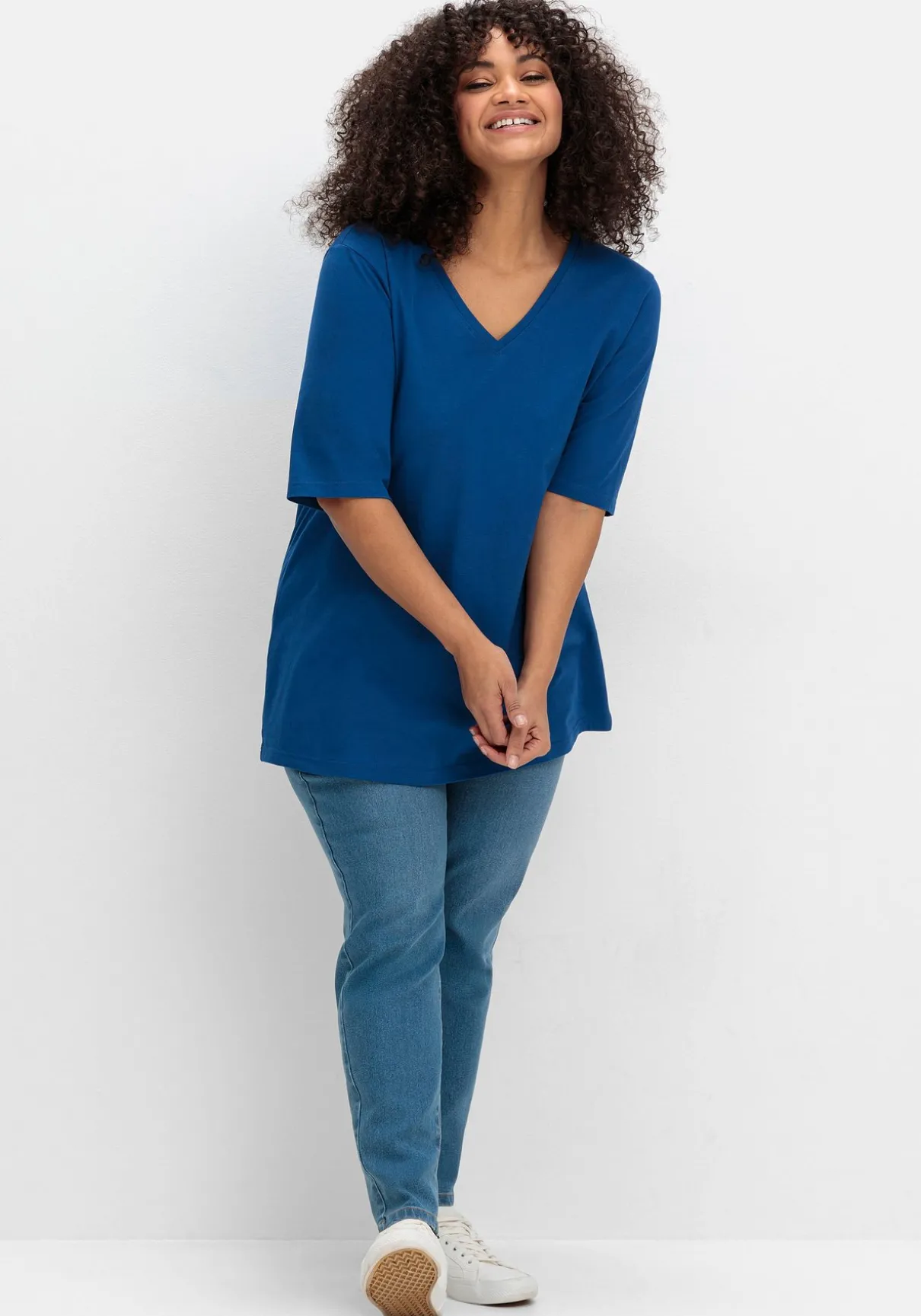 Shirt in leicht elastischer Qualität. Der feminine V-Ausschnitt wirkt optisch streckend, die verlängerten Halbärmel schmeicheln den Oberarmen. Der leicht taillierte Schnitt betont sanft die Figur und wird durch einen geraden Saumabschluss ergänzt. Ein praktisches Essential, das solo oder als Unterziehshirt getragen werden kann.