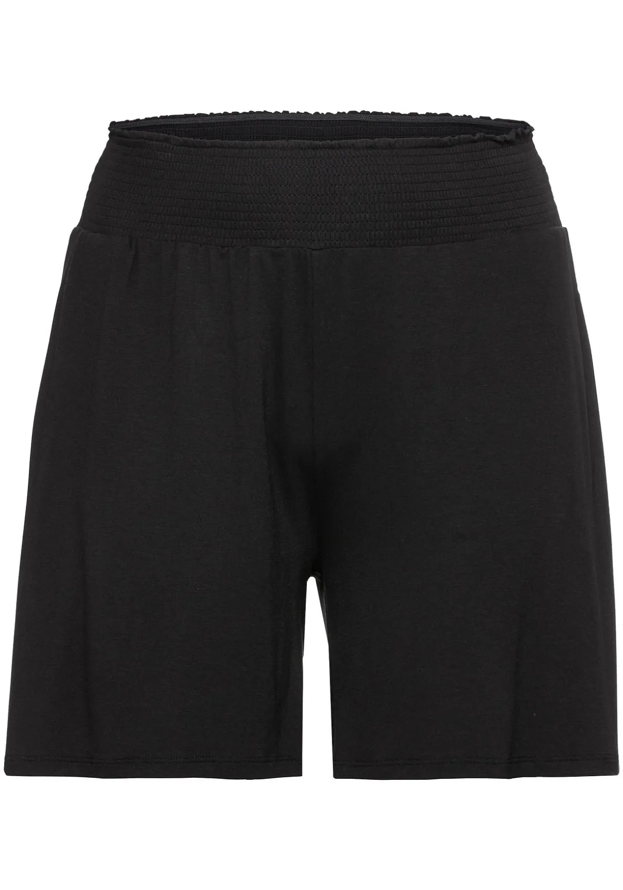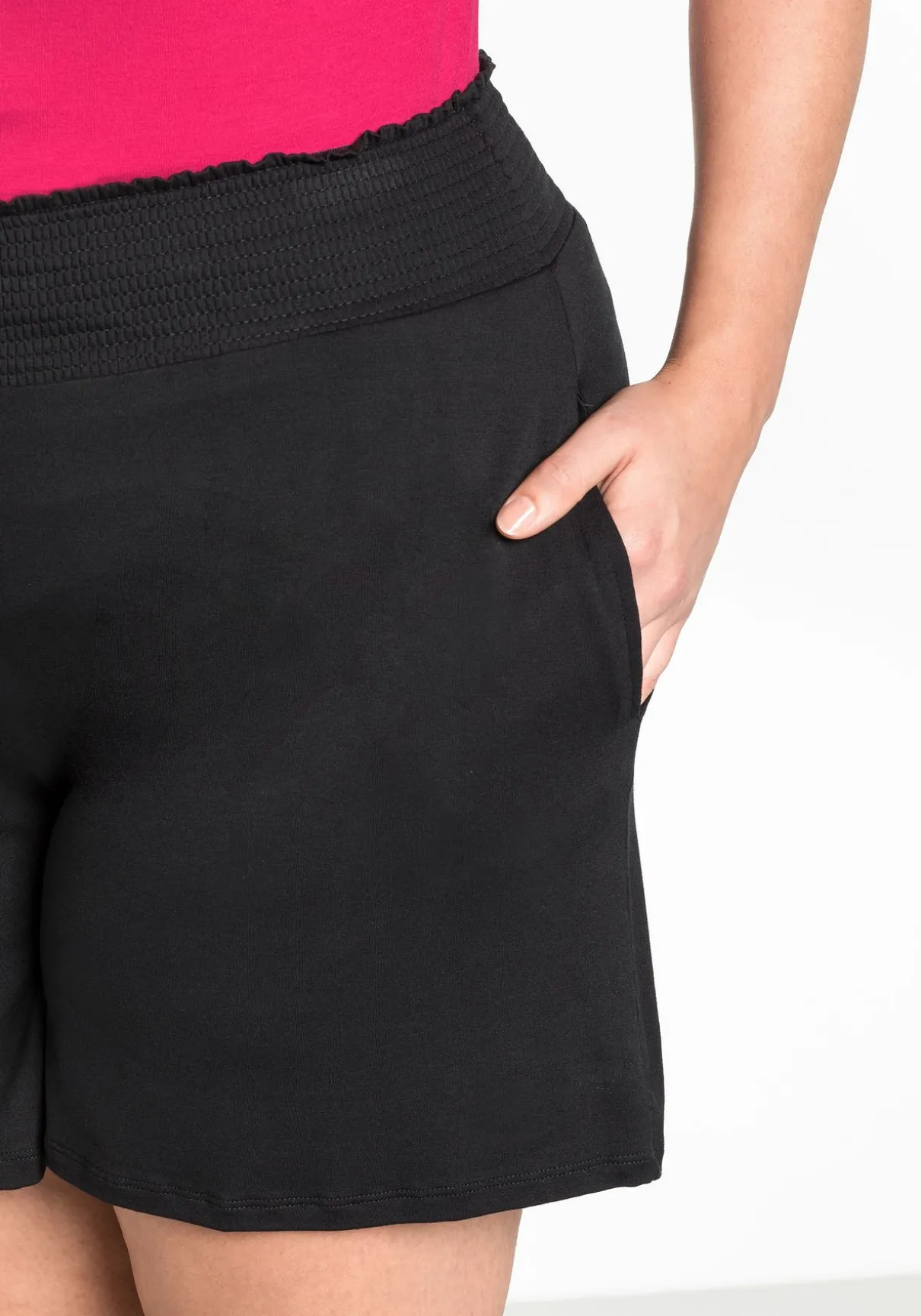 Diese Shorts von sheego eignen sich durch den legeren Schnitt und den bequemen Smokbund optimal, um sie schnell über die Badekleidung zu ziehen. In der Seitennaht befinden sich zwei praktische Taschen.