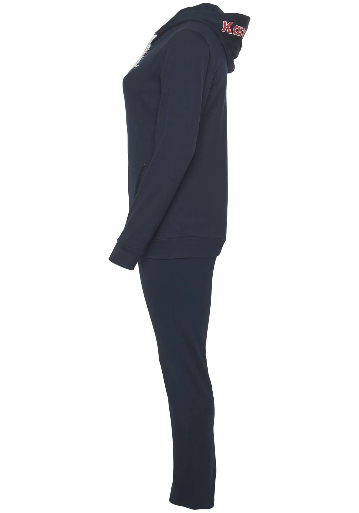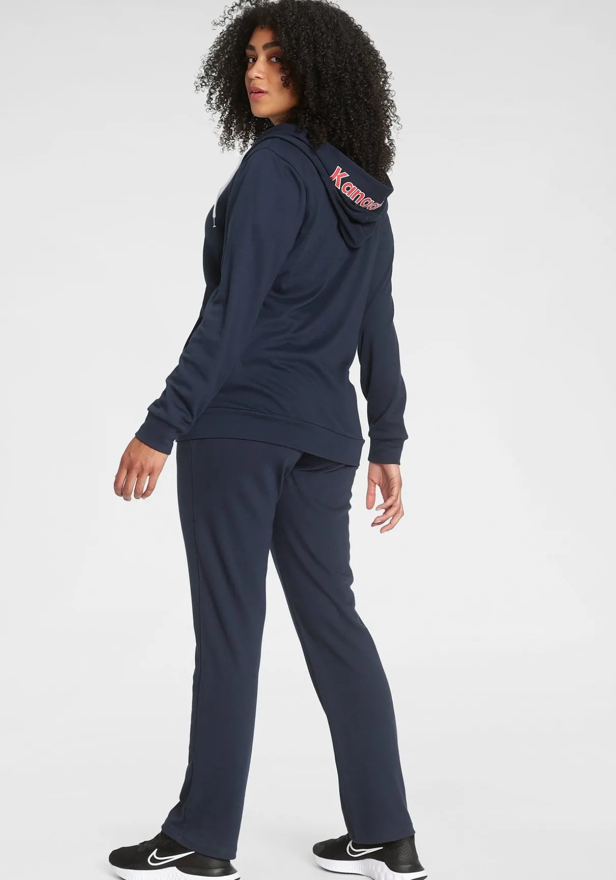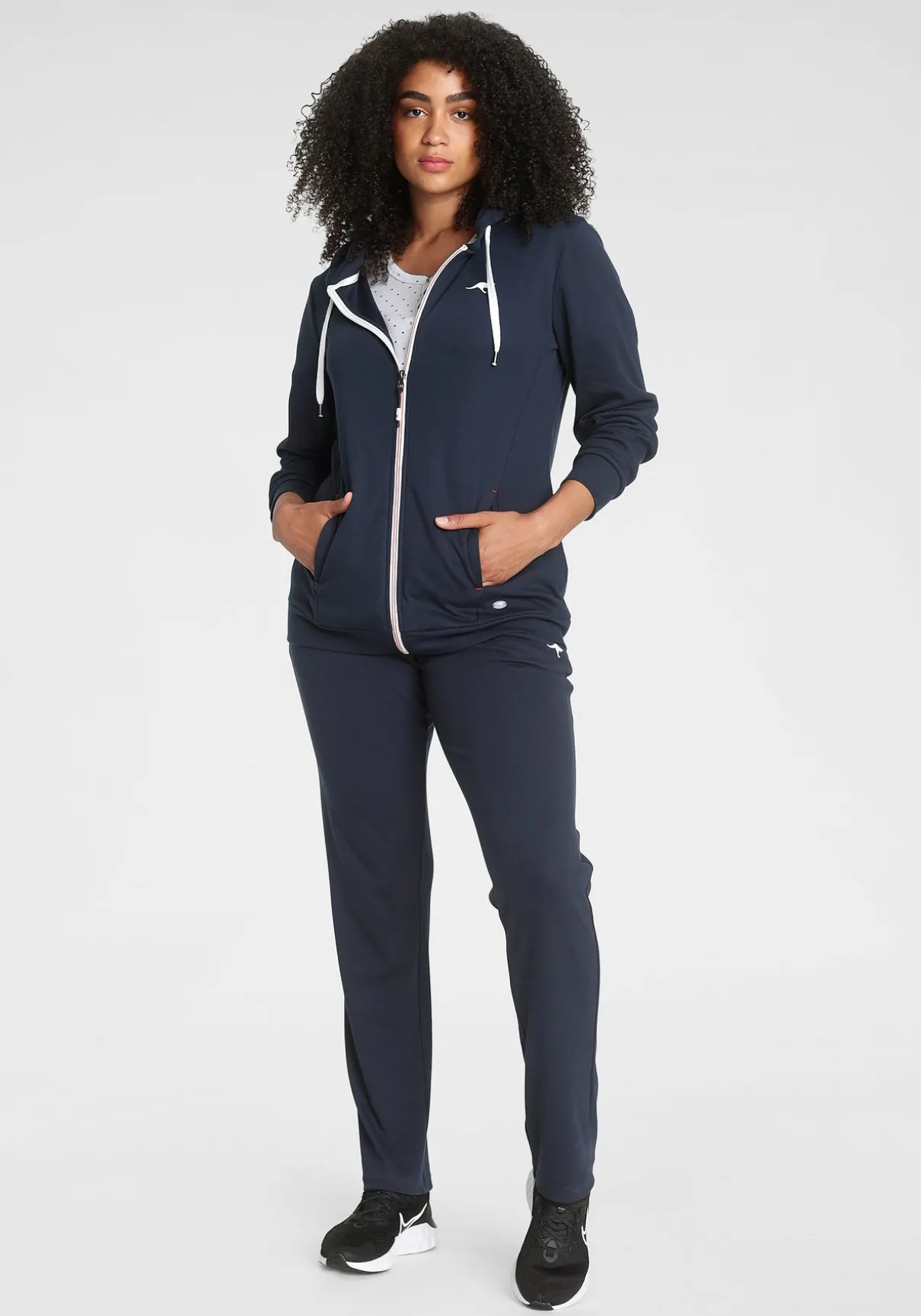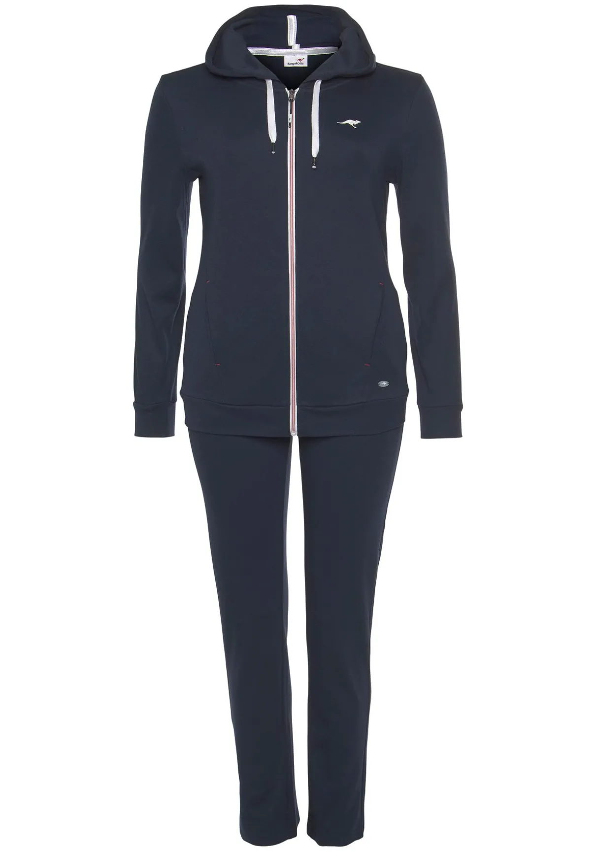 Jogginganzug von Kangaroos. Oberteil und Unterteil mit seitlichen Eingrifftaschen. Kapuze mit Tunnelzug und Logodruck. Unterteilnbund mit Gummi- und Tunnelzug. Logodruck auf der Brust. Trageangenehme Qualität.