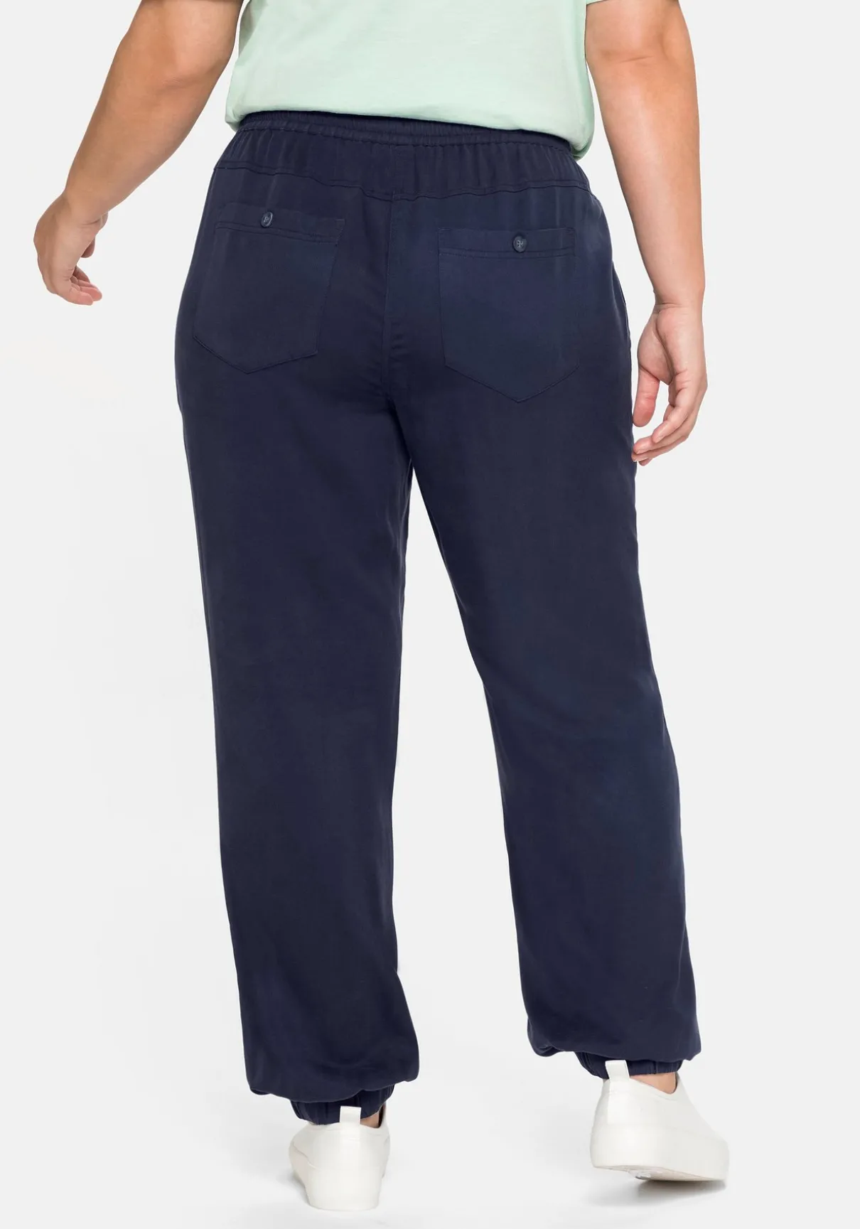 Joggpants in weich fließender Qualität. Der elastische Bund kann mit Hilfe des Bindebands in der Weite reguliert werden, die elastischen Bündchen am Beinabschluss unterstreichen die sportive Optik. Zwei Eingrifftaschen vorn und zwei aufgesetzte Taschen hinten ergänzen den Look.
