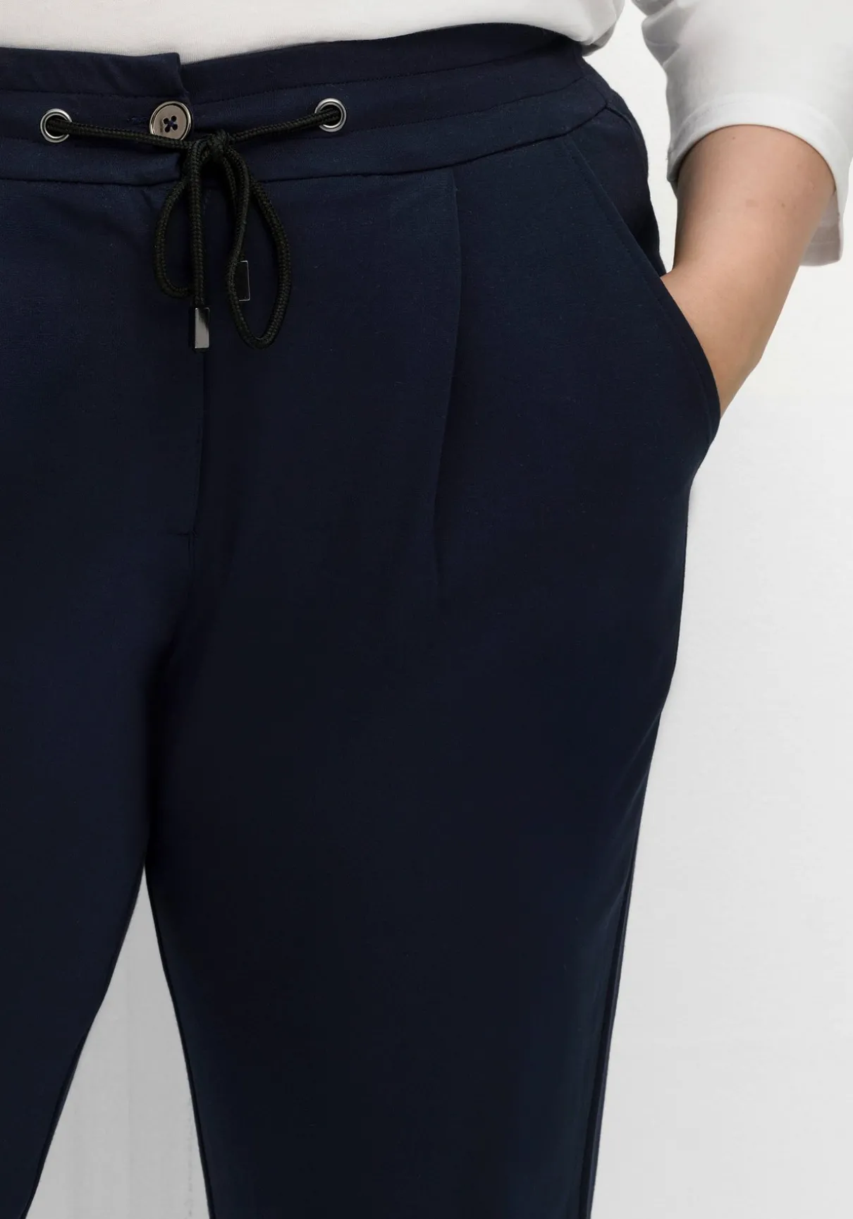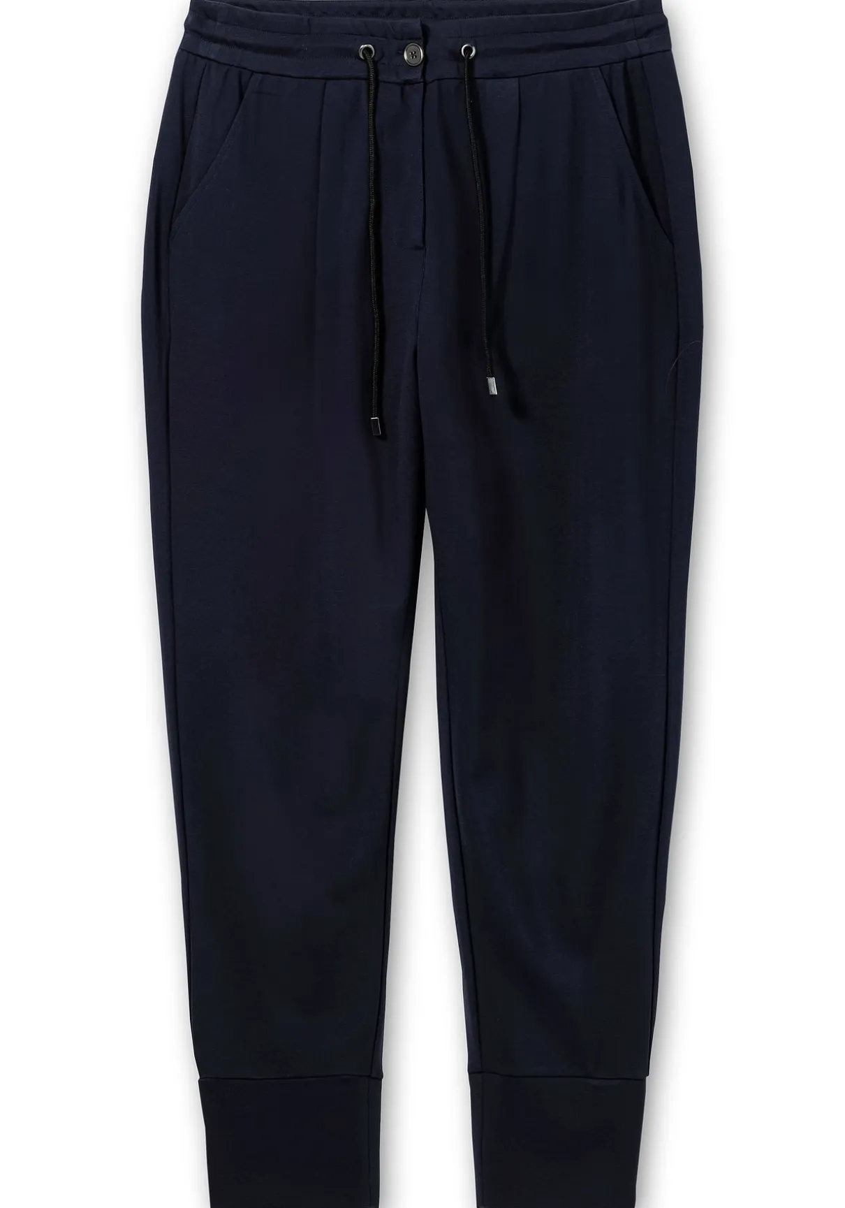 Joggpants mit breiten Bündchen am Saum. Der bequeme Schlupfbund, der mit einer Kordel in der Weite reguliert werden kann, ergänzt den sportiven Look. Während sich vorn seitliche Eingriffstaschen befinden, sind hinten Taschen aufgesetzt. Zierknöpfe dekorieren den Bund.