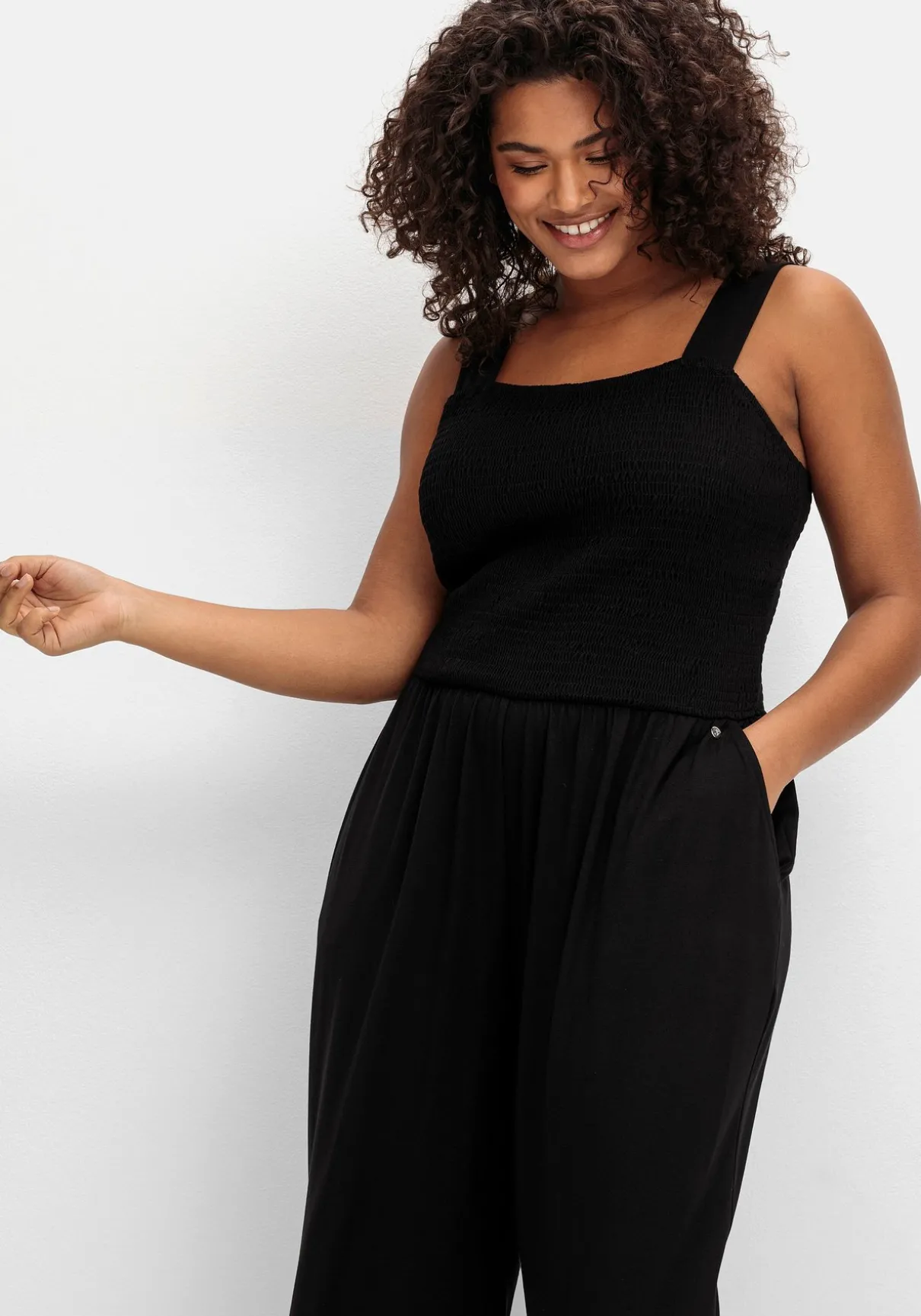 Jumpsuit aus Jersey. Das gesamte Oberteil ist bis auf die schmalen Träger gesmokt und sitzt dadurch figurbetont und bequem zugleich. Dazu kommt der modische Karree-Ausschnitt vorn und hinten. Die Hose ist am Bund leicht gerafft, wodurch sie schön locker und luftig fällt. Praktisch sind die beiden seitlichen Taschen. Ein vielseitiger Einteiler für die Freizeit und Strand, der mit den richtigen Accessoires auch partytauglich wird – perfekt für deinen Urlaubskoffer!