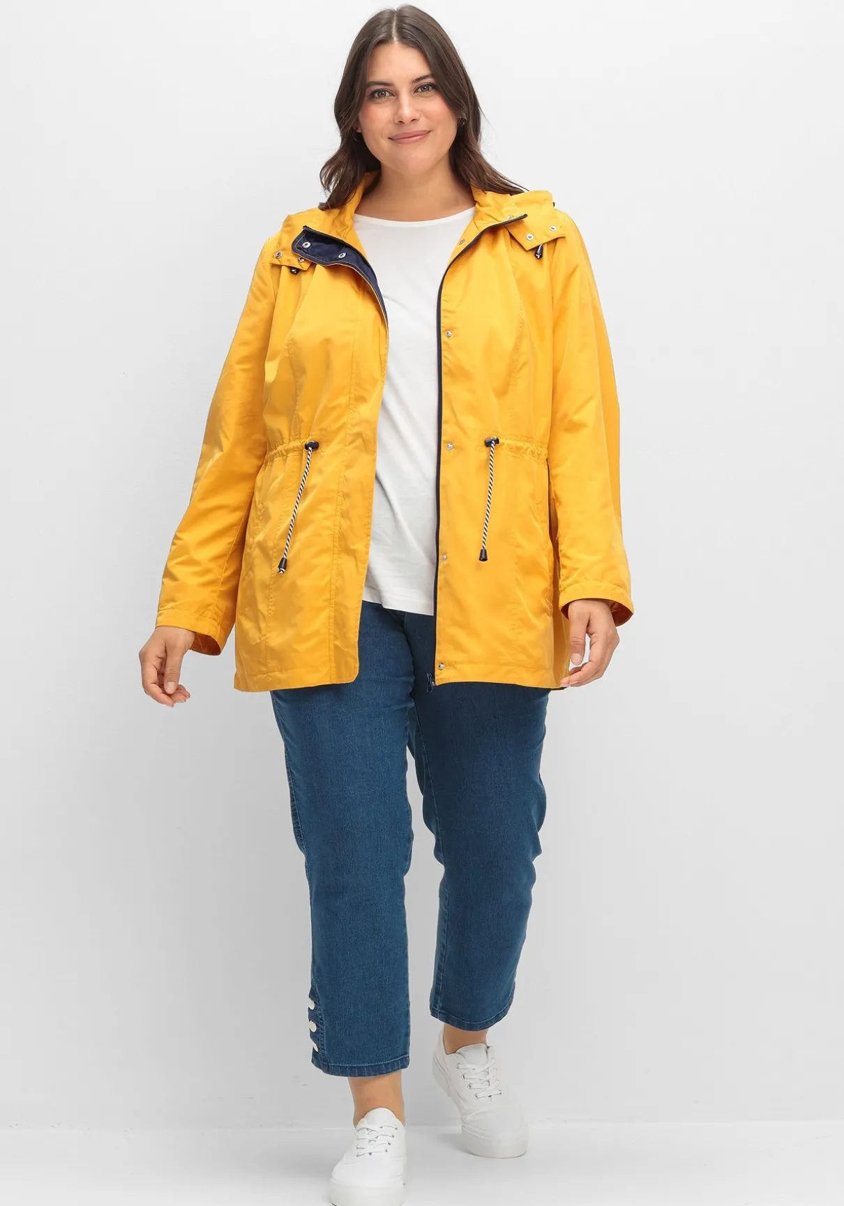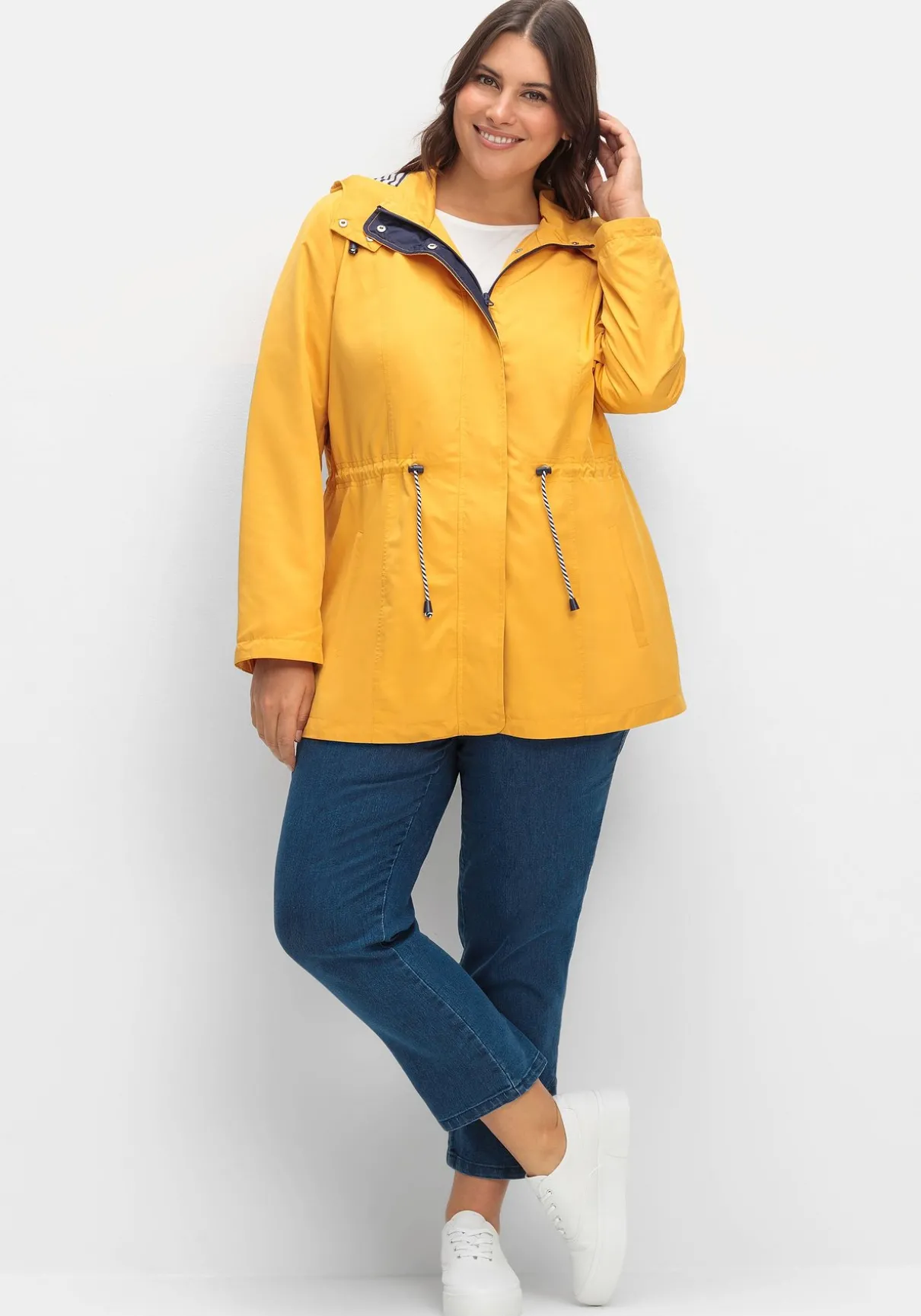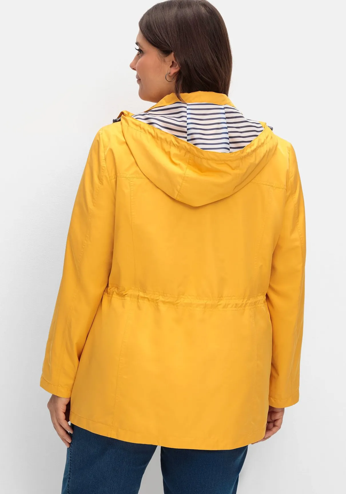 Leichte Jacke mit weitenregulierbarer Kapuze. Für maritime Akzente sorgt das gestreifte Innenfutter. Ausgestattet ist die Jacke mit einem durchgehenden Reißverschluss und einer verdeckten Druckknopfleiste. Der Tunnelzug mit Stoppern setzt die Taille in den Fokus. Zwei Leistentaschen ergänzen den sportiven Style.