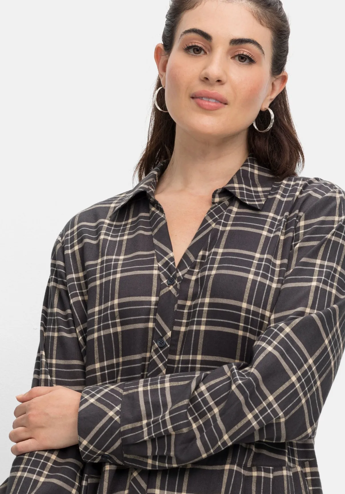 Blusenkleid im Karomuster. Für den charakteristischen Look sorgen Hemdkragen, durchgehende Knopfleiste und Manschettenärmel. Die mit angelegten Falten gearbeitete Taillennaht gibt der Silhouette Form. Praktisch sind die seitlichen Eingrifftaschen, die seitlichen Schlitze sorgen für Bewegungsfreiheit.