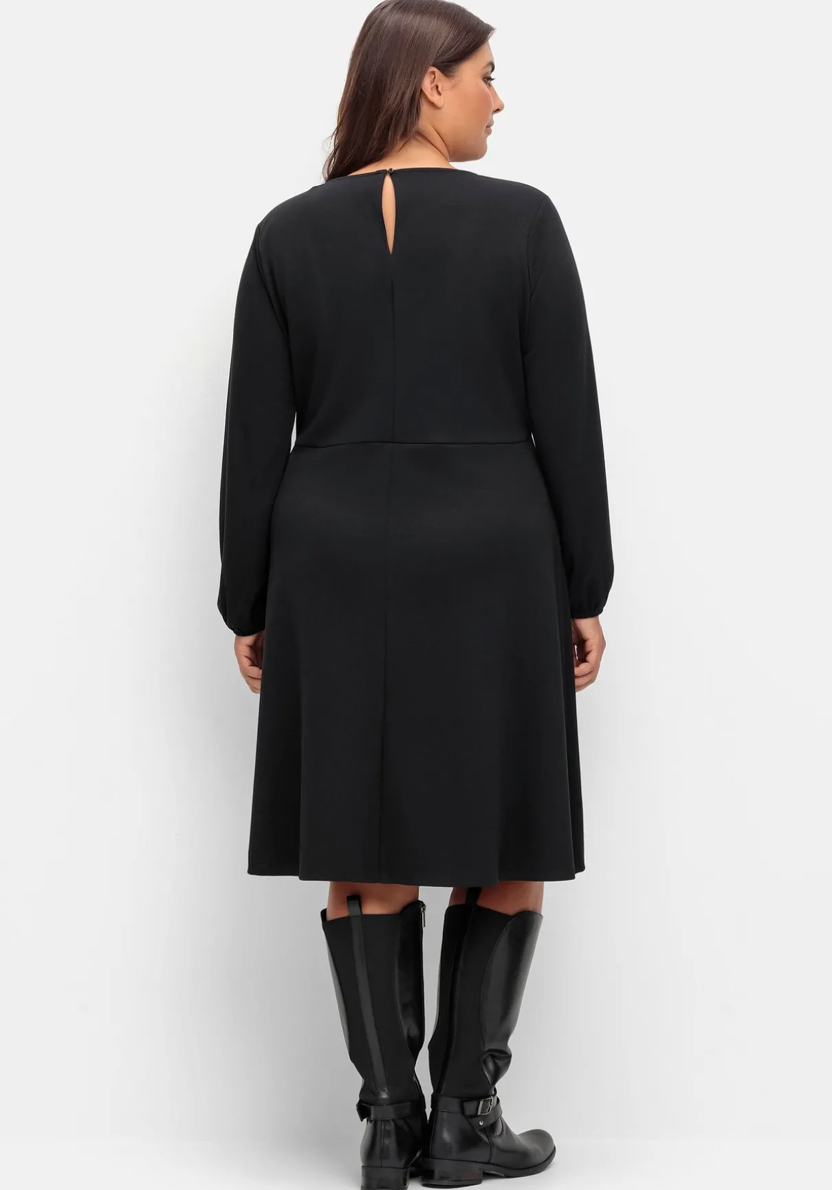 Kleid in A-Linie. Das feminine Kleid ist mit einem Rundhalsausschnitt gearbeitet, im Nacken überraschen Schlitz und Knopfverschluss. Die raffinierte Taillennaht betont geschickt die Körpermitte, darunter schließt sich der ausgestellte Rock an.