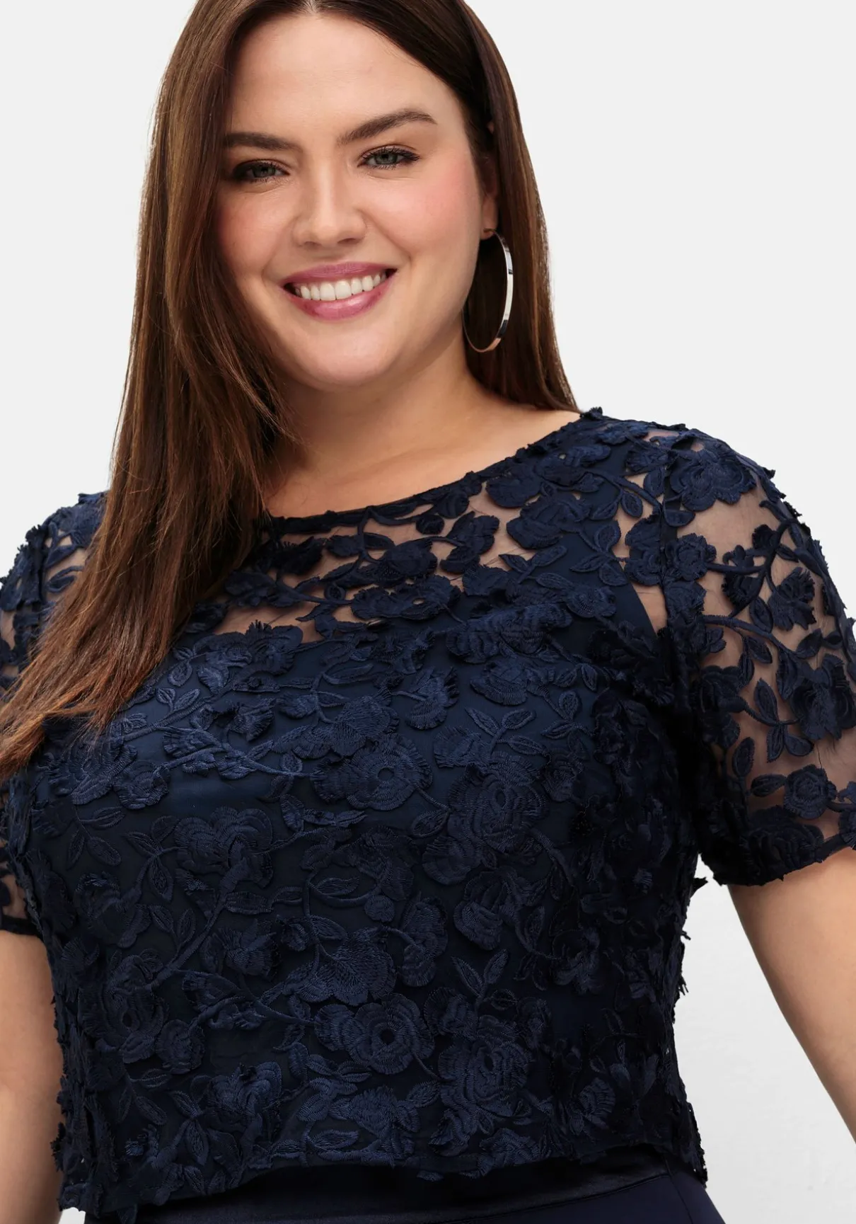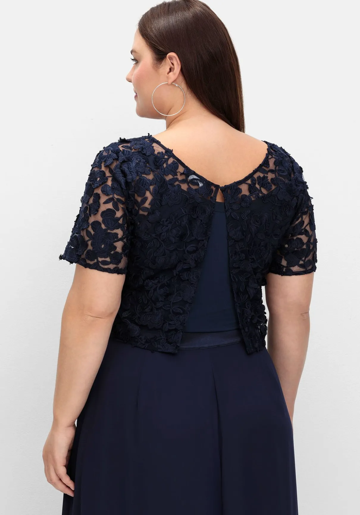 Kurzärmlige Tunika aus floraler, transparenter Spitze. Vorn ist das elegante Oberteil mit einem femininen Rundhalsausschnitt gearbeitet. Hinten fällt es durch den langen V-Schlitz ab Ausschnitt offen über den Rücken. Ein stoffbezogener Knopf mit Loop rundet den modisch-raffinierten Look stilsicher ab. So entsteht ein festlicher Stylingpartner, der sich zu ärmellosen Abendkleidern genauso tragen lässt wie zu einem langen Rock und in der Farbe Offwhite perfekt zu unseren Hochzeits-Kombinationen passt.
