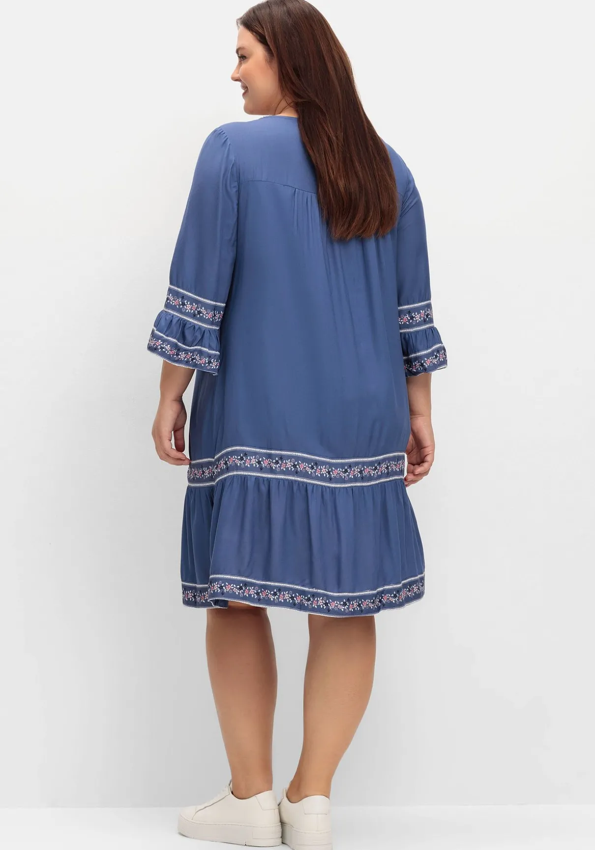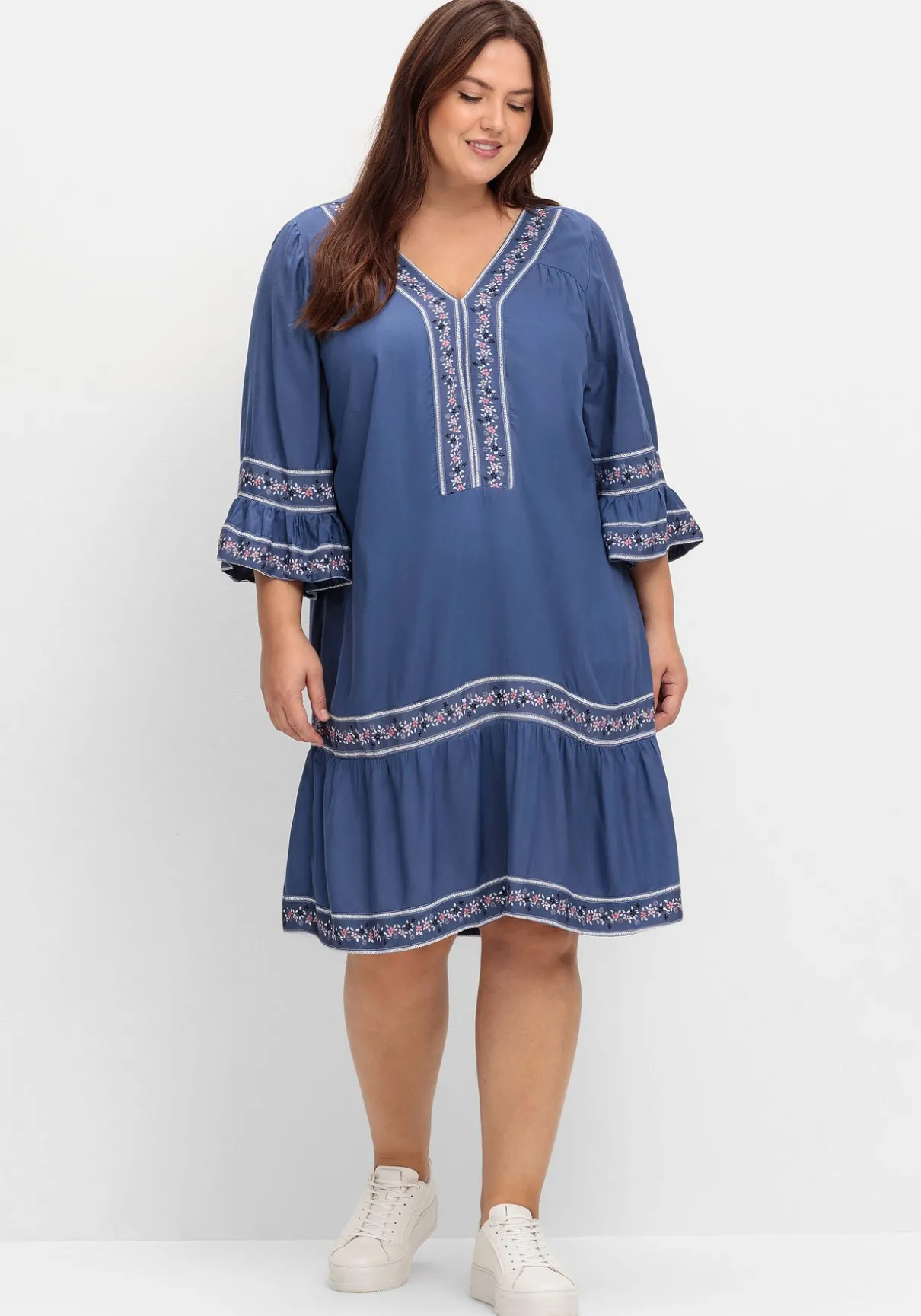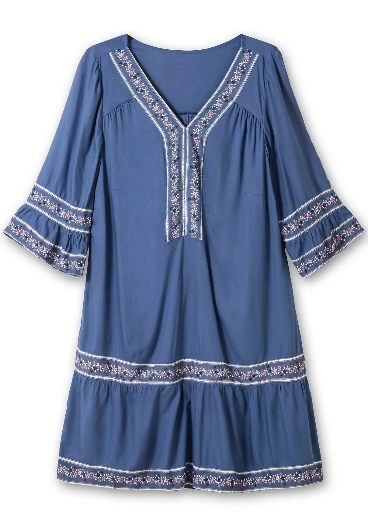 Kleid im Tunikaschnitt. Zum verspielten Blümchenmuster setzt das kontrastfarbene Zierband einen schönen Kontrast. Gleichzeitig werden der V-Ausschnitt und die luftig-weiten Trompetenärmel dekorativ betont. Die Raffung im Rücken sorgt für zusätzliche Weite und einen schmeichelnden Fall.