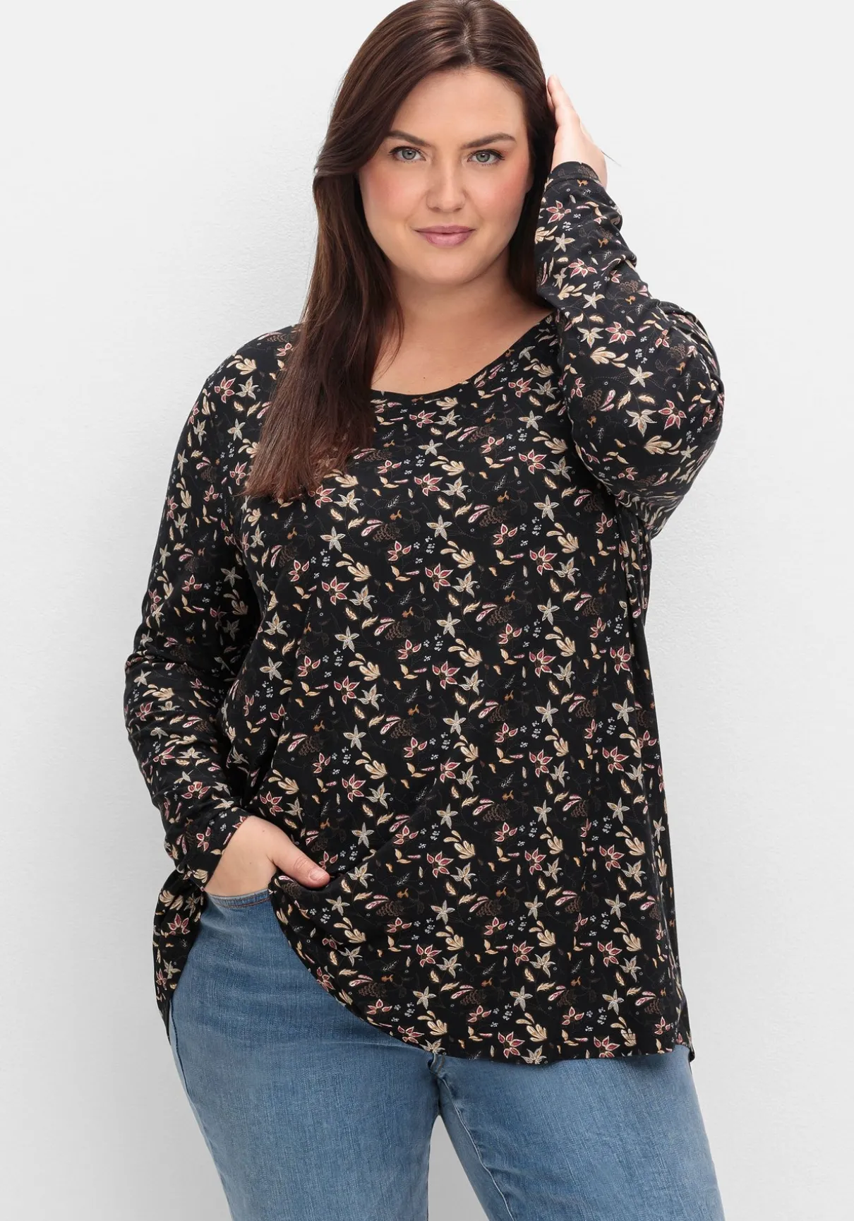 Langarmshirt mit Rundhalsausschnitt. Der zarte Blüten- und Blätterprint verleiht dem Shirt eine feminine Optik. Eine Passe im Rücken sorgt für einen guten Sitz, darunter fällt der leicht ausgestellte Schnitt locker über die Silhouette.
