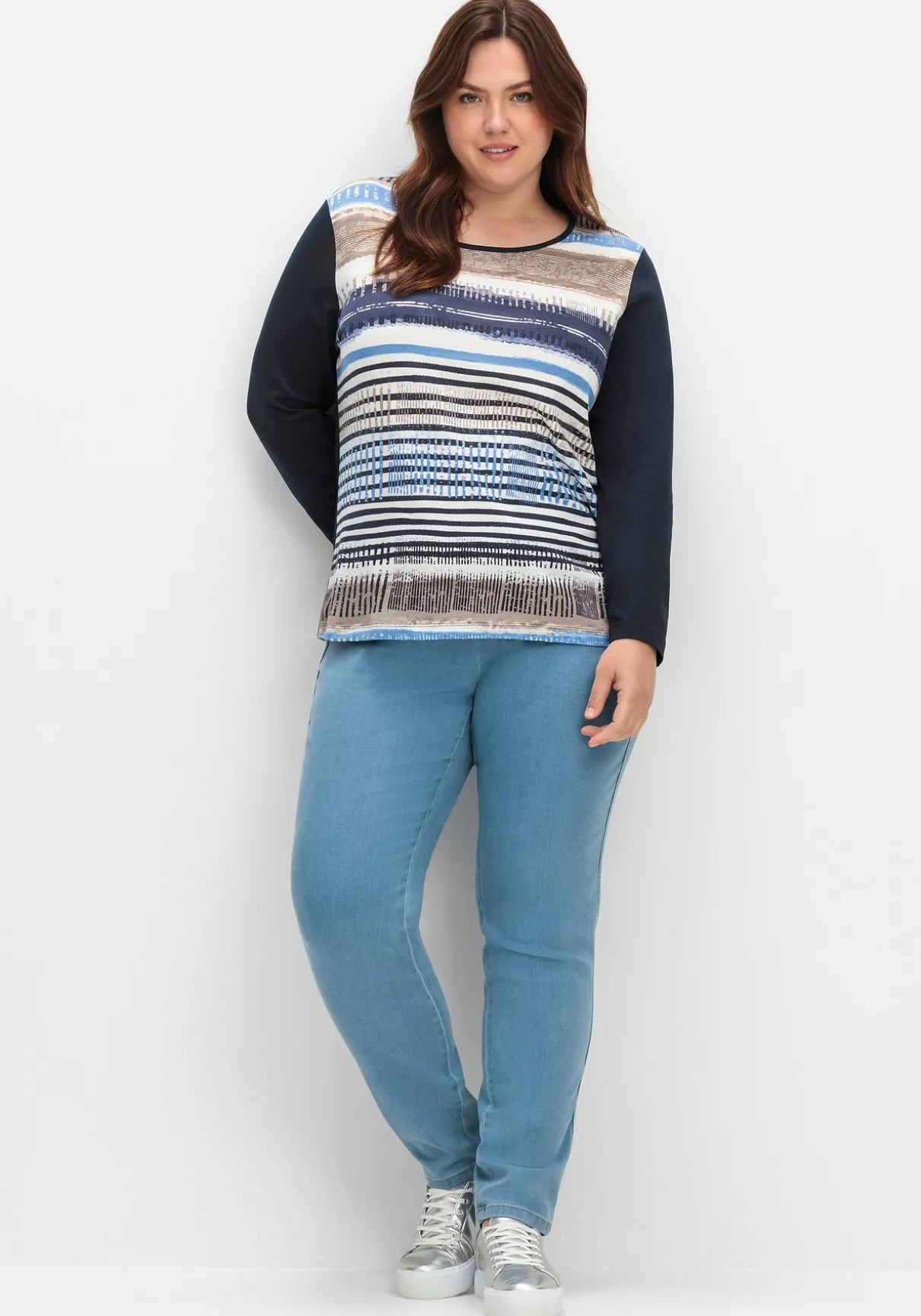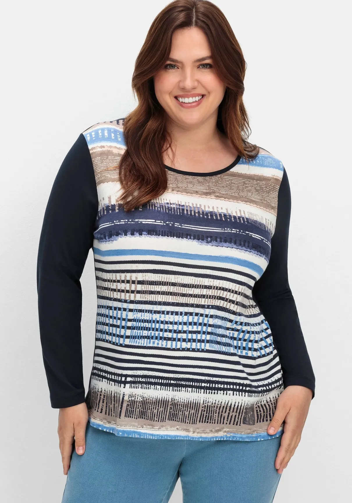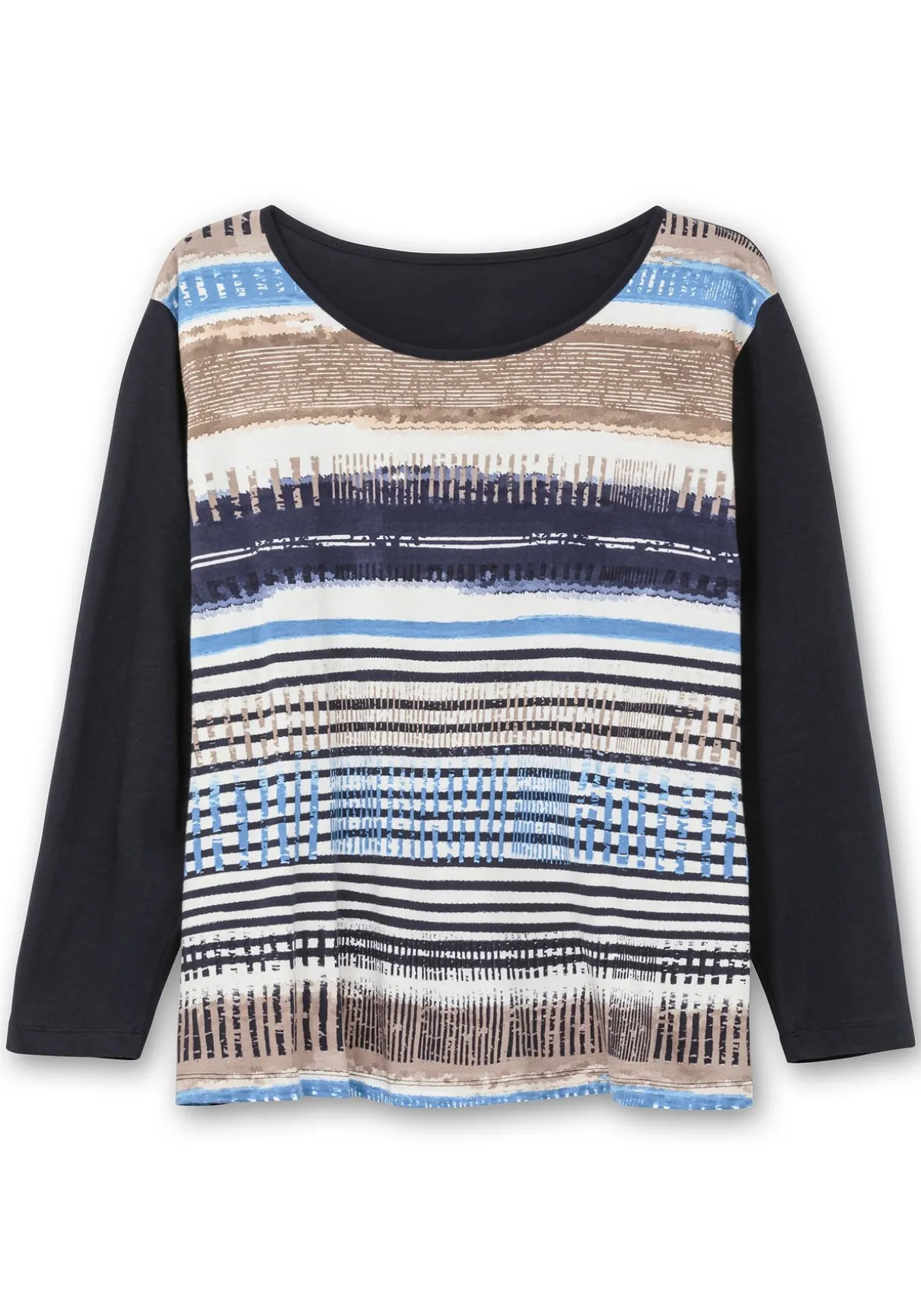Langarmshirt mit Rundhalsausschnitt. Eyecatcher ist das attraktive Streifenmuster vorn auf dem Body, das aus jedem Teil ein Unikat macht. Die unifarbenen Ärmel setzen sich davon kontraststark ab.