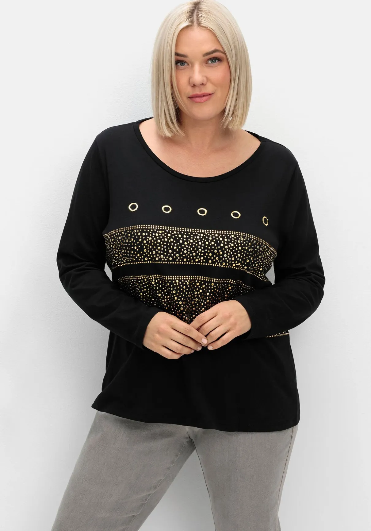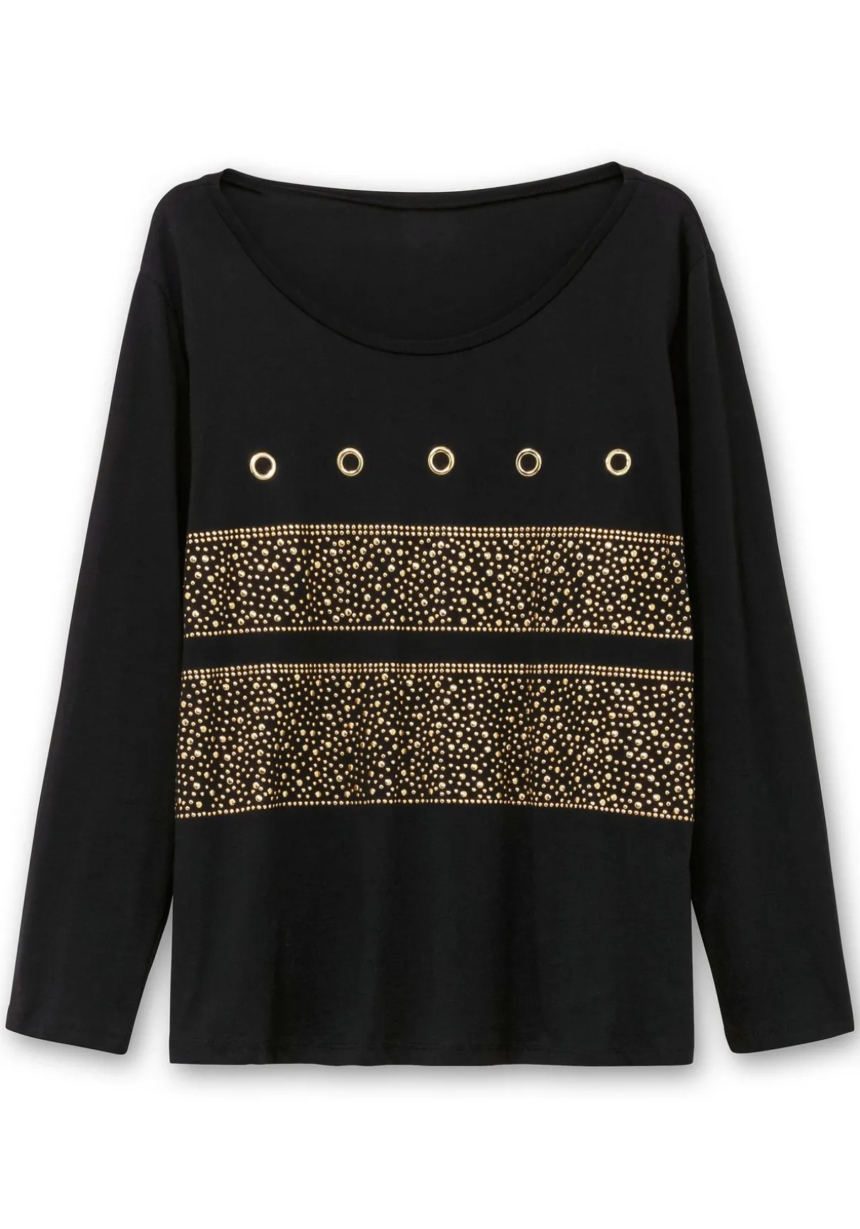 Langarmshirt mit etwas weiter gefasstem Rundhalsausschnitt. Während auf der Vorderseite zahlreiche dekorative Ösen und funkelnde Nieten für Glamour sorgen, zeigt sich die Rückseite schlicht und zurückhaltend. Ein Allrounder, der sich auch für die Party bestens eignet.
