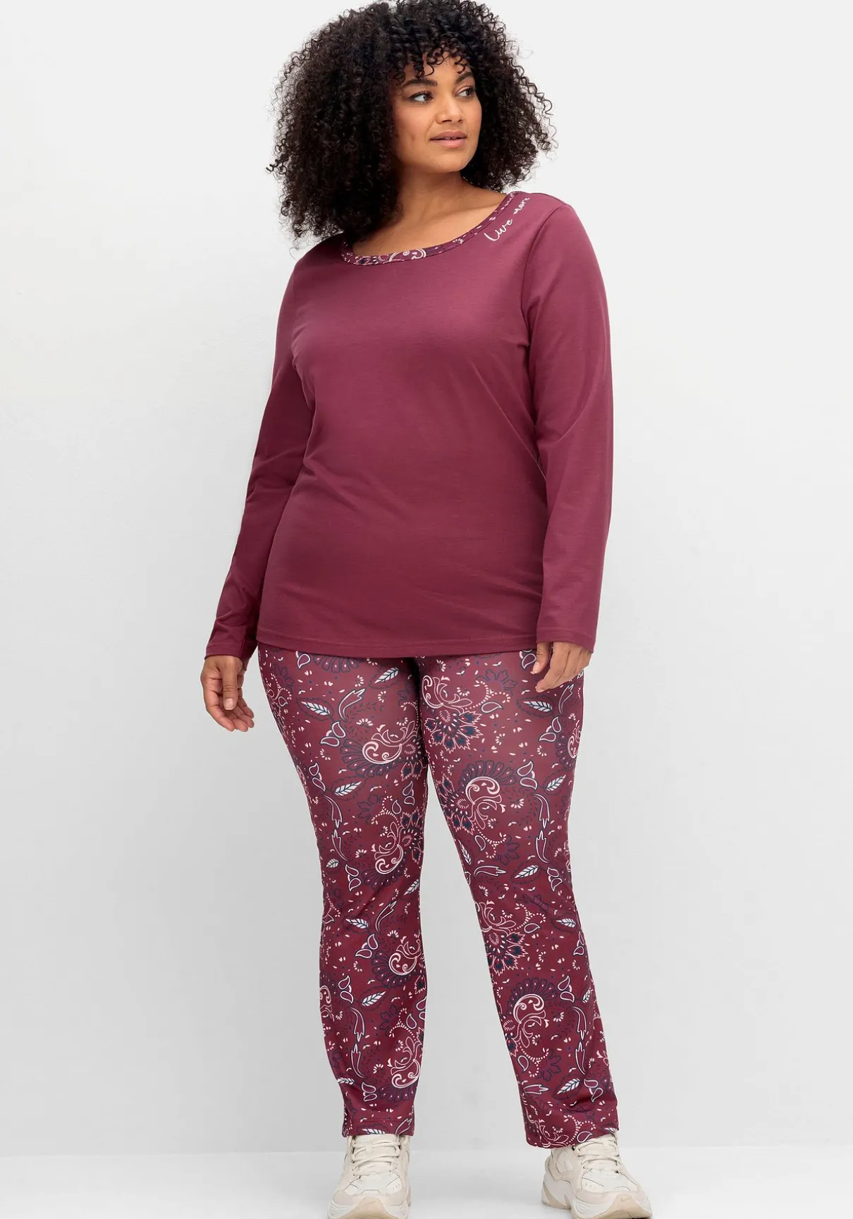 Langarmshirt von sheego by Joe Browns, mit bedrucktem Rundhals vorn. Hinten überrascht ein bedruckter, tieferer V-Ausschnitt, gekreuzte Bänder schmücken dekorativ die Rückenpartie. Ein Stickerei-Schriftzug setzt zusätzlich einen kontrastfarbenen Akzent. Mit passender Paisley-Hose aus unserer Homewear Kollektion macht den Loungewear-Look komplett.