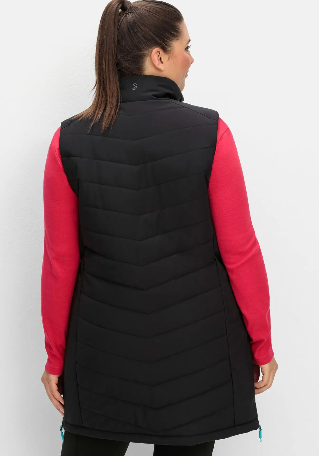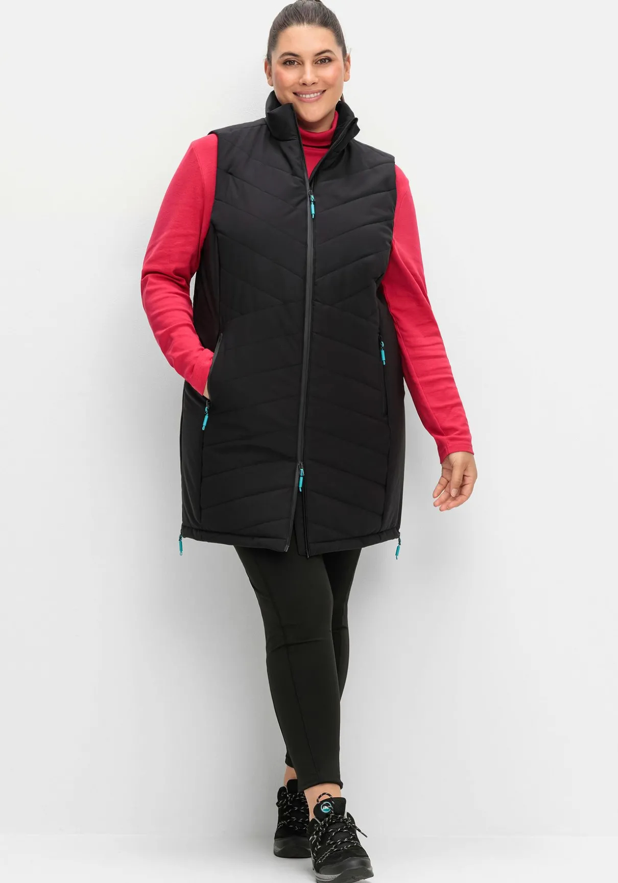 Diese Weste in Longform eignet sich für jeden Figurtyp. Wer mehr Weite und Bewegungsfreiheit sucht, kann den 2-Wege-Reißverschluss von unten und die Reißverschlüsse in den Seiten öffnen.