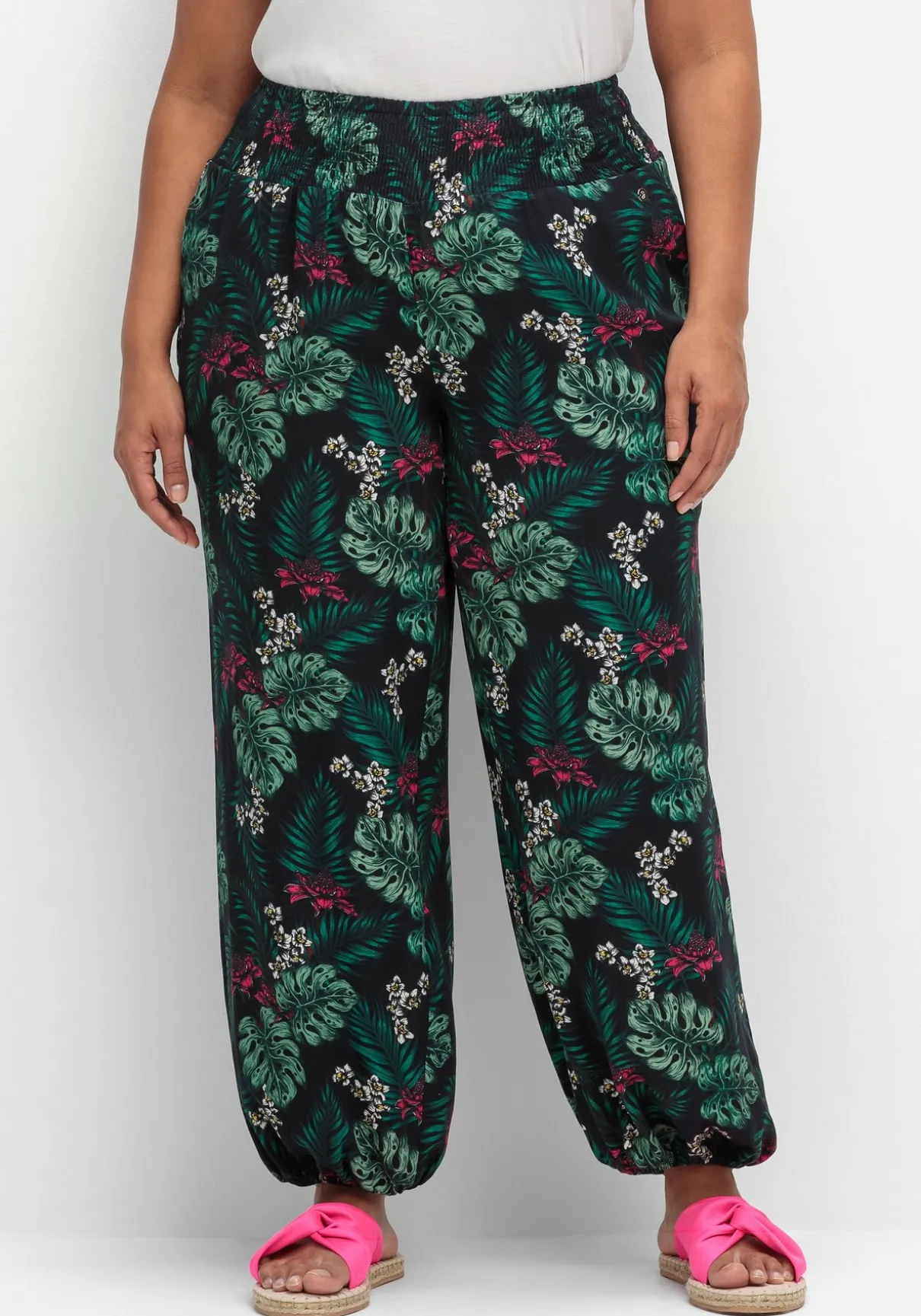 Lange Strandhose mit breitem, elastischem Smokbund. Der tropische Print sorgt für eine sommerliche Optik. In die Seiten sind praktische Eingrifftaschen eingefasst. Elastische Gummizugbündchen an den Beinabschlüssen sorgen für eine sportive Note.
