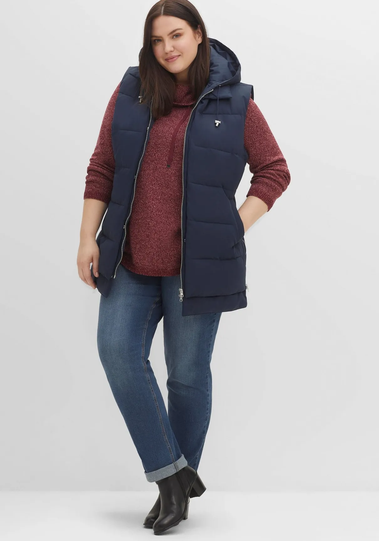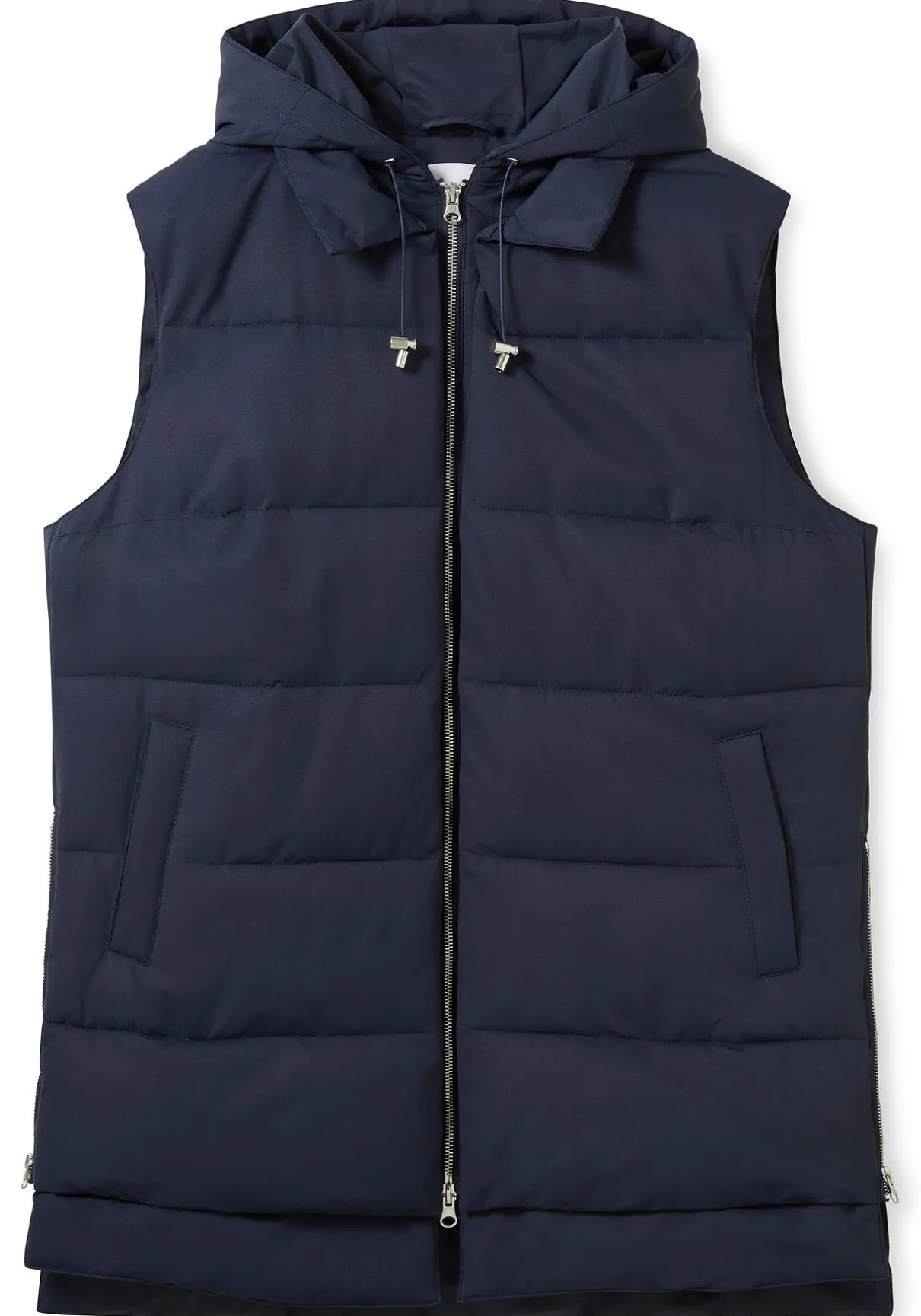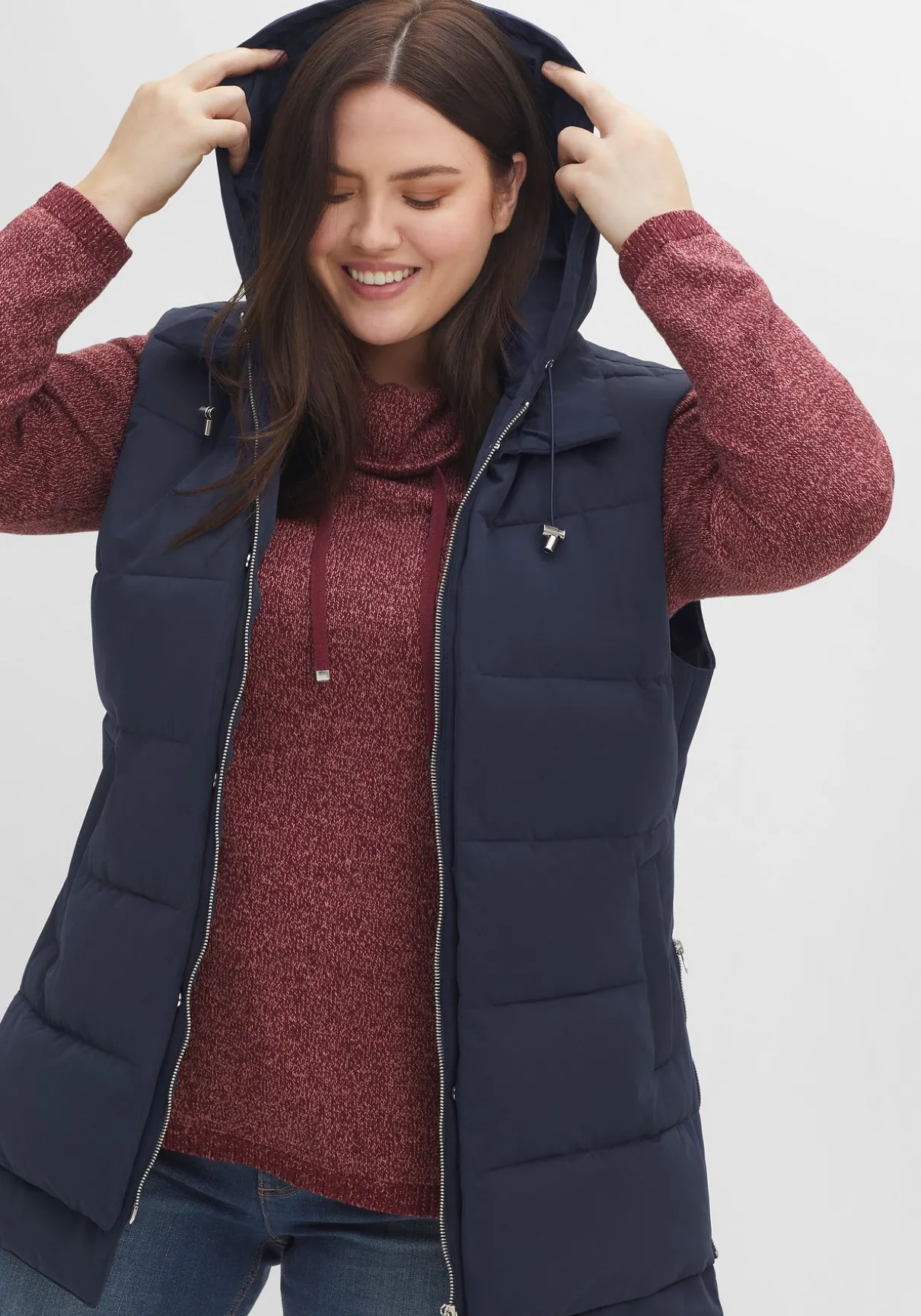 Steppweste im Lagenlook. Die modische Weste zeigt sich mit Kapuze und Bindeband, Eingrifftaschen und praktischem 2-Wege-Reißverschluss. Auch die beiden seitlichen Reißverschlüsse dienen nicht nur als modisches Detail, sondern verleihen dem Schnitt zusätzlich mehr Weite im Hüftbereich. Der doppellagig gearbeitete Saum lässt die legere Double-Layer-Optik entstehen.
