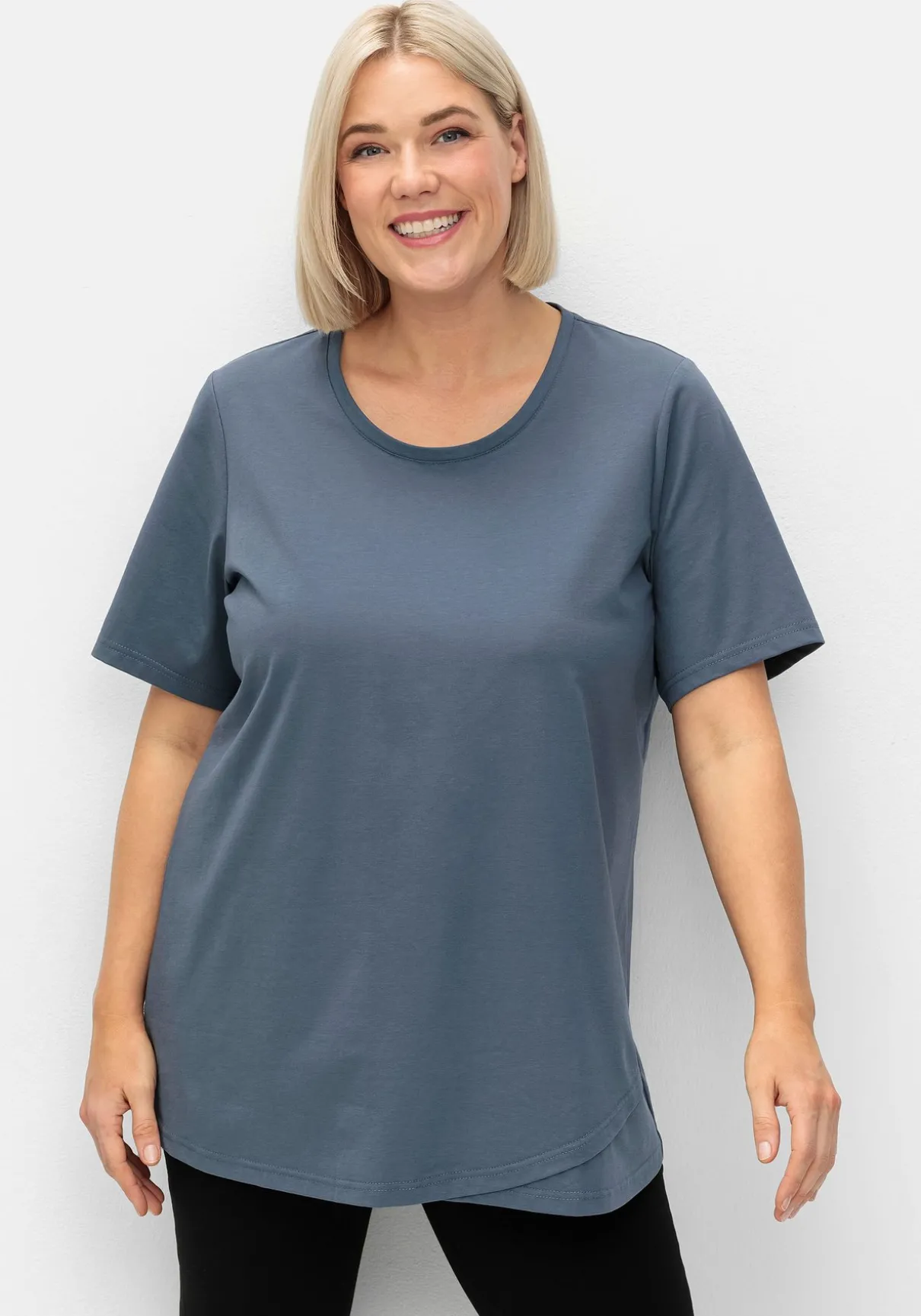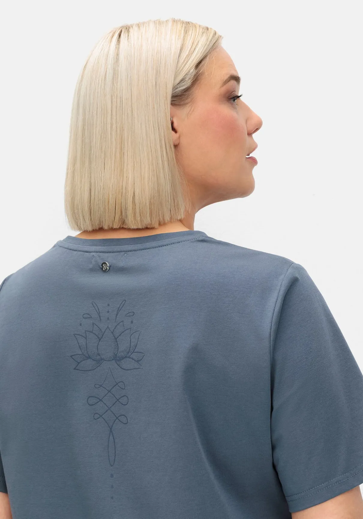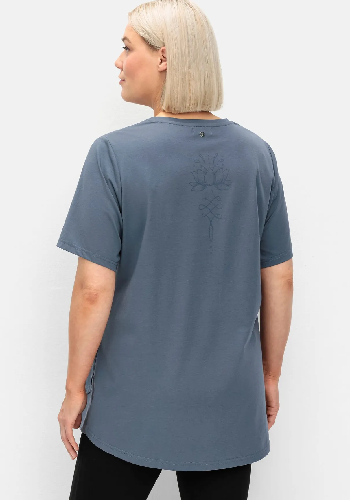 Yogashirt in Longform. Der gerundete, in Lagenoptik gestaltete Saum und der dezente Lotusdruck auf dem Rücken sorgen für den besonderen Look. Dazu kommen ein klassischer Rundhalsausschnitt und die kurzen Ärmel. Die lange Form mit leicht verlängerter Rückenpartie sitzt angenehm locker, macht jede Bewegung mit und lässt sich perfekt zu schmalen Sporthosen kombinieren.